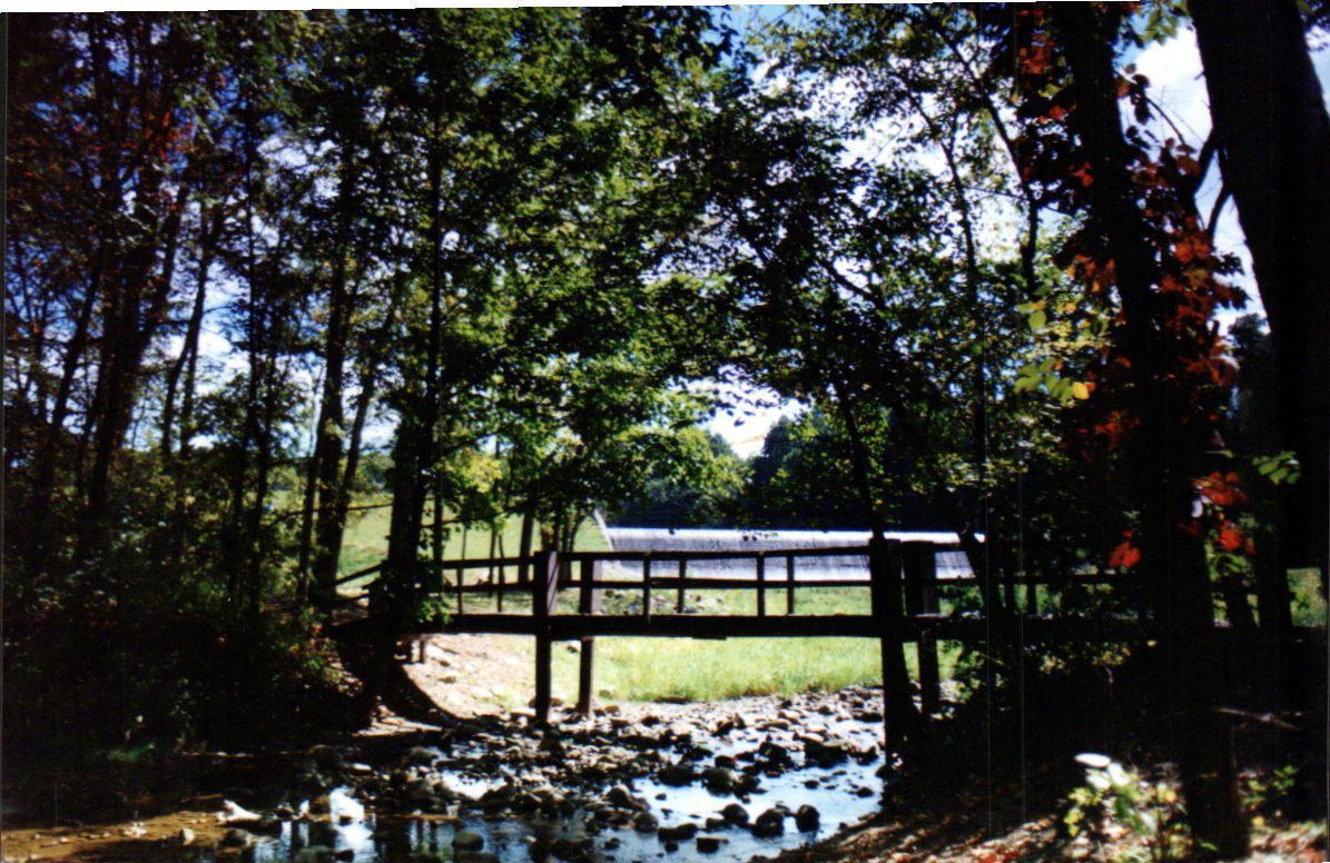 A tranquil summer scene depicting the footbridge that crosses Sam's Creek on a sunny day. In this photograph's background, water surges over Mount Gilead Lake Dam.