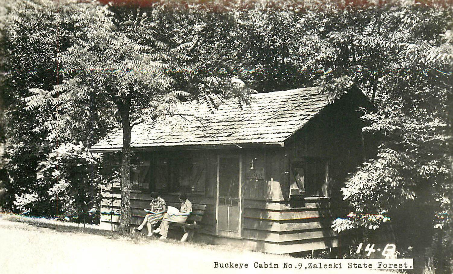 Two guests relax in the shade outside of one of the many cabins located at Lake Hope State Park. Although Lake Hope lacks an overnight lodge, it has cabins for lodgers. All of Lake Hope State Park was once part of the Zaleski State Forest. Today, the Zaleski State Forest surrounds Lake Hope State Park.