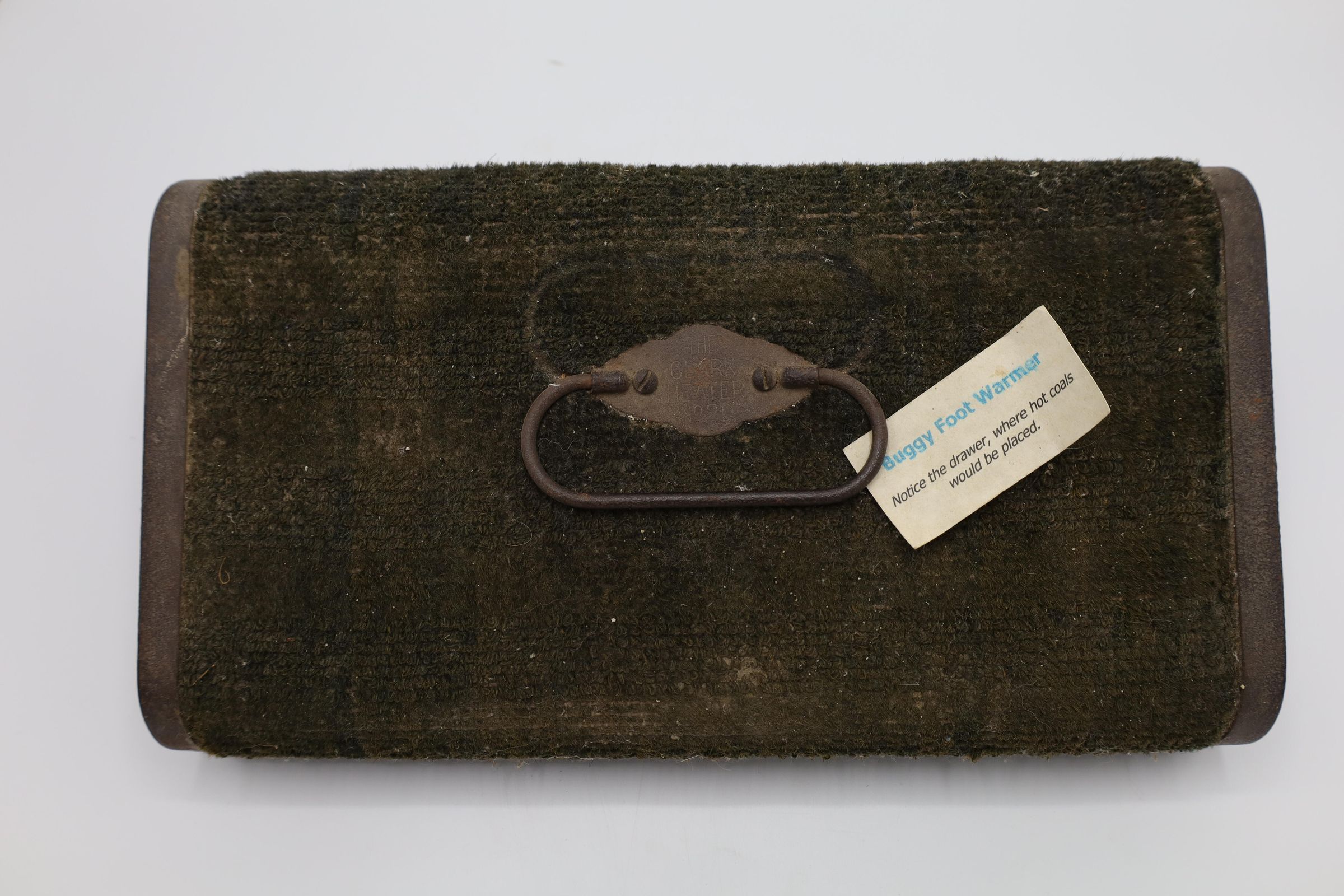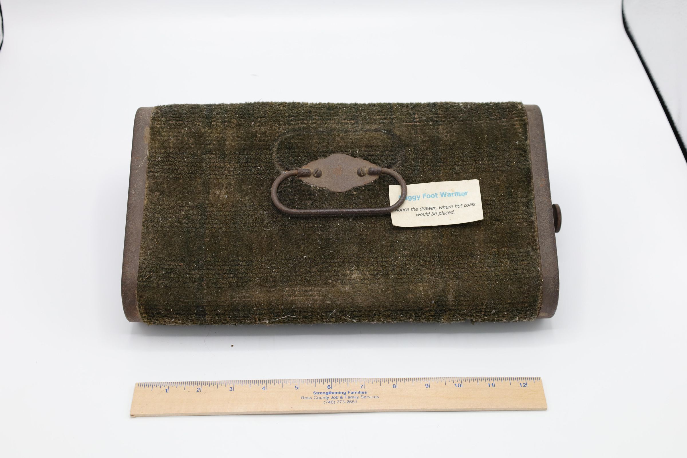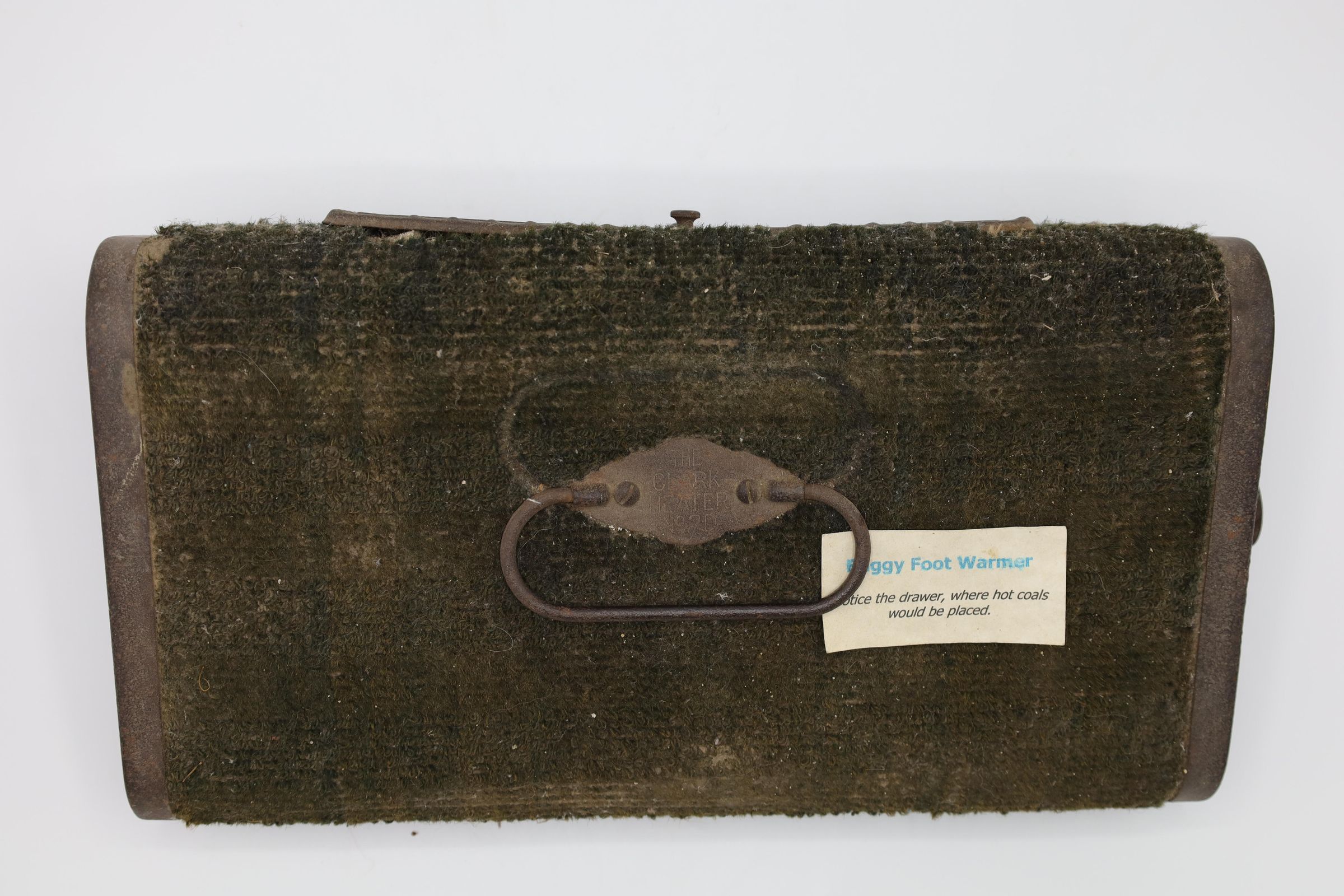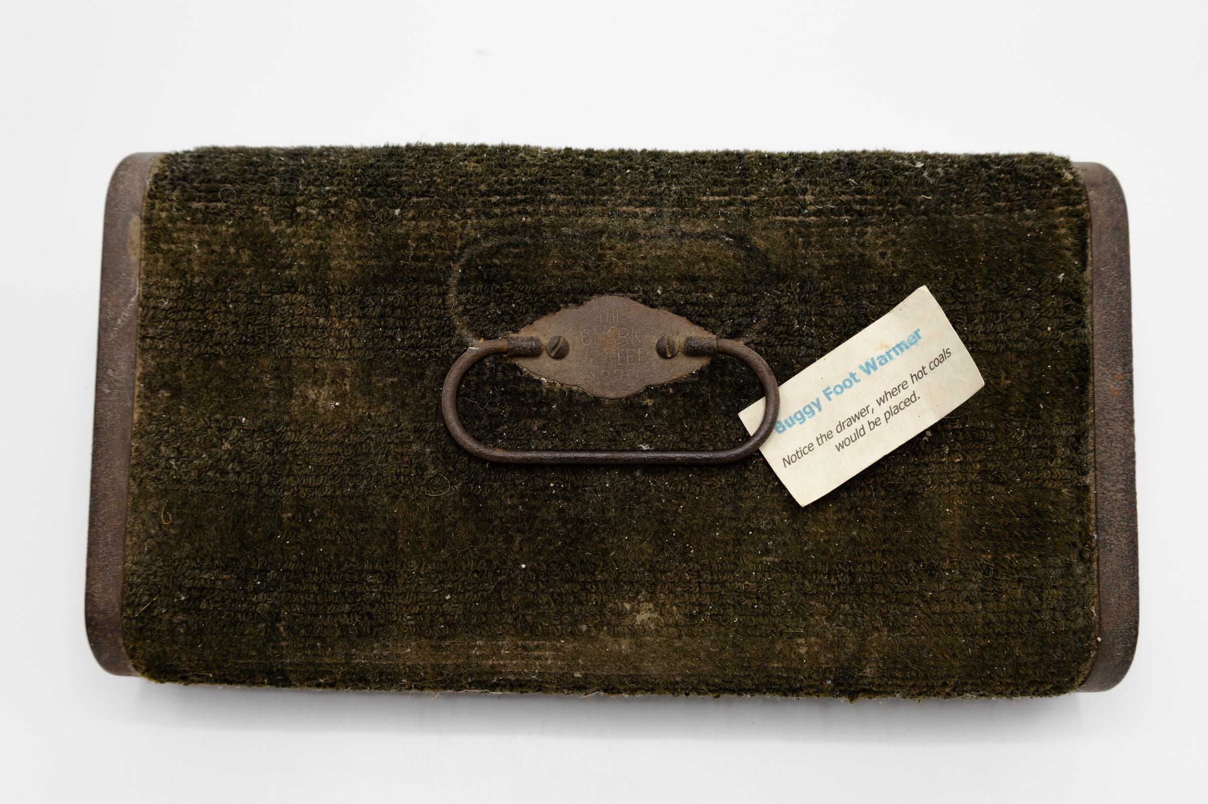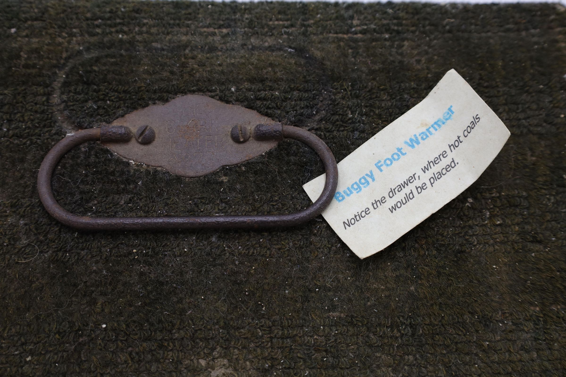 This is a Clark Carriage Heater, No 7D, a popular style of carriage heater used in the early 20th century. In cold weather, buggy drivers and riders would use these buggy foot warmers under their feet during travel. Charcoal briquettes or carbon fuel bricks were used in the sliding drawer. They most likely used Clark Coal which was sold from the same company, the Sterk MFG Co. established by Stewart and Clark in 1905.Location