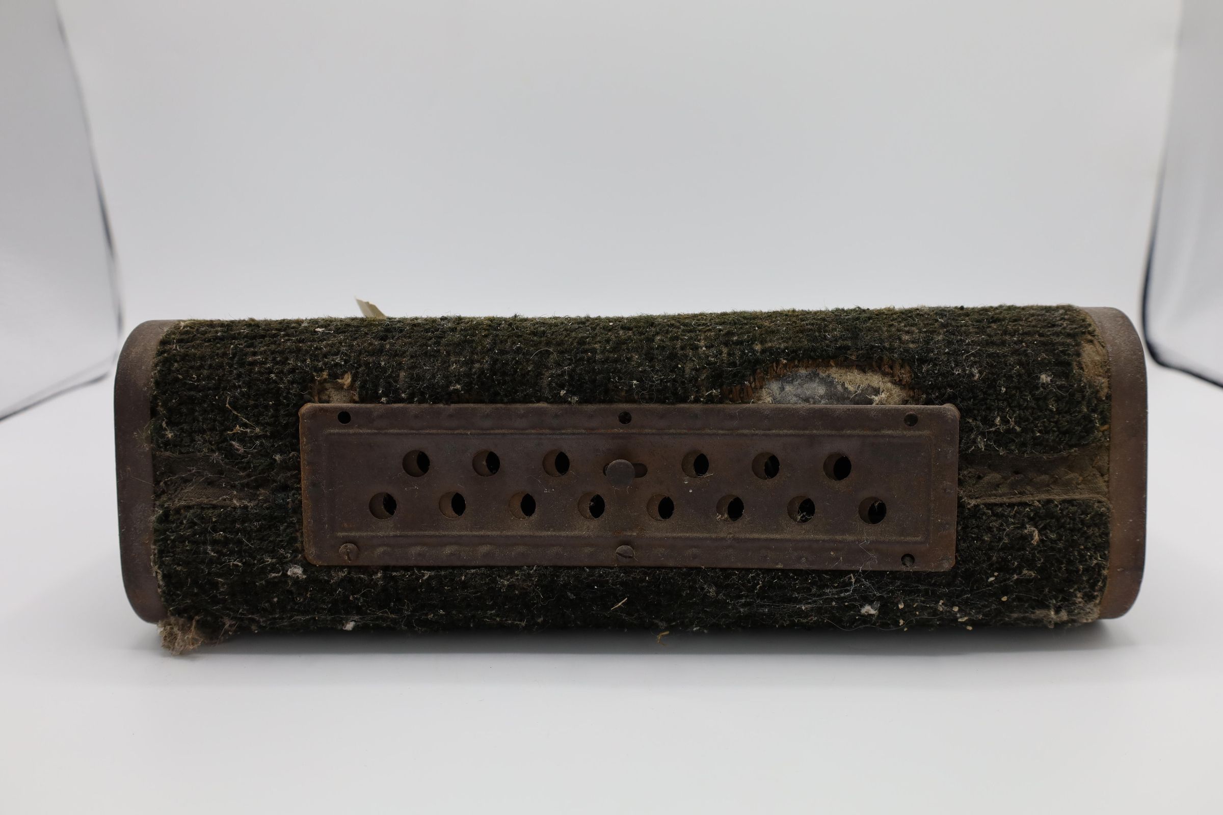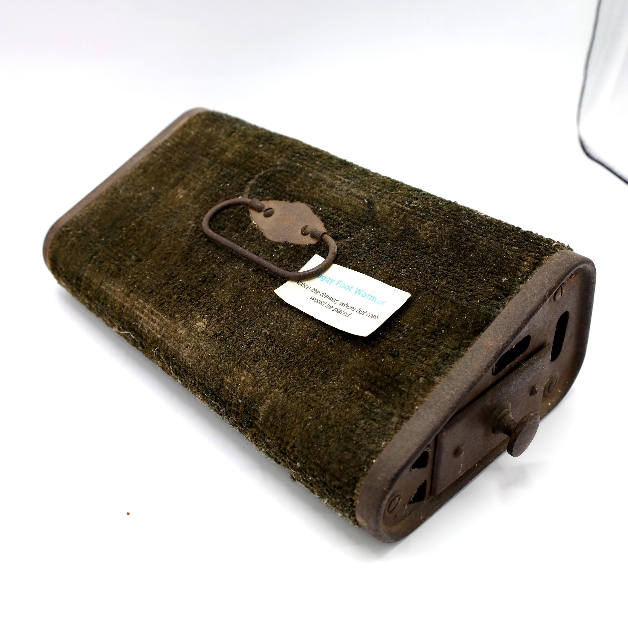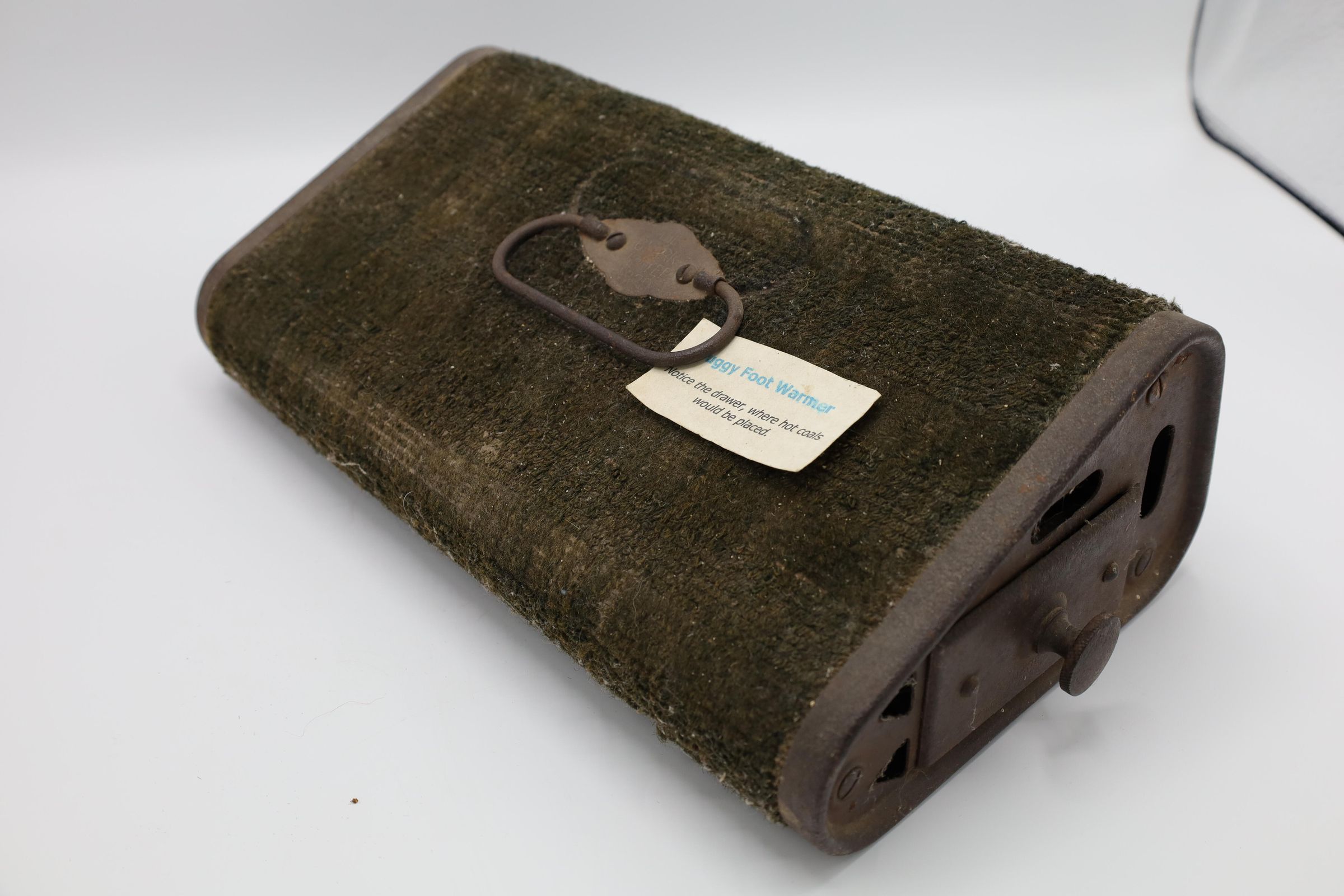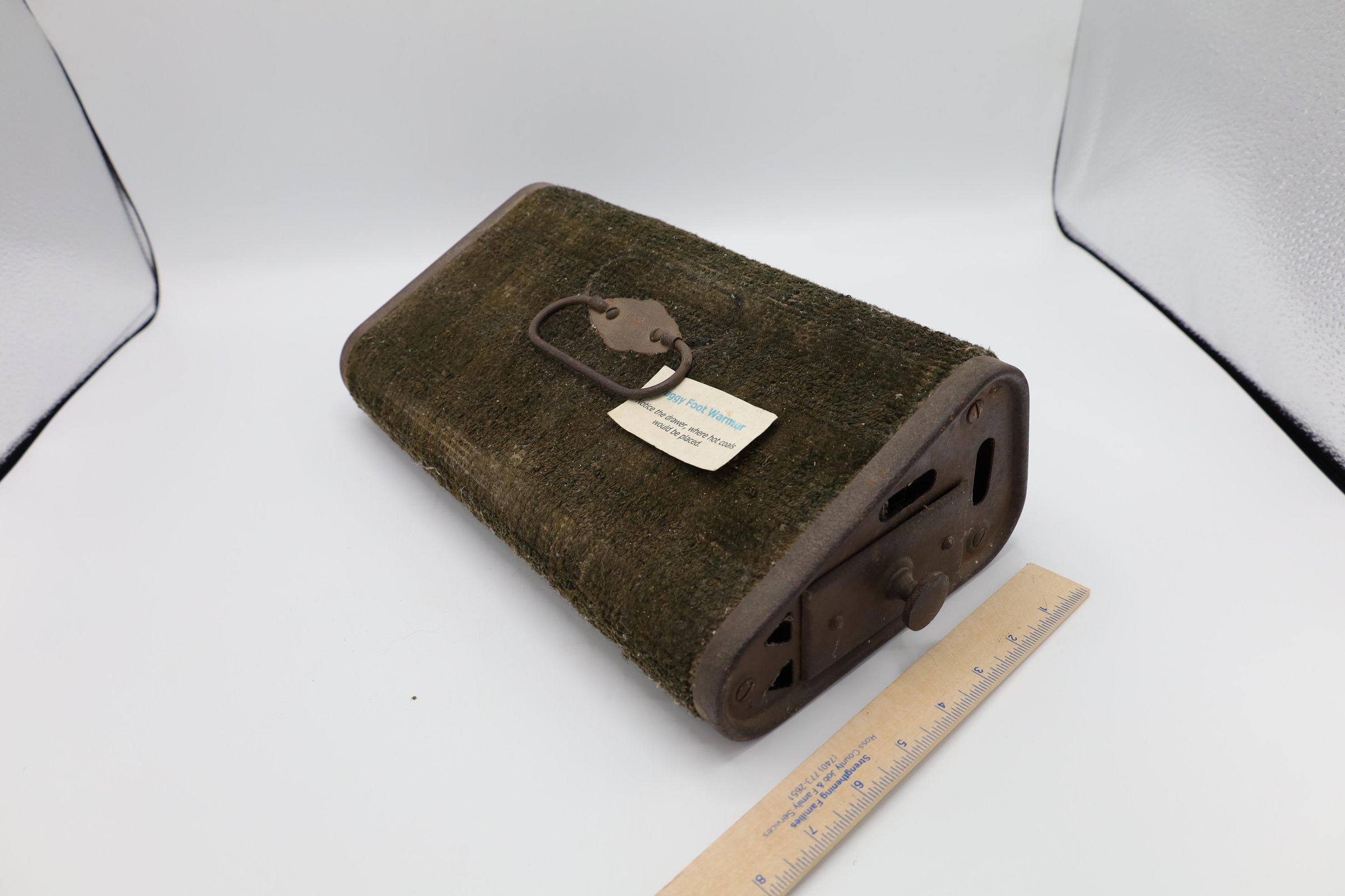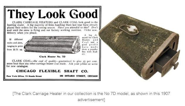 This is a Clark Carriage Heater, No 7D, a popular style of carriage heater used in the early 20th century. In cold weather, buggy drivers and riders would use these buggy foot warmers under their feet during travel. Charcoal briquettes or carbon fuel bricks were used in the sliding drawer. They most likely used Clark Coal which was sold from the same company, the Sterk MFG Co. established by Stewart and Clark in 1905.Location