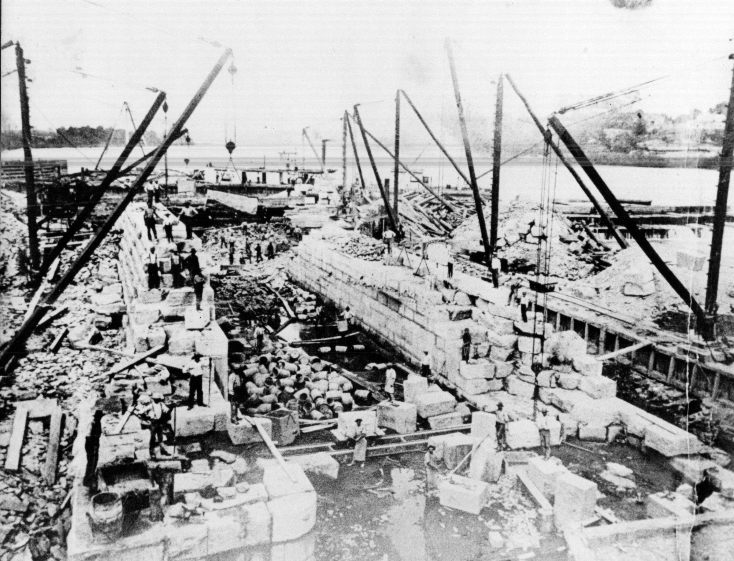 Scores of men and machinery work to build one of the Muskingum River's 11 locks. Note the abundant workers scattered throughout the photograph and the many cranes necessary to lift and place the large limestone or sandstone blocks.