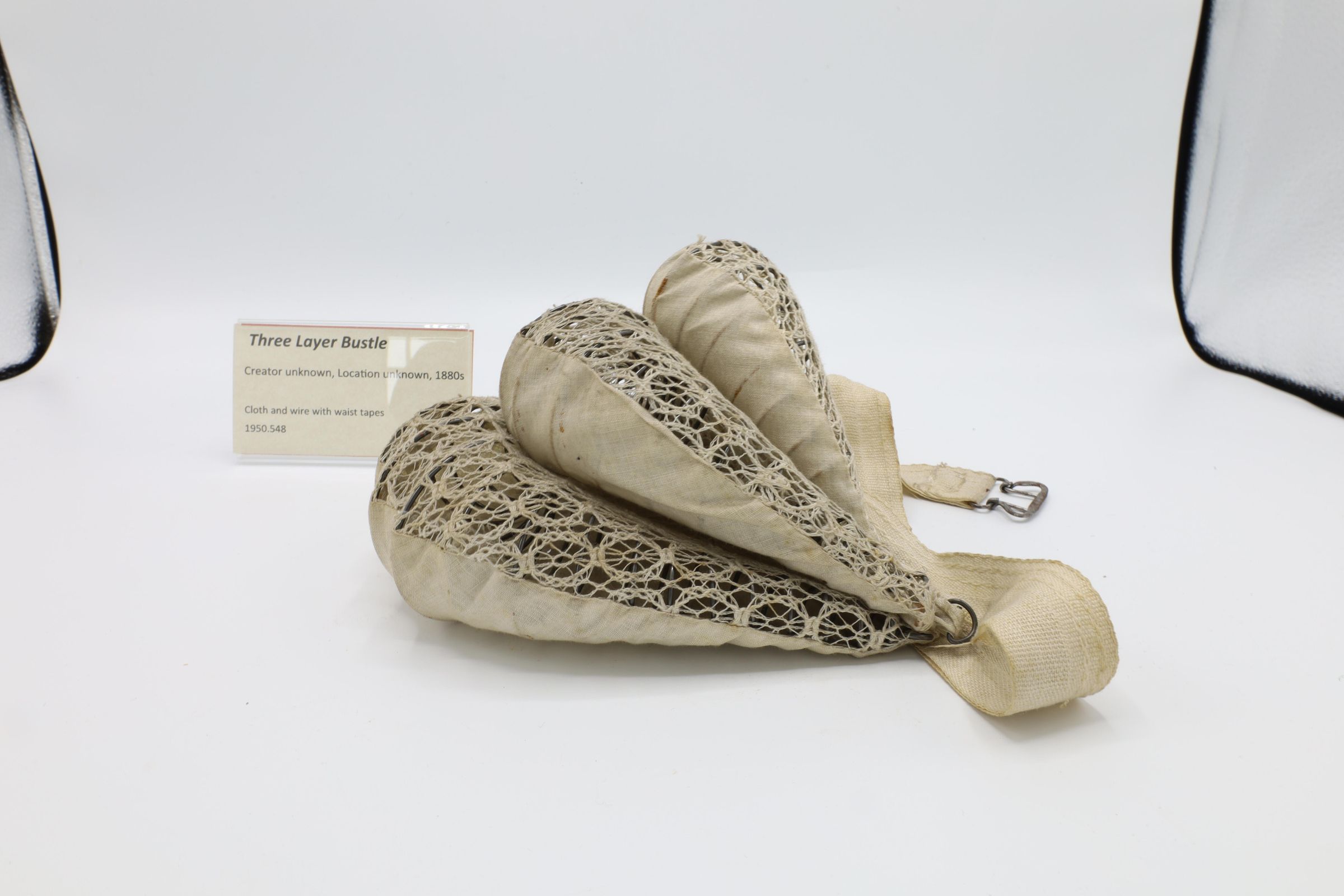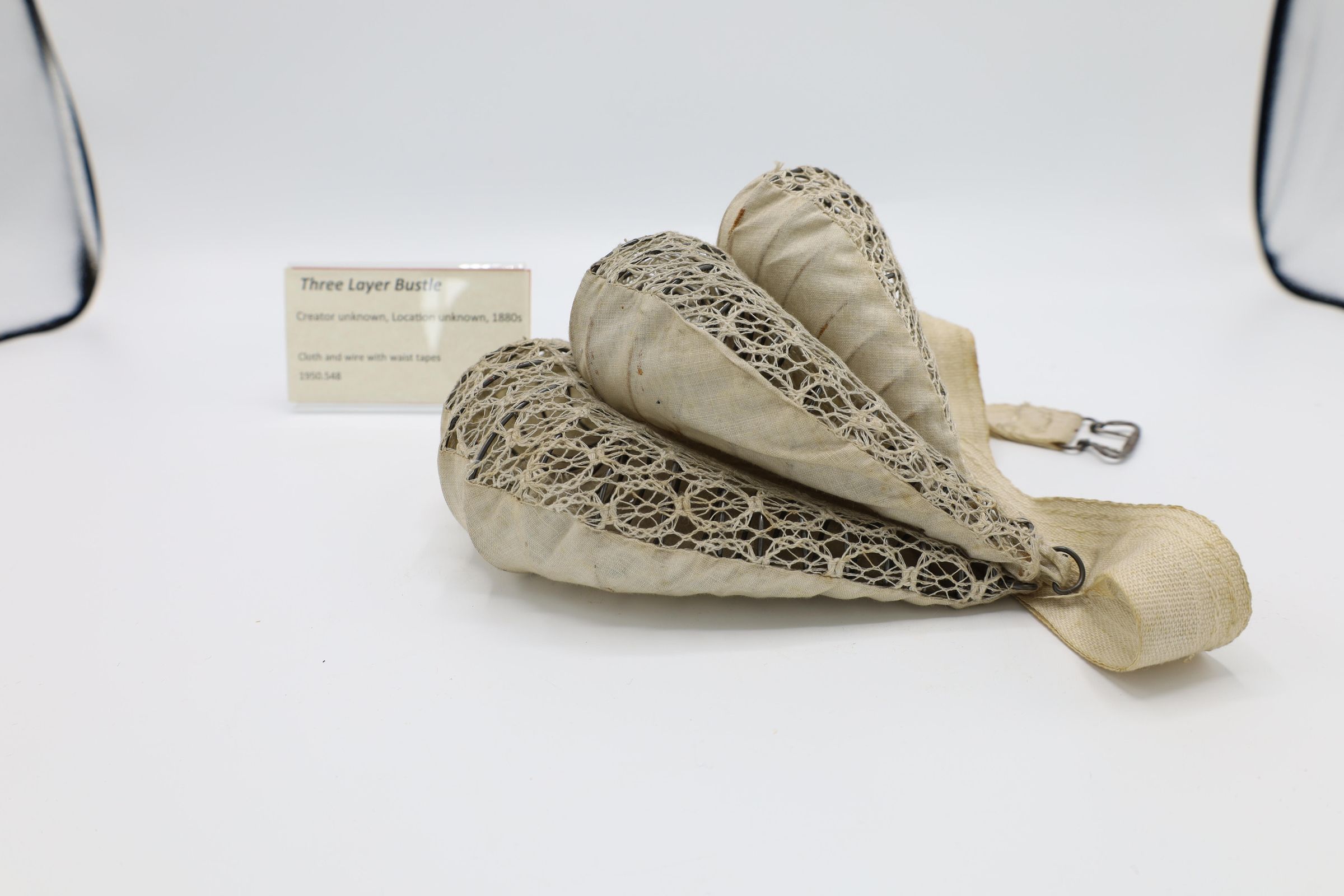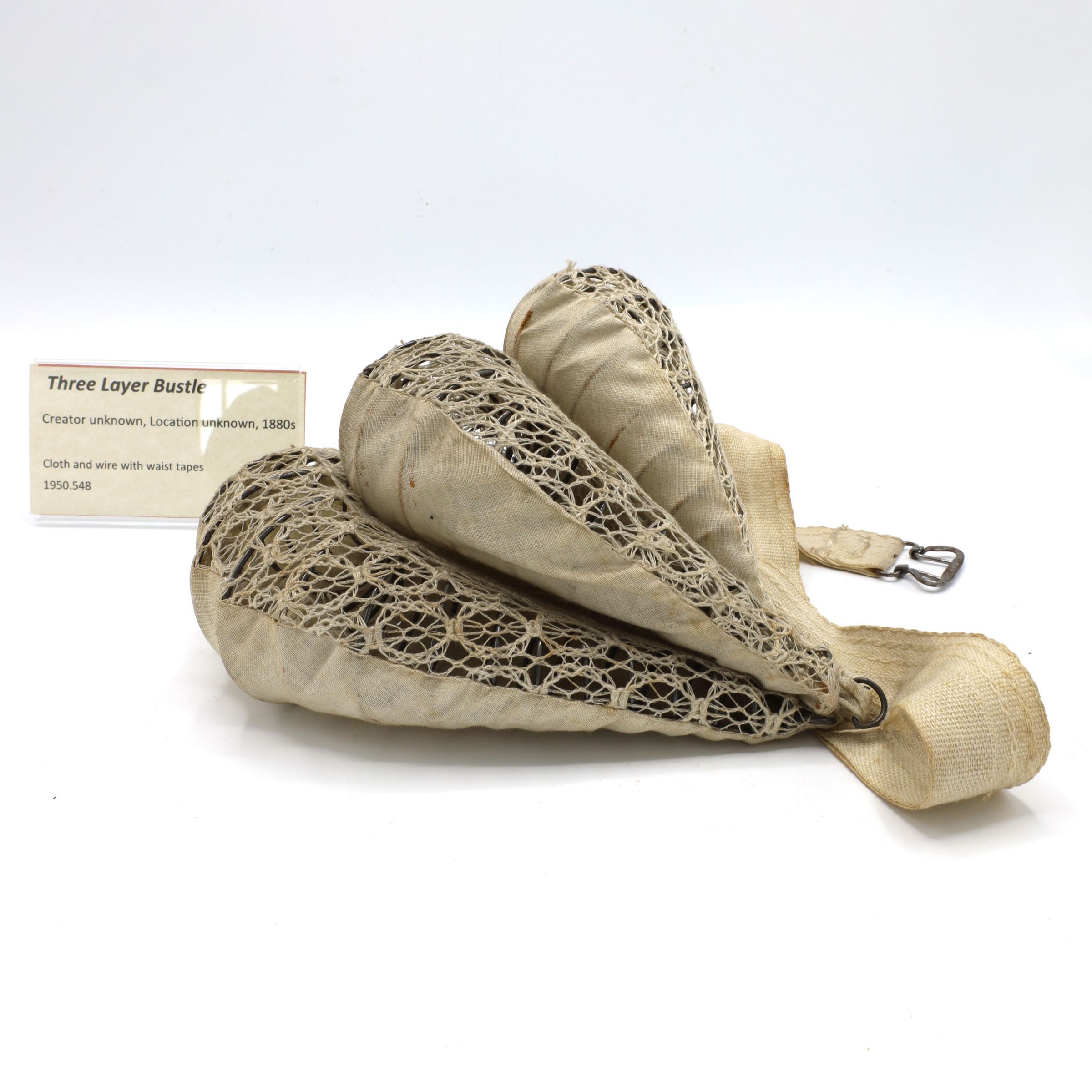 This three layer bustle, made with cloth and wire and including waist tapes, would be worn under a woman's skirts from 1880 to 1890s. These bustles were much less pronounced than some of the earlier versions, which could extend quite far behind them, and the styles themselves were simplified from the very elaborate gowns of earlier decades.Location