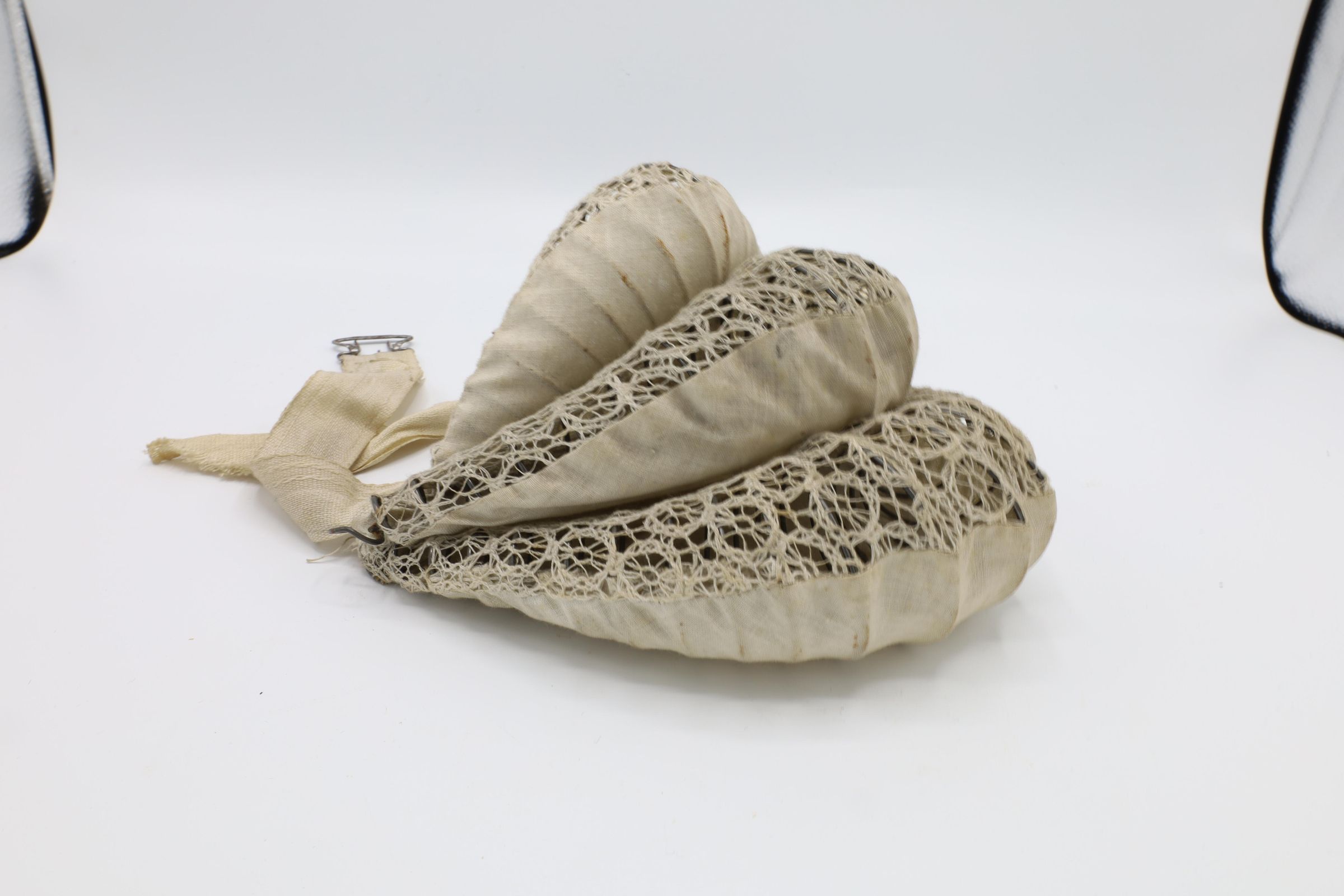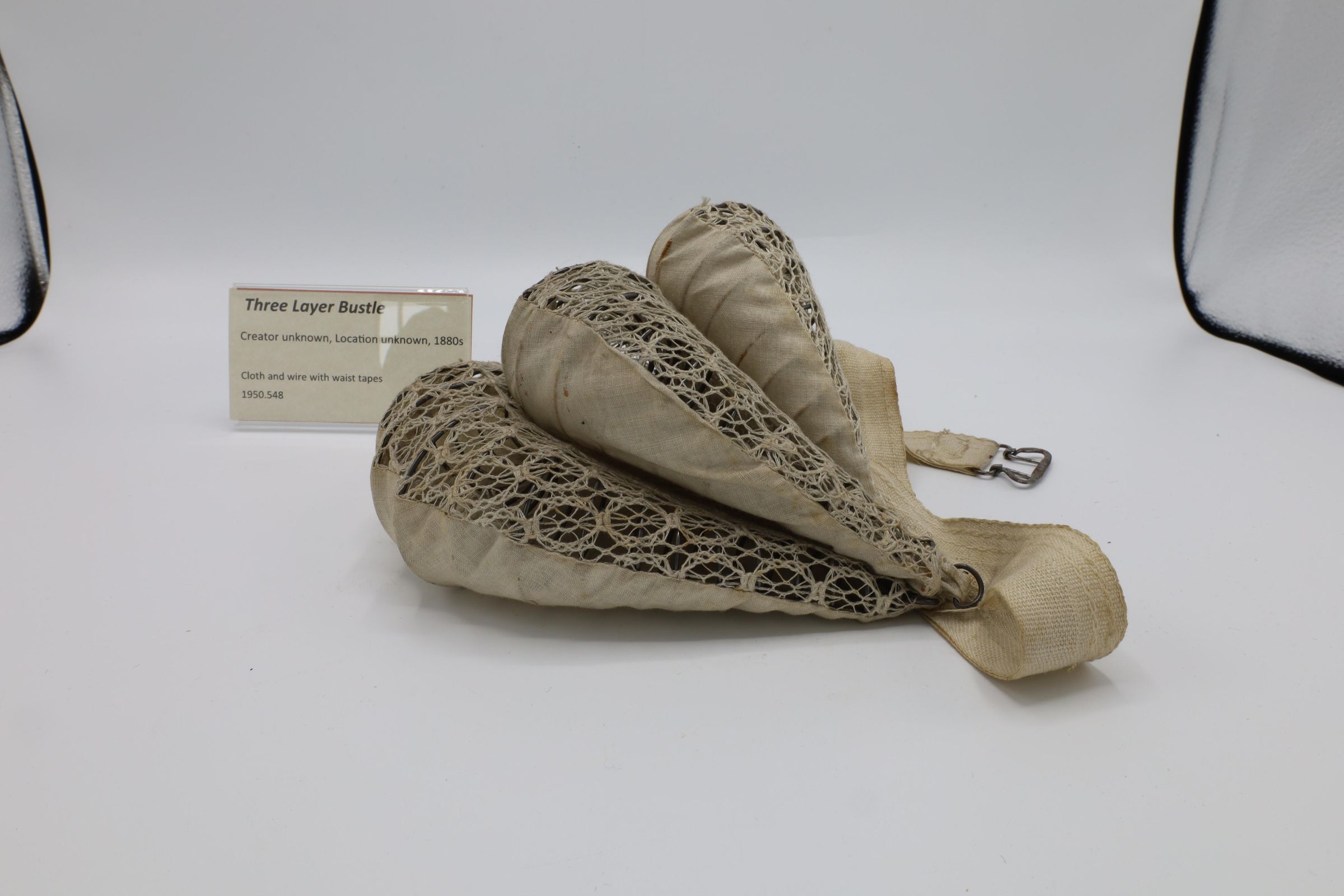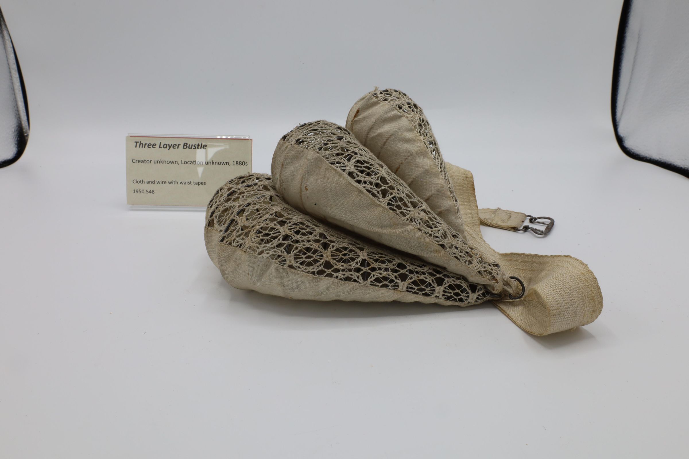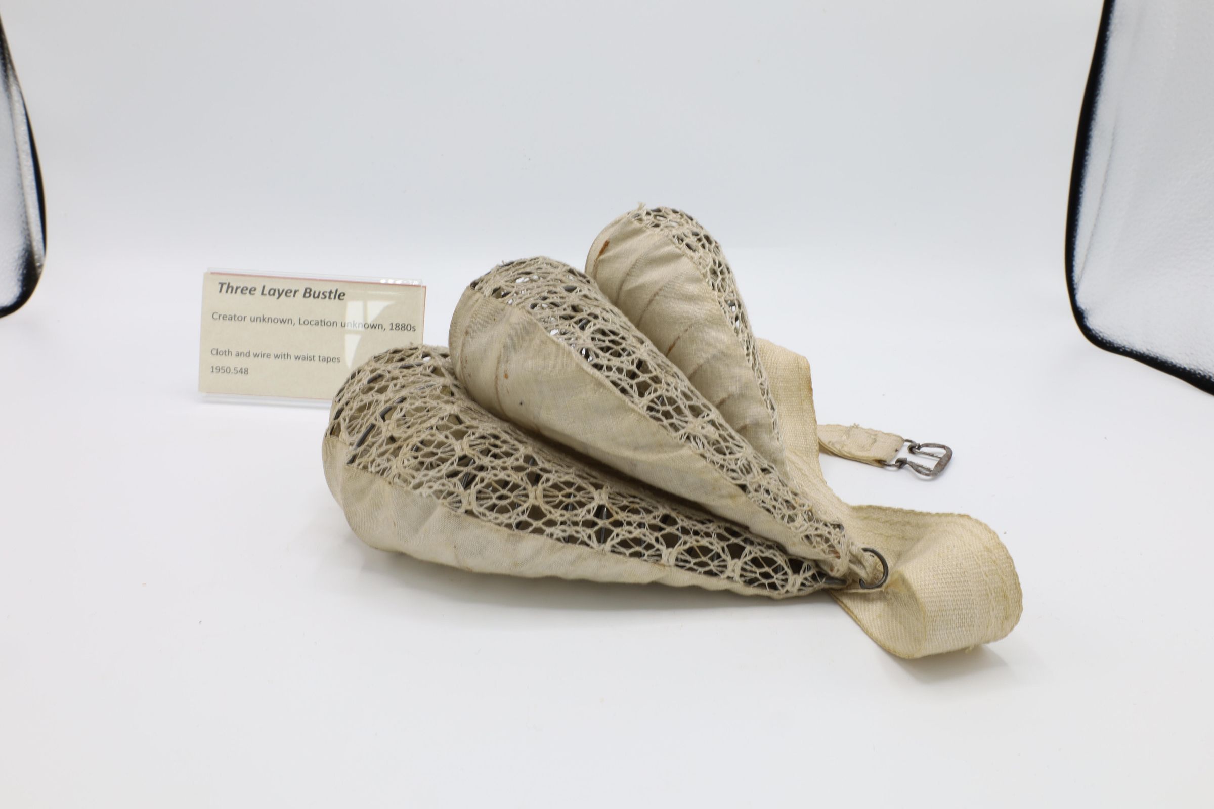 This three layer bustle, made with cloth and wire and including waist tapes, would be worn under a woman's skirts from 1880 to 1890s. These bustles were much less pronounced than some of the earlier versions, which could extend quite far behind them, and the styles themselves were simplified from the very elaborate gowns of earlier decades.Location