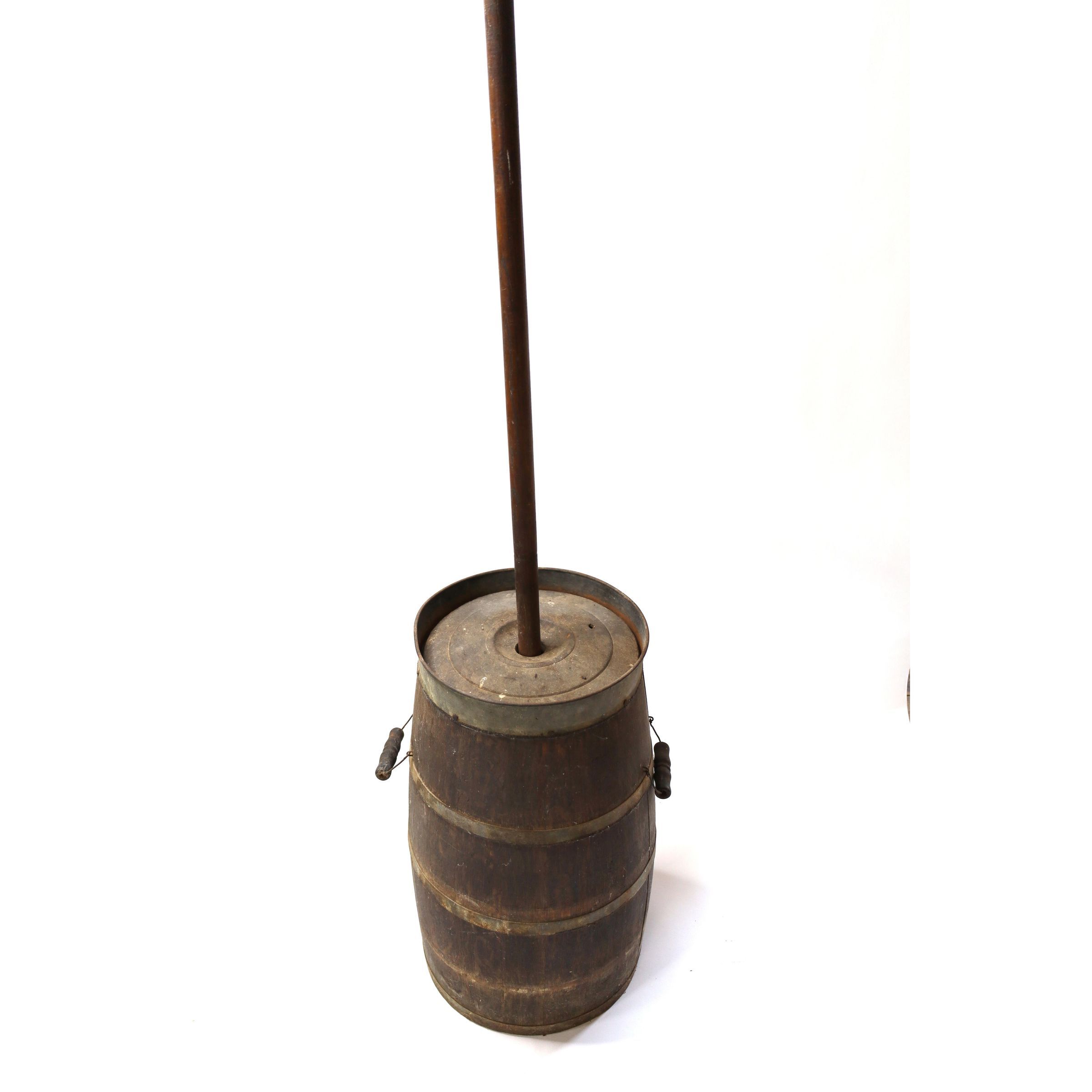 This wooden butter churn has a long wooden handle going through the top cover and a dasher at the bottom which is worked up and down inside the churn to change cream into butter.Location