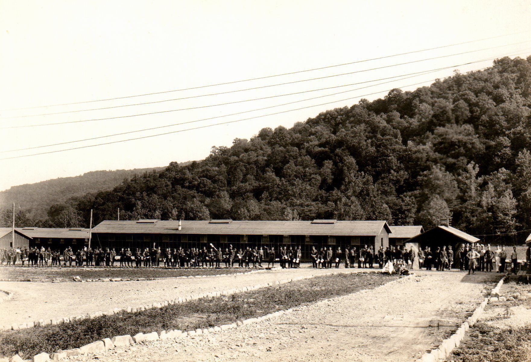 The men of Civilian Conservation Corps (CCC) Company 503-from leadership to enrollees-stand outside the barracks of Camp Pike as they ready for a group photograph. In the background, some CCC enrollees take off their caps and wave in the camera's direction.