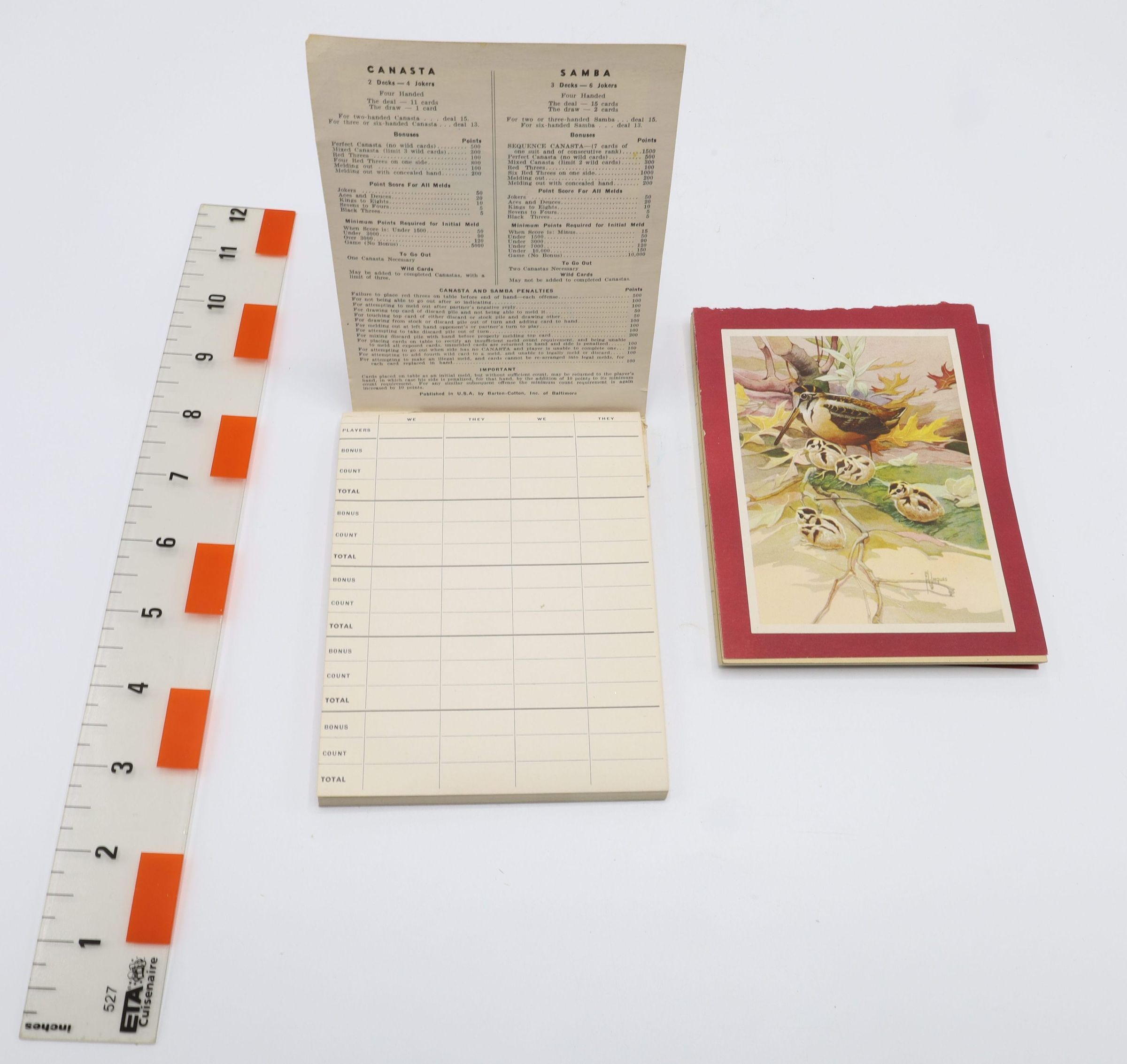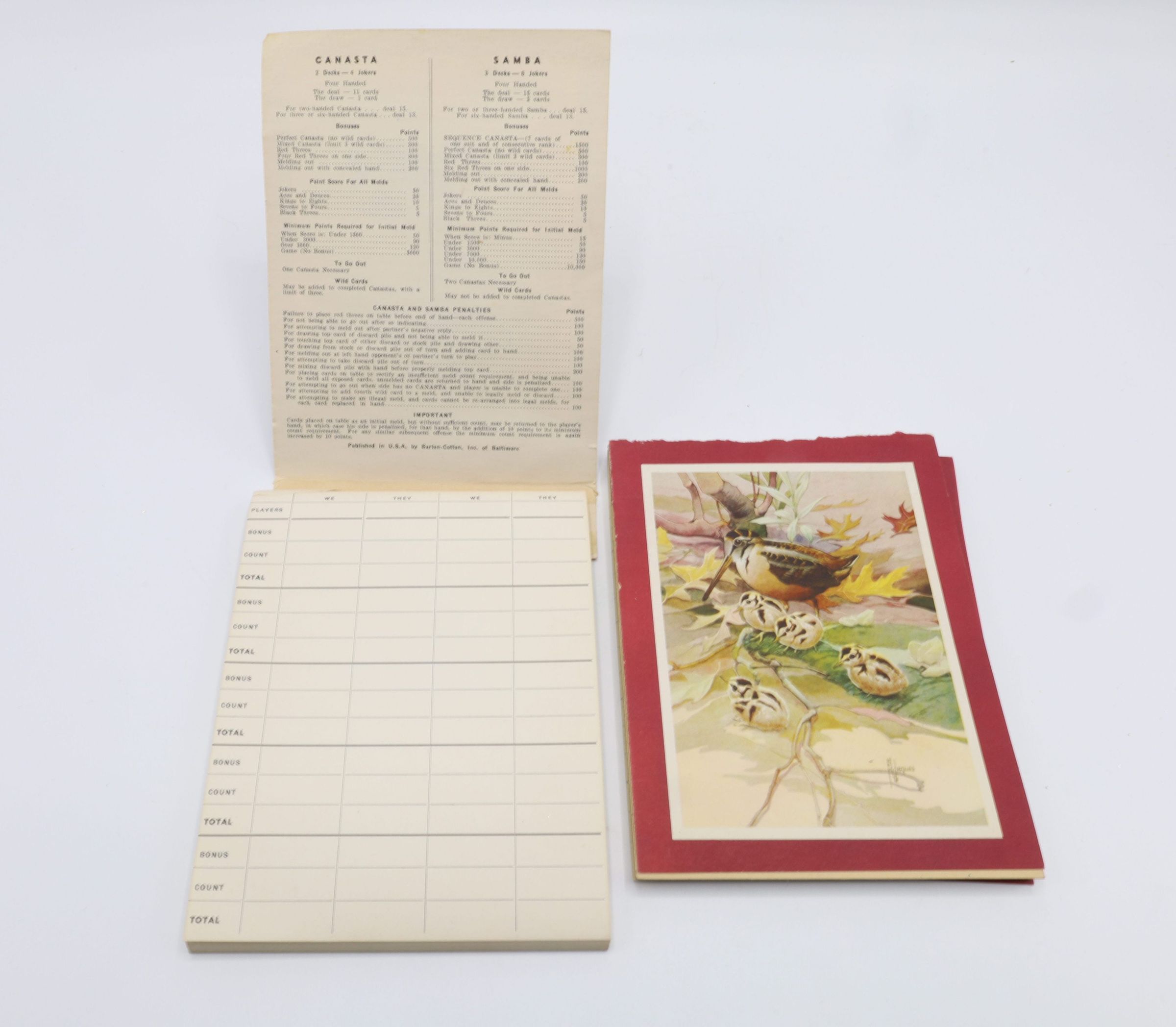This box of Canasta tally sheets includes one with a woodcock and chicks on the cover and the other with two coots and chicks on the cover. Tally sheets allow players to track scores. In Canasta, players gain points from melds, a collection of cards the same rank. In Canasta, melds are formed and added to by both partners throughout play. Points are awarded depending on the rank of the cards and the number of cards in it. A hand ends when one player discards their final card. The game ends when one team reaches 5,000 points.