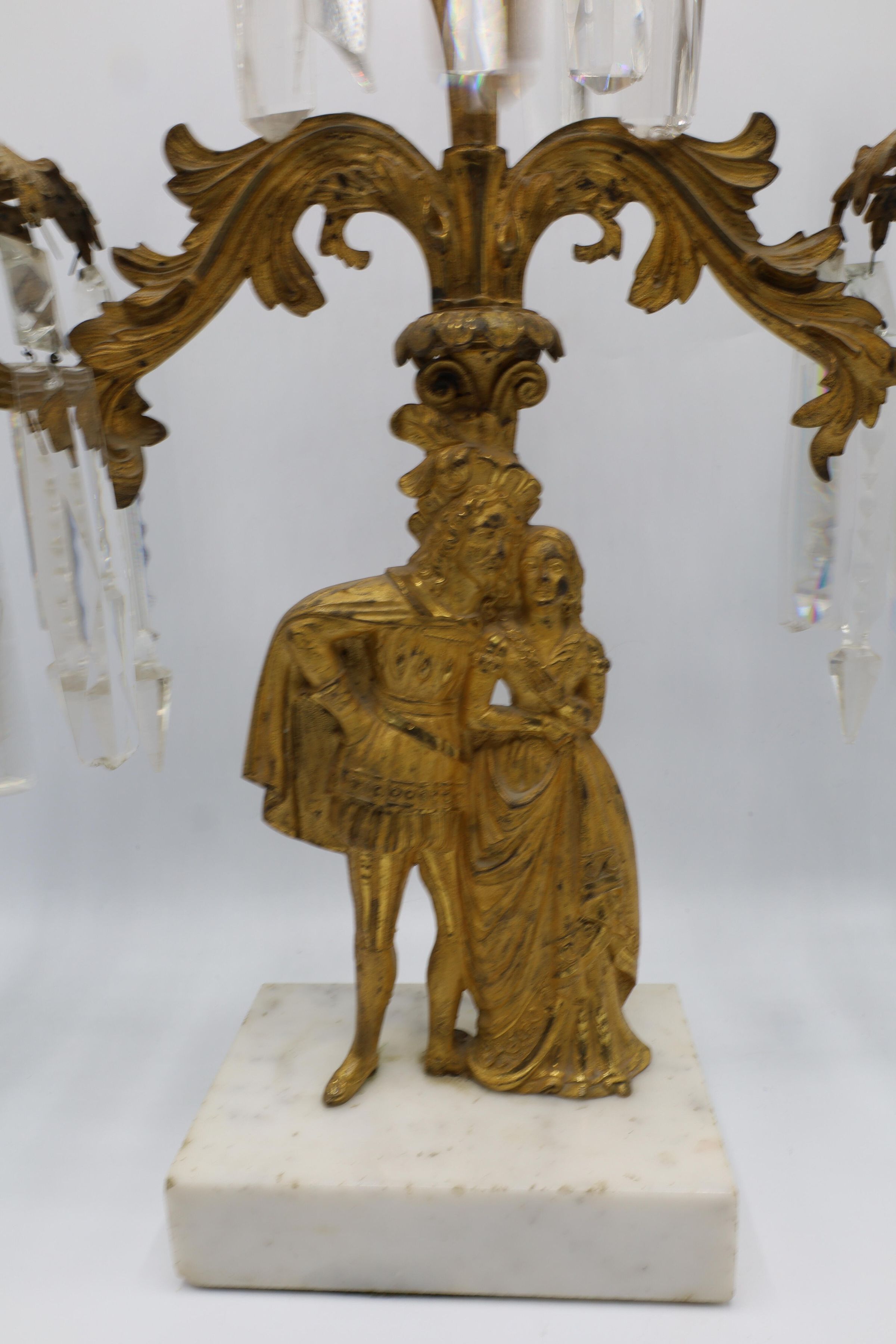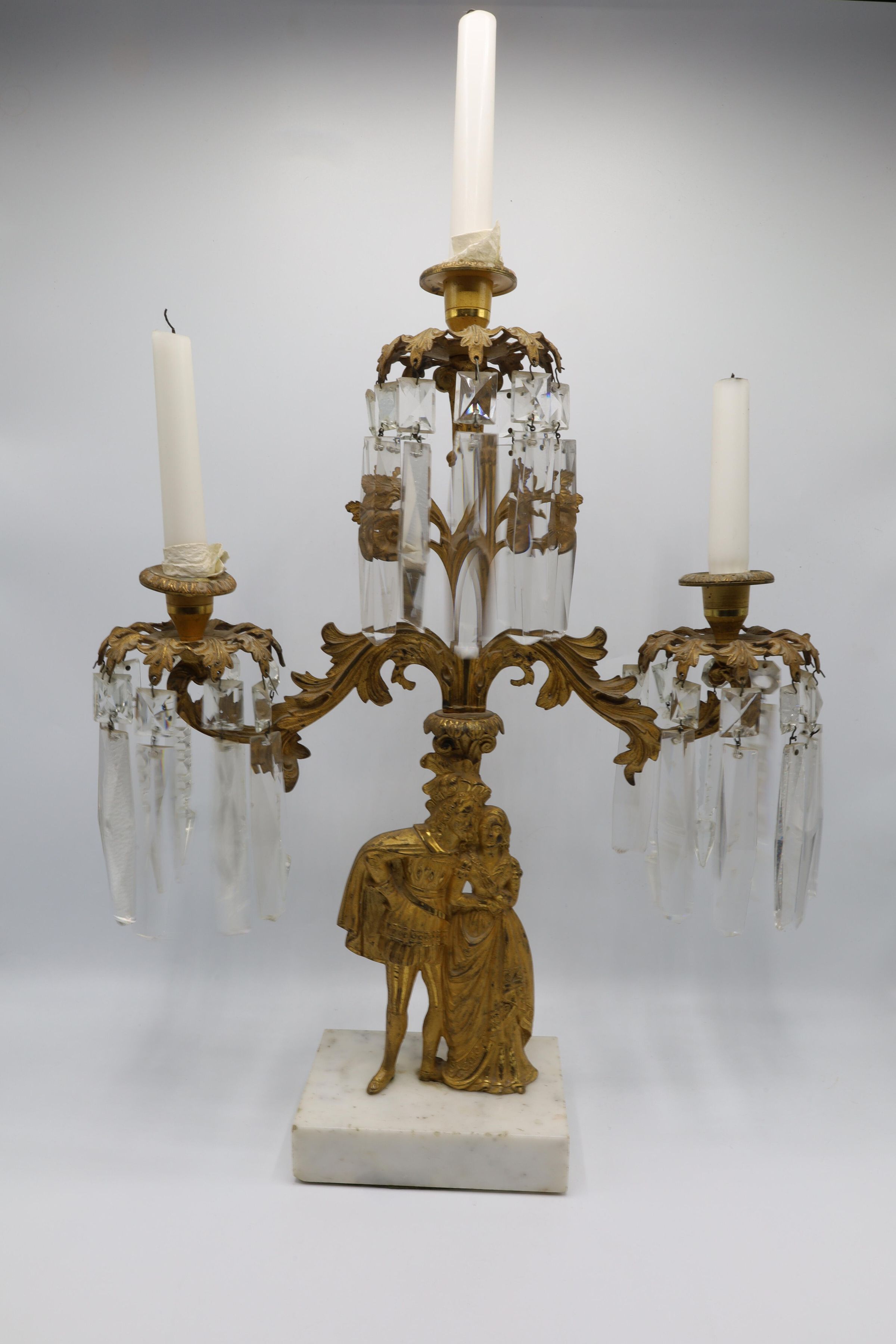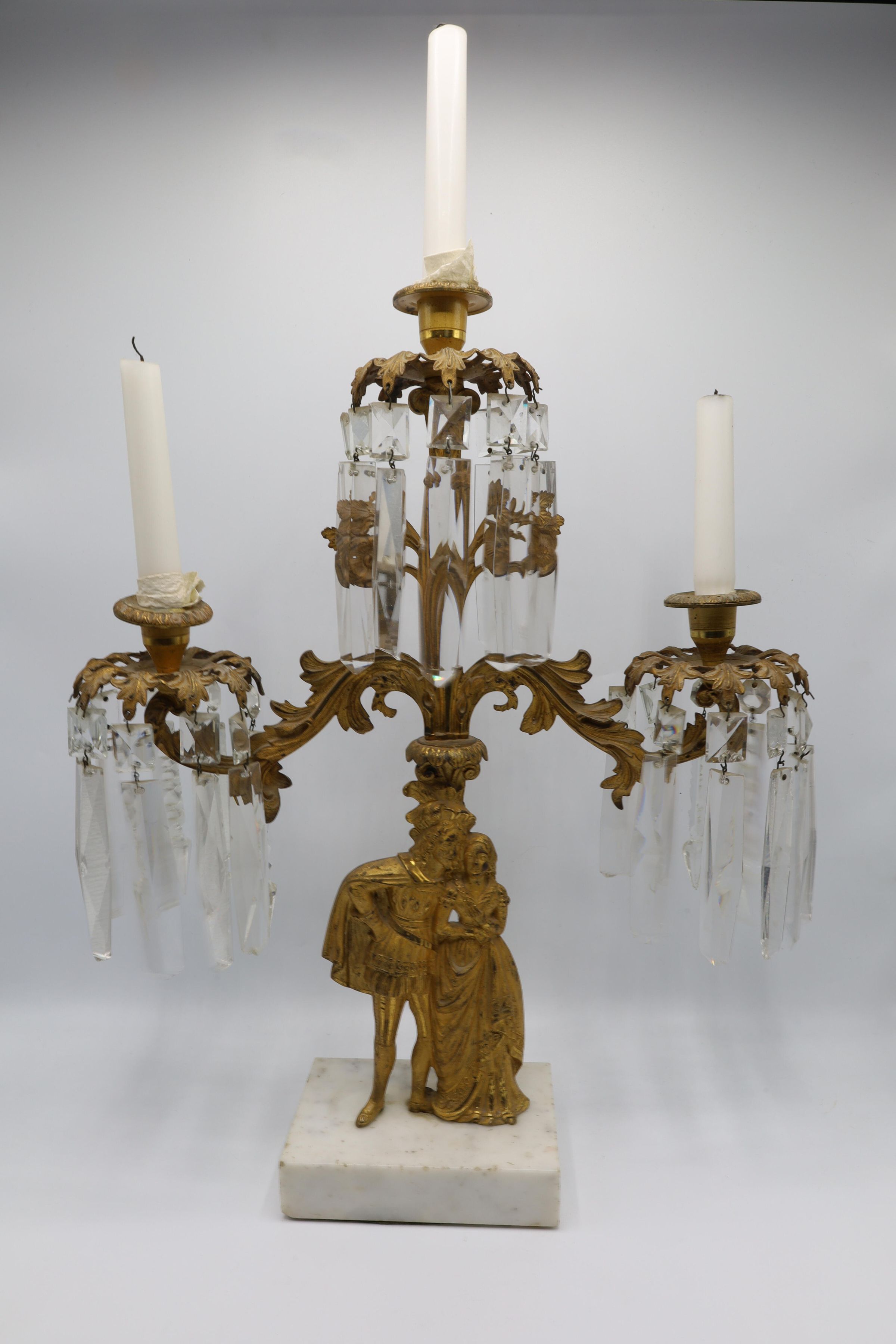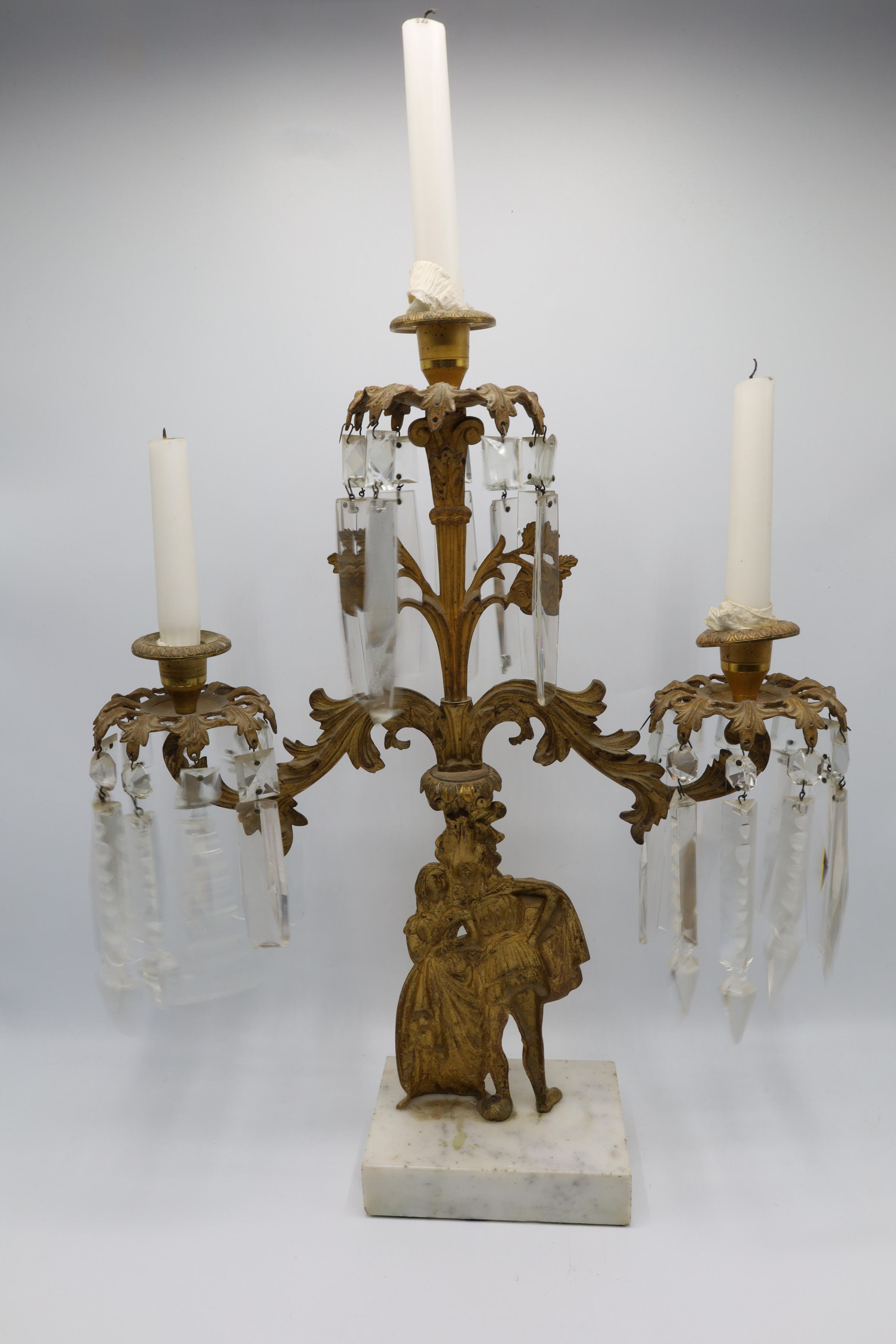 Three arm gilt metal candelabra with hanging, articulated crystal prisms. The figures of a courtly man and a woman standing on a marble slab form the base of the candelabra. Elaborate stylized foliage decorates the metal arms. This is a very ornate and 'old-fashioned' style of decoration for a household of the 1940s. It is likely French and dating from the late 19th century.Location