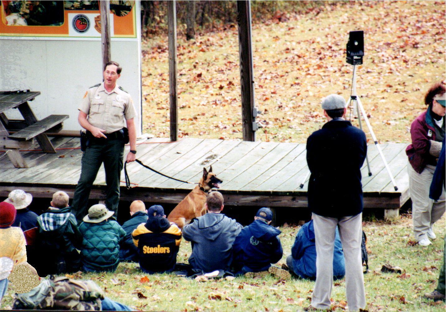 A park ranger at Burr Oak State Park introduces boy scouts to his service dog during the 1999 Scouting Outing.