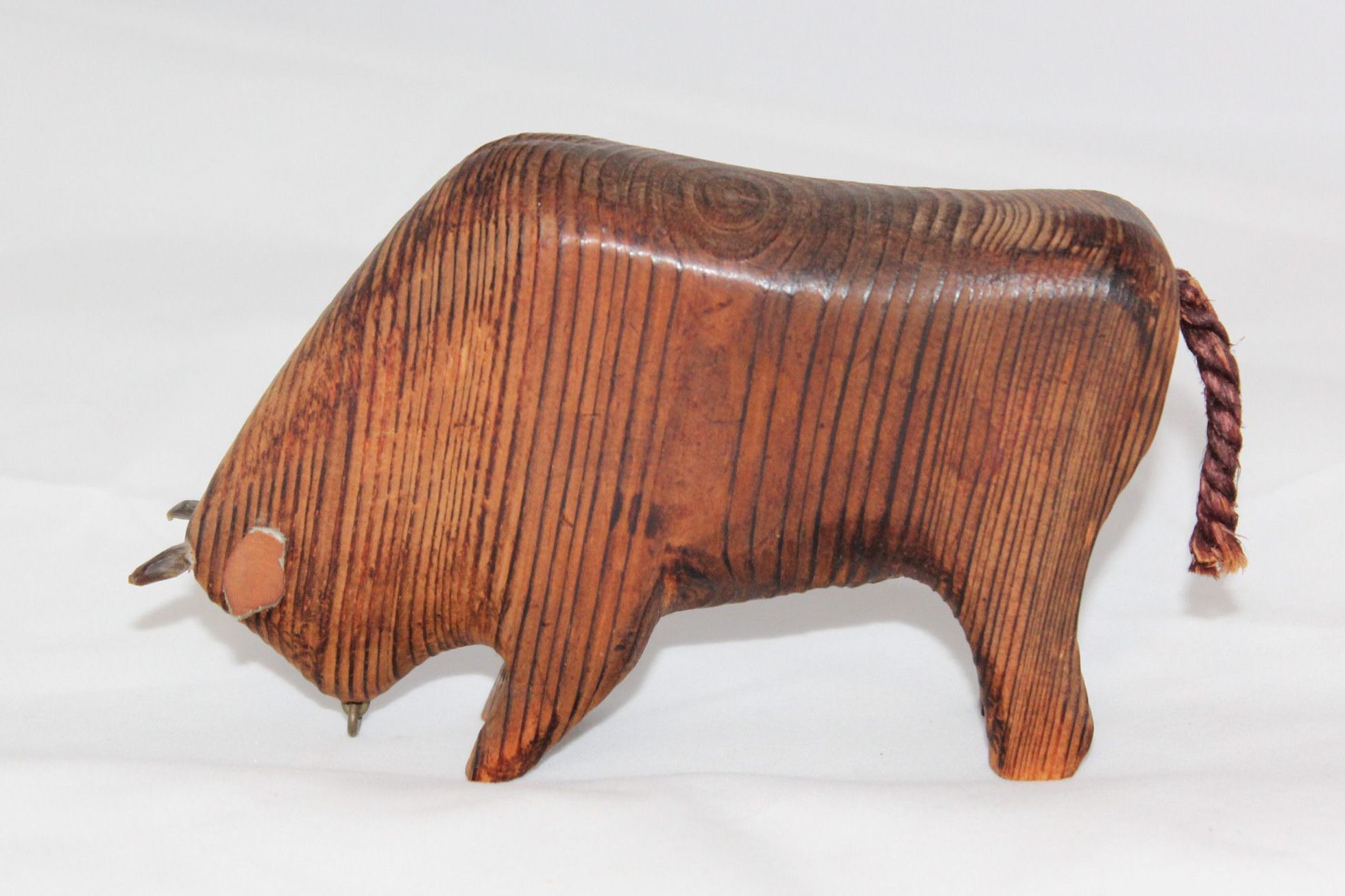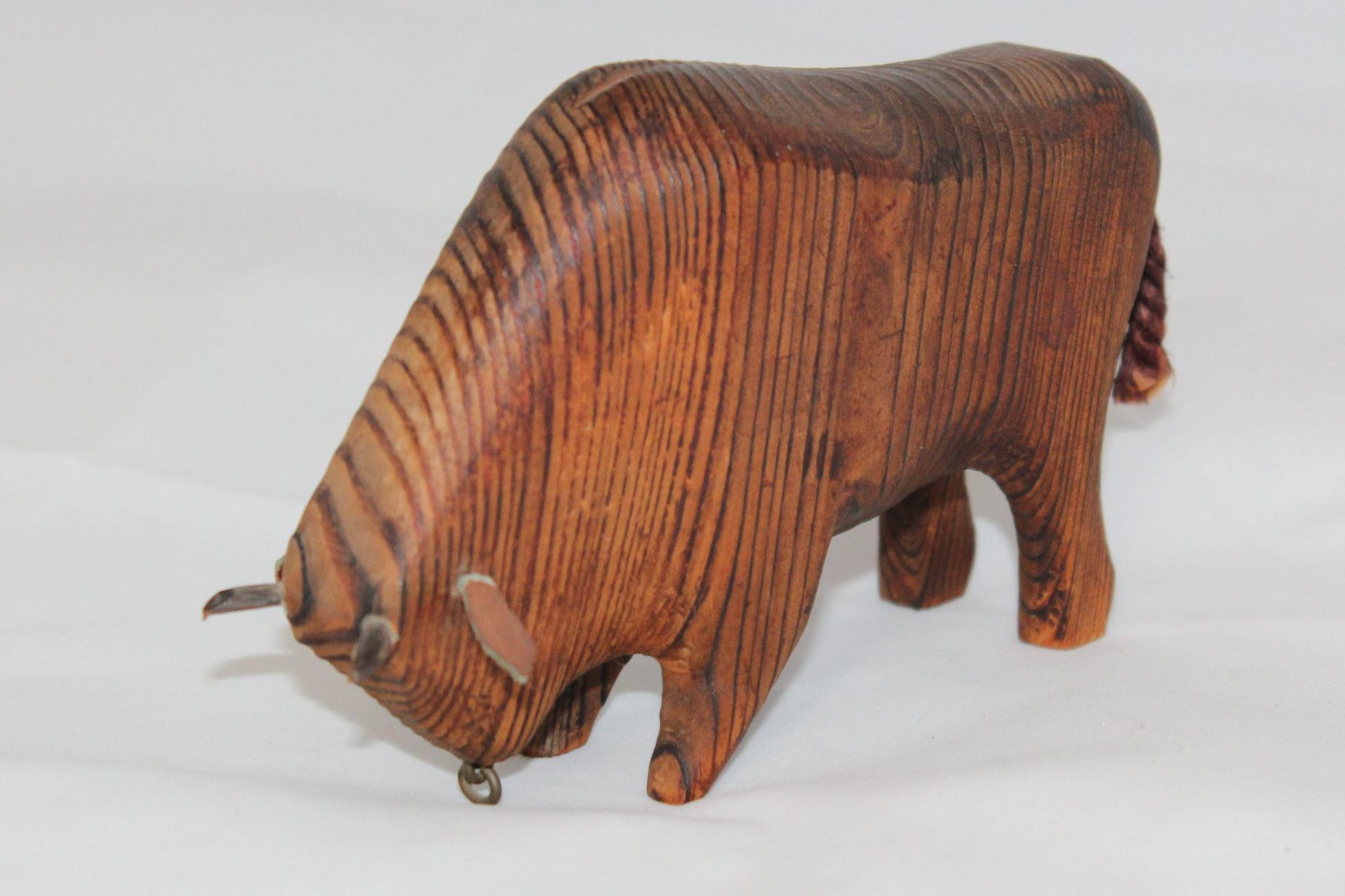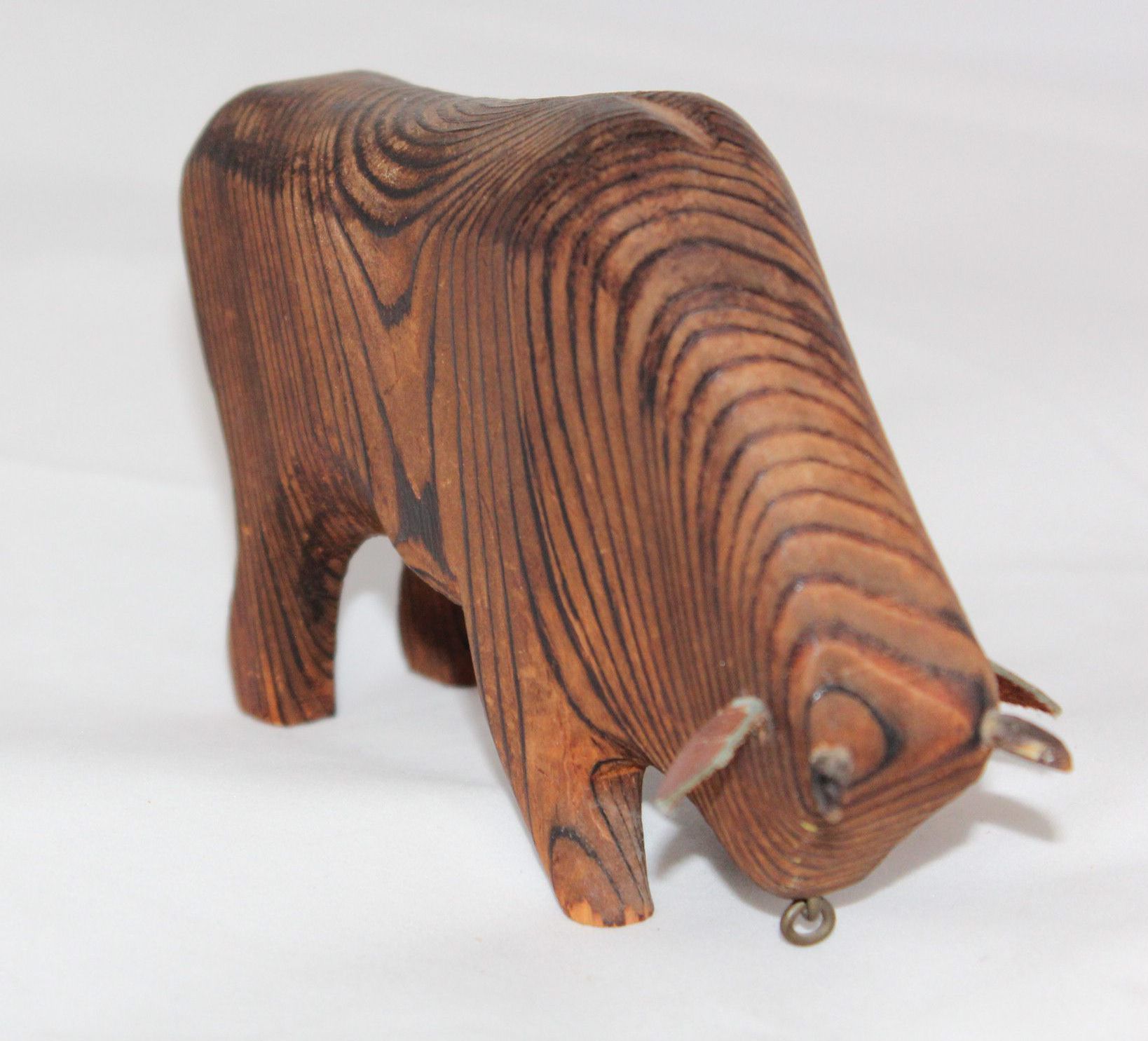 Done in a Scandinavian mid-century modern style, this carved wooden bull features leather ears, a yarn tail, a metal ring in the nose, and horns made of another material. A similar bull was described as having horns made out of bone.