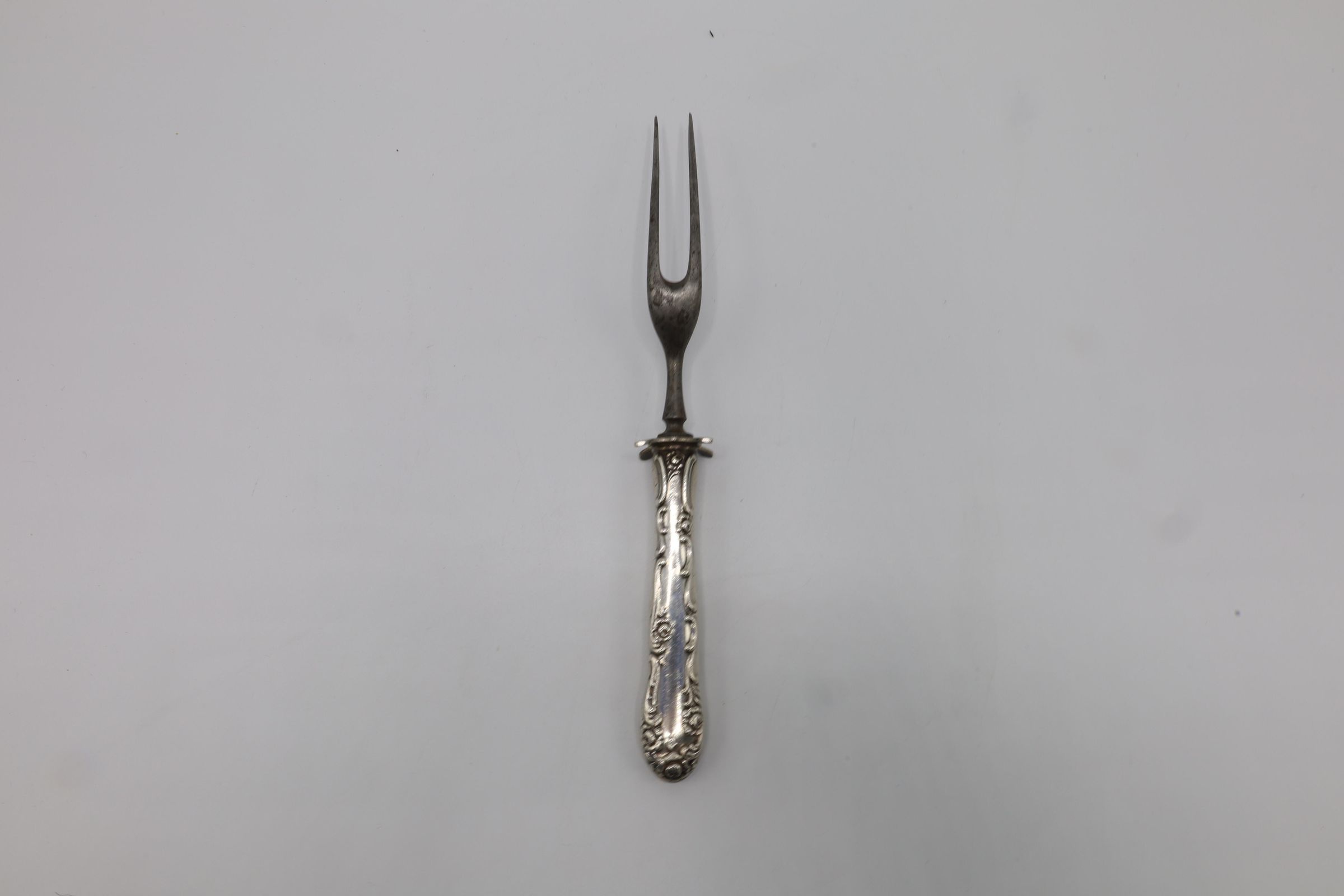 A silvertone carving fork with two tines, filigree, and a floral design on the handle. A carving fork was an essential part of entertaining and was often part of a set with a matching knife. Decorative carving forks and knives were used when large cuts of meat were presented to diners at the table, which the host used to prepare individual servings.Location