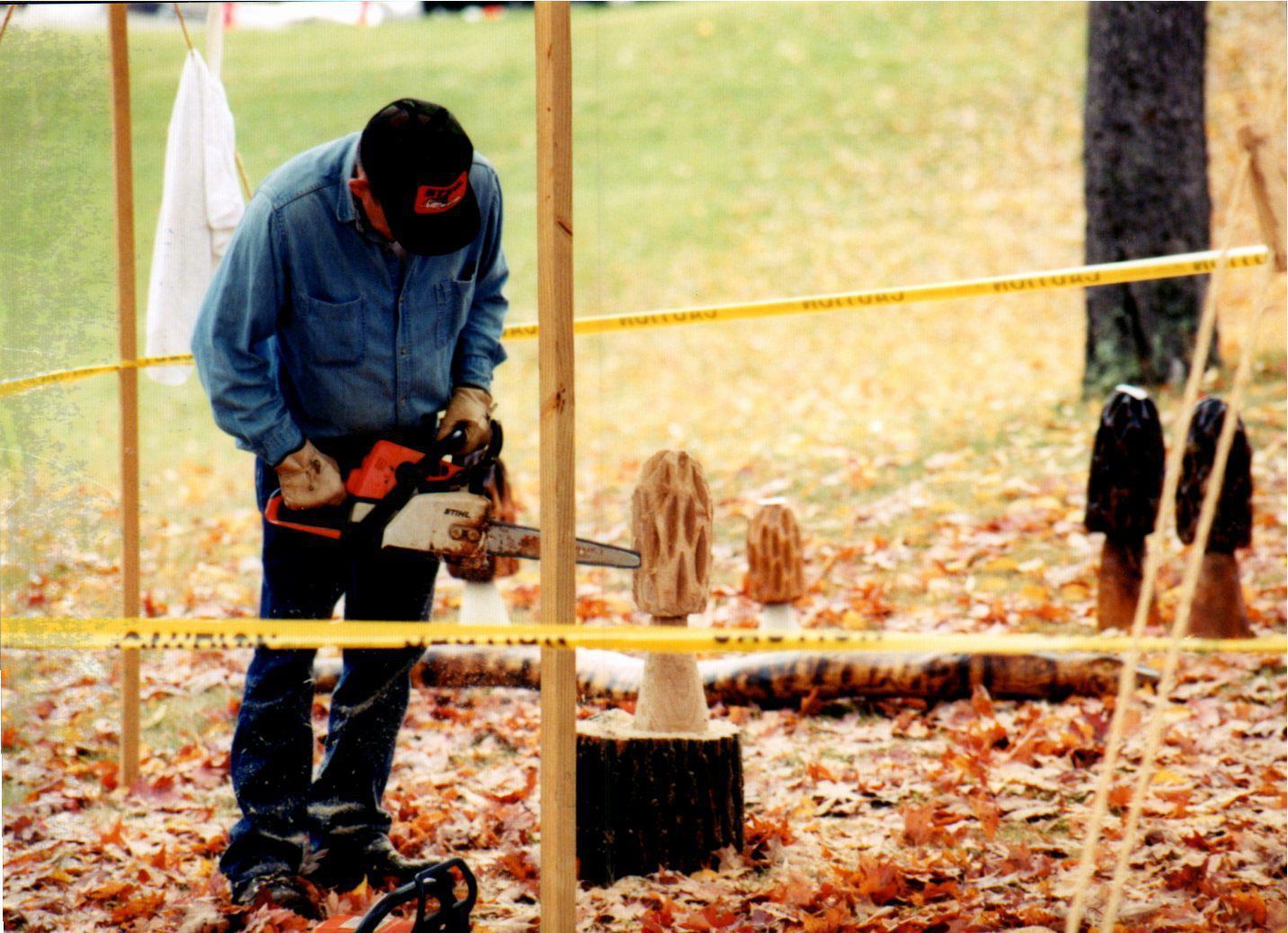 A woodworker delicately carves a piece of wood into a representation of a morel mushroom at the 1999 Scouting Outing held at Burr Oak State Park.