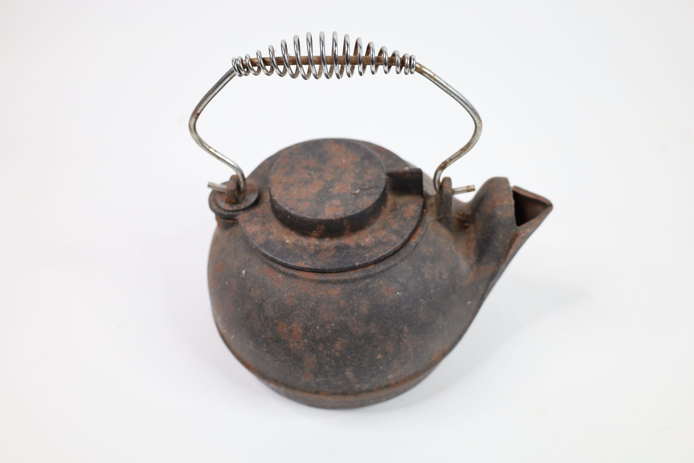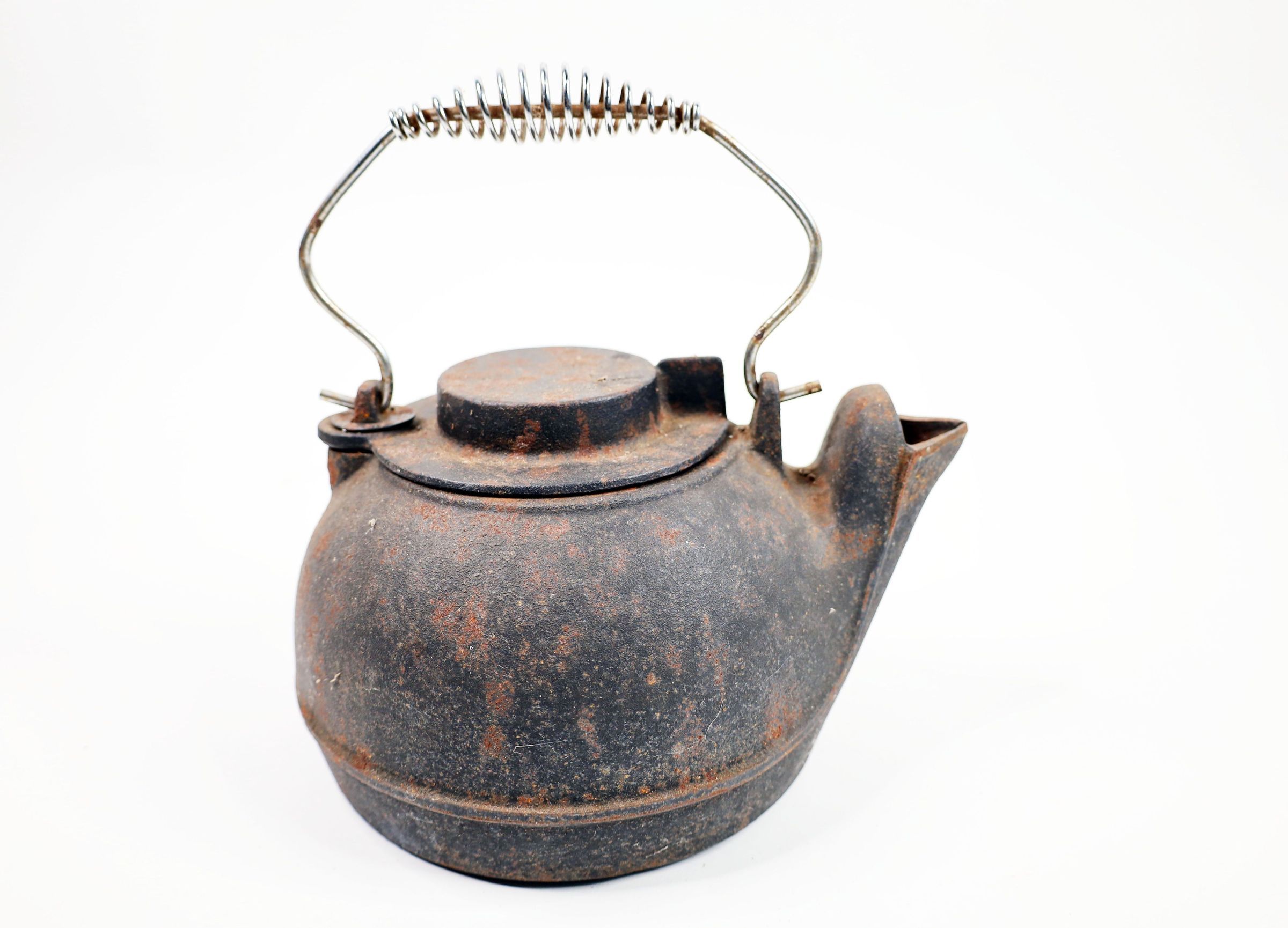 Cast iron kettle, of a design common to the late 19th-early 20th century. Stainless steel coiled handle likely not original.