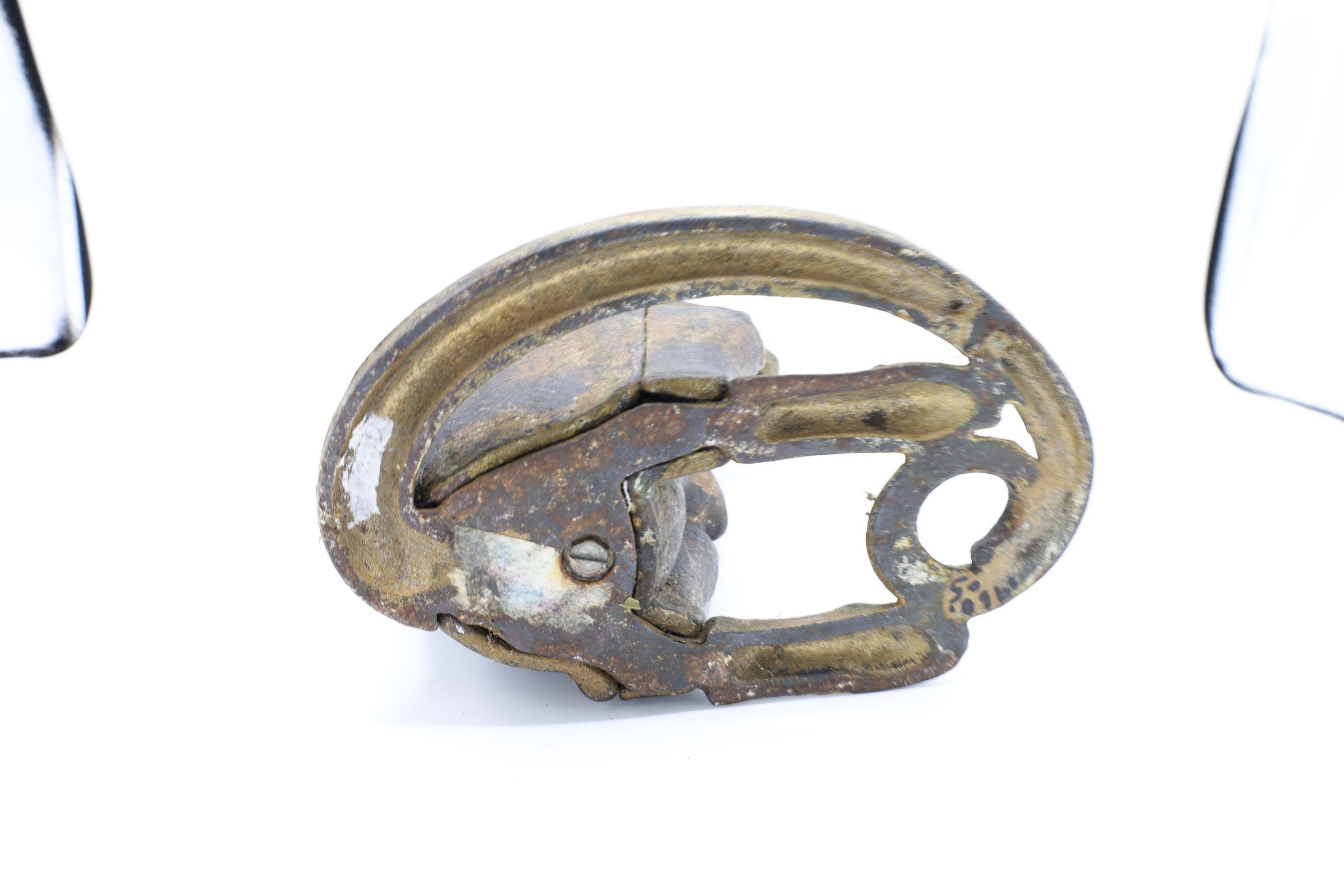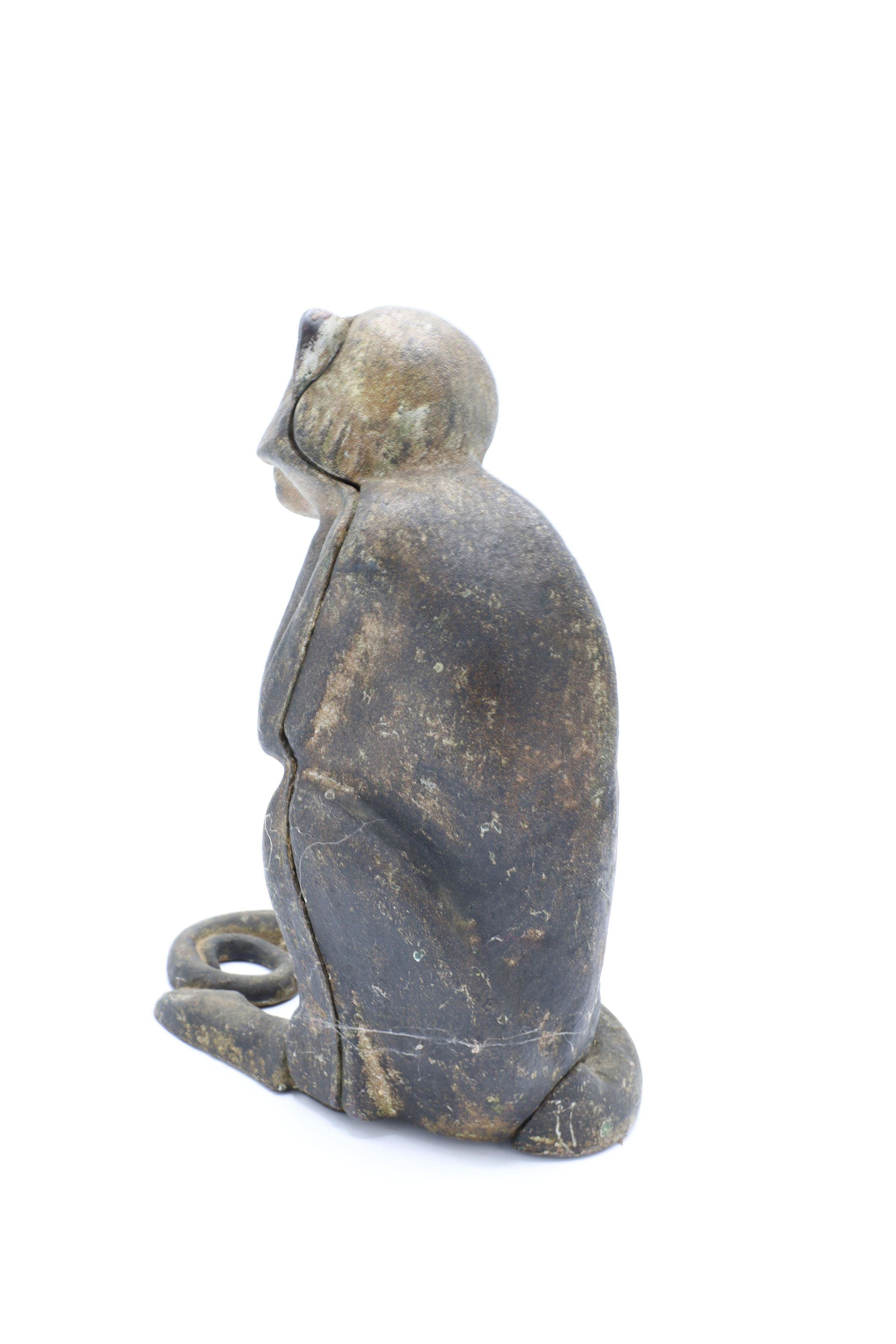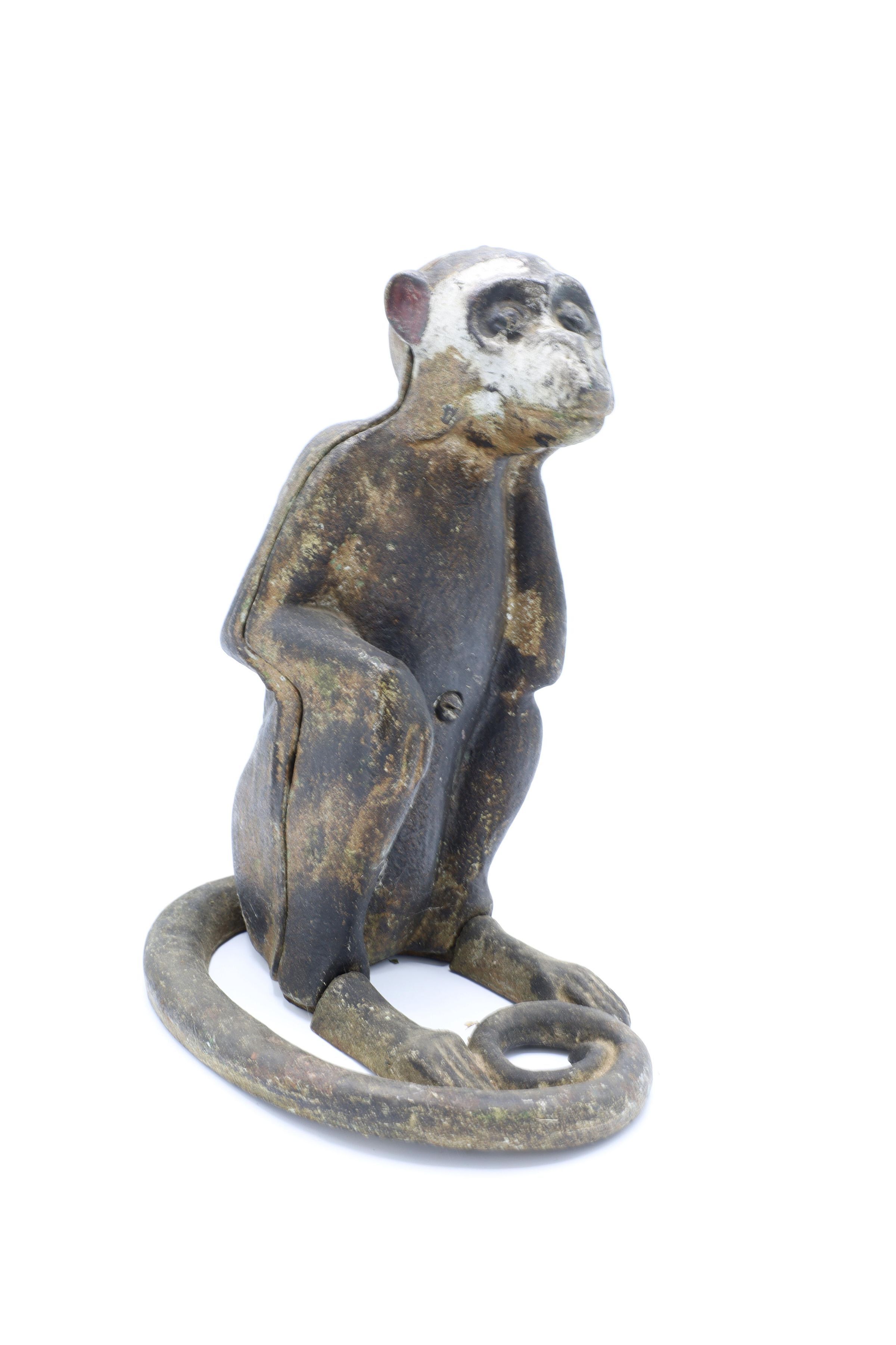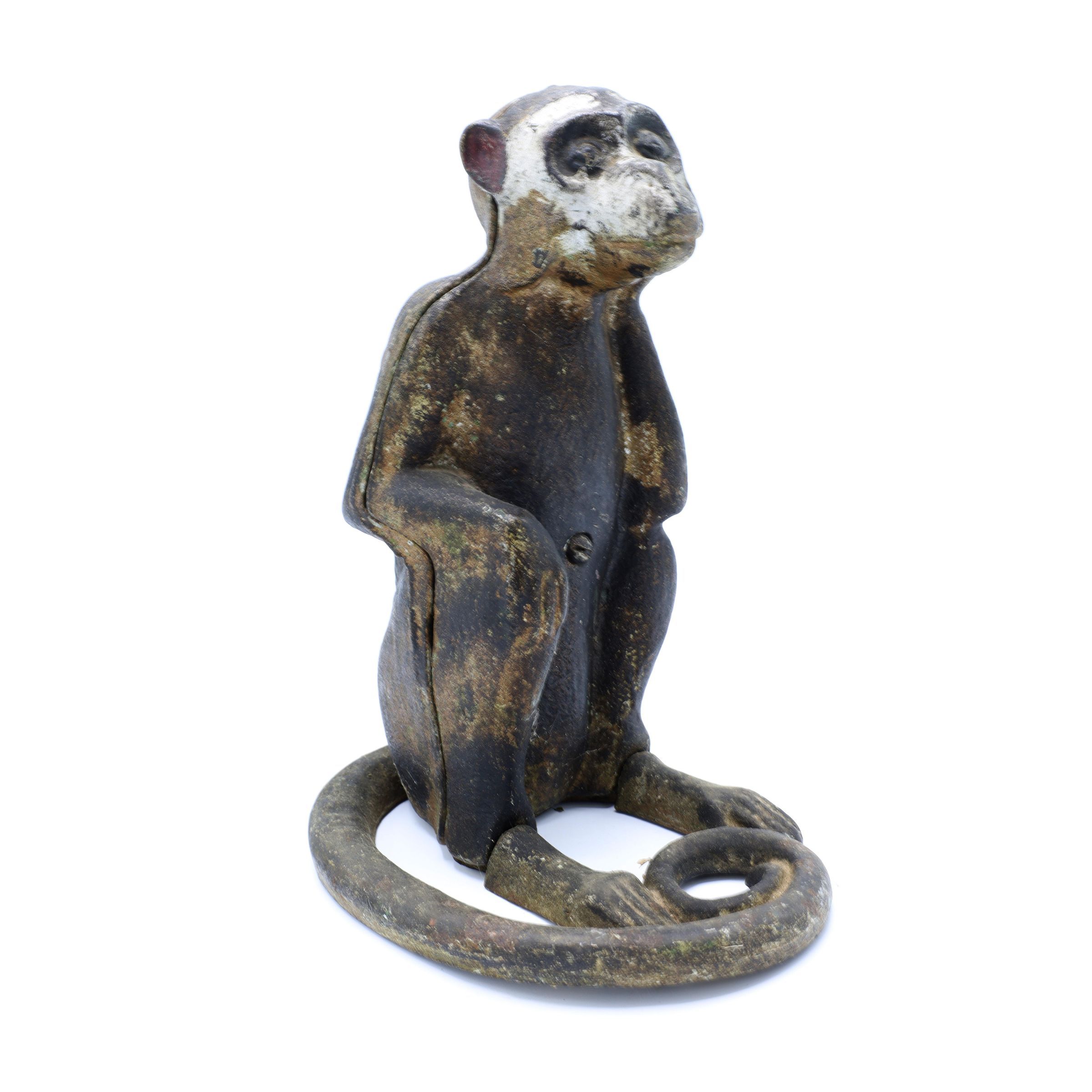 This cast iron monkey doorstop was most likely produced circa 1930 by The Hubley Manufacturing Company. Unfortunately, Hubley placed its trademark on the inside of its doorstops, and this doorstop has no visible manufacturing or trademarks.