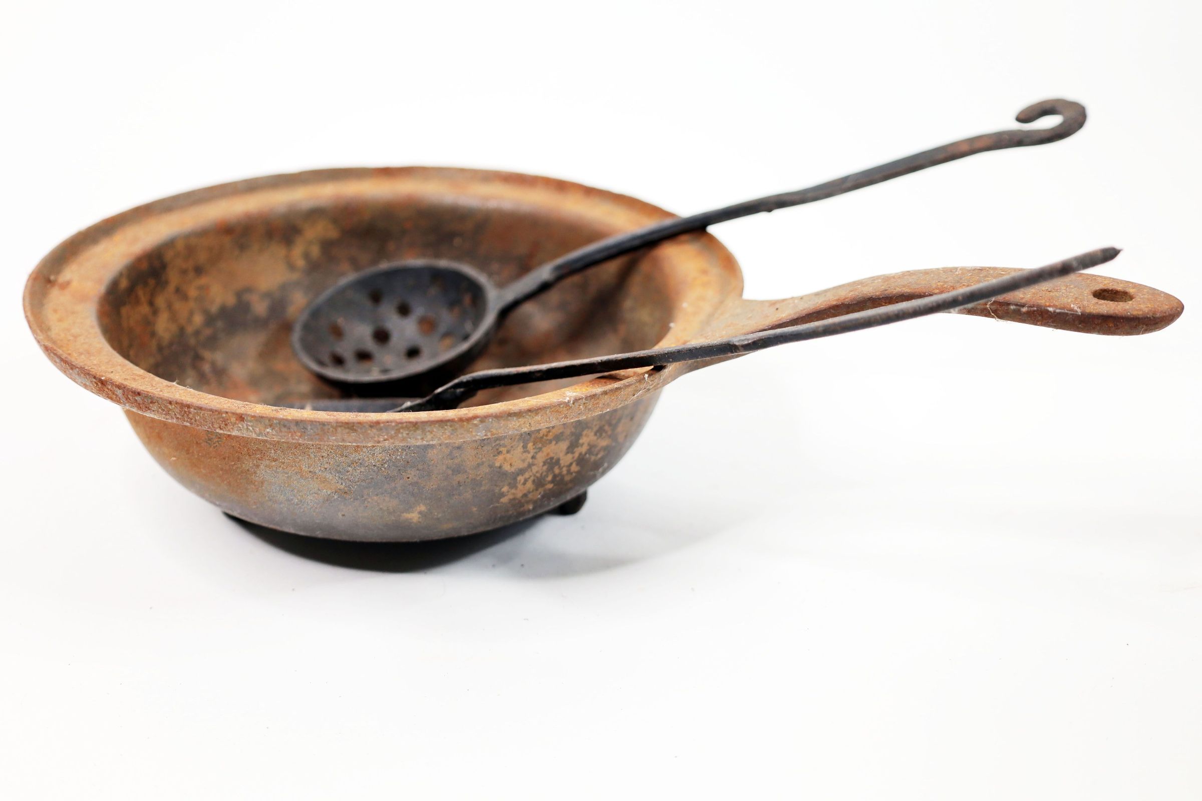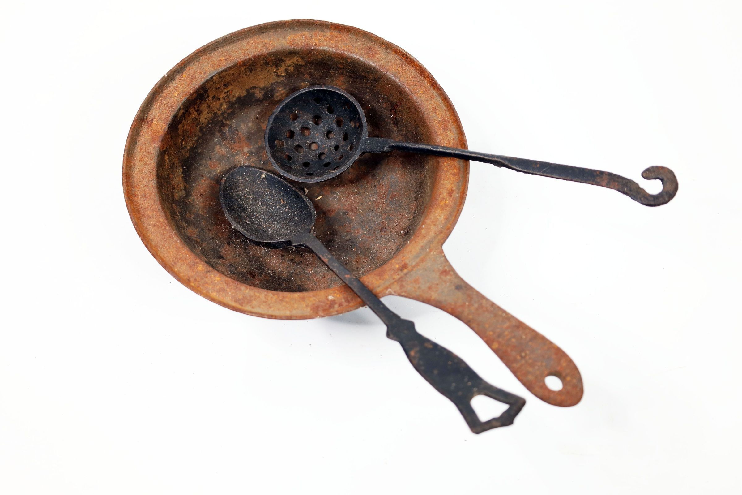 Cast iron saucepan and two cast iron spoons. Strainer spoon used for separating solids from liquids while serving stews and soups.
