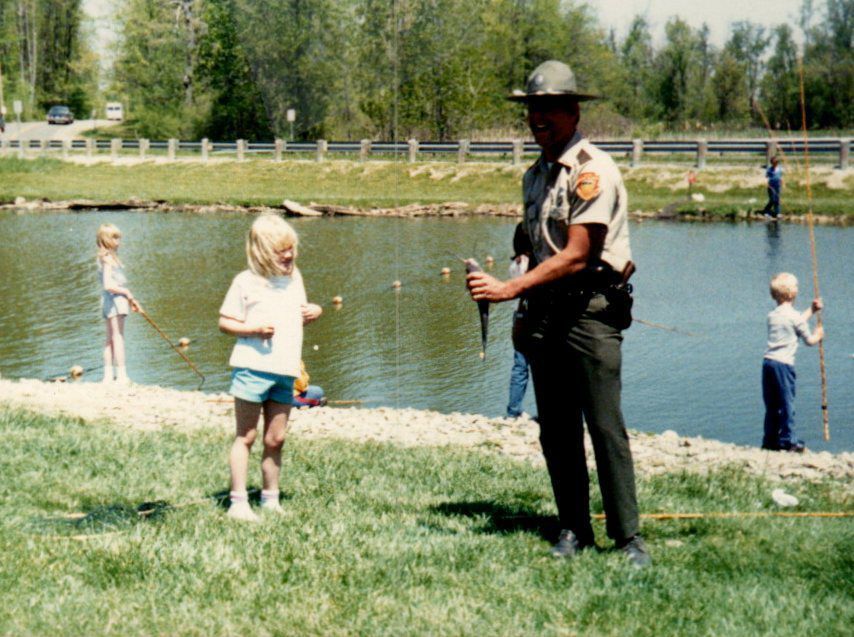A park ranger at Indian Lake State Park holds a young girl's catch as she looks toward the fish. The fish appears to be a species of catfish.