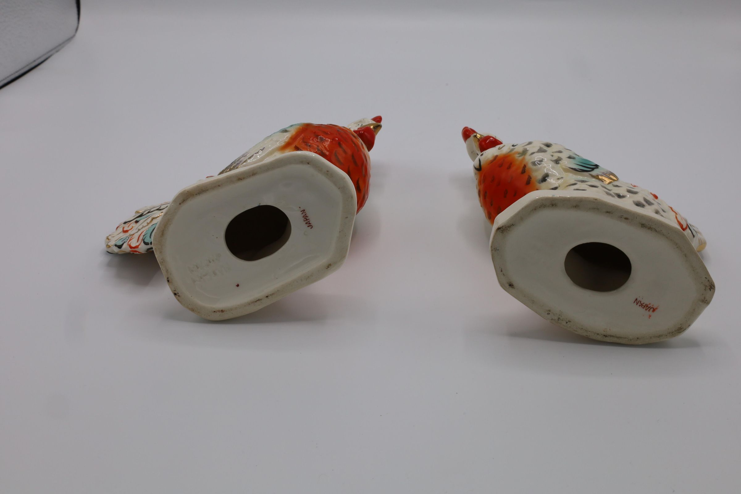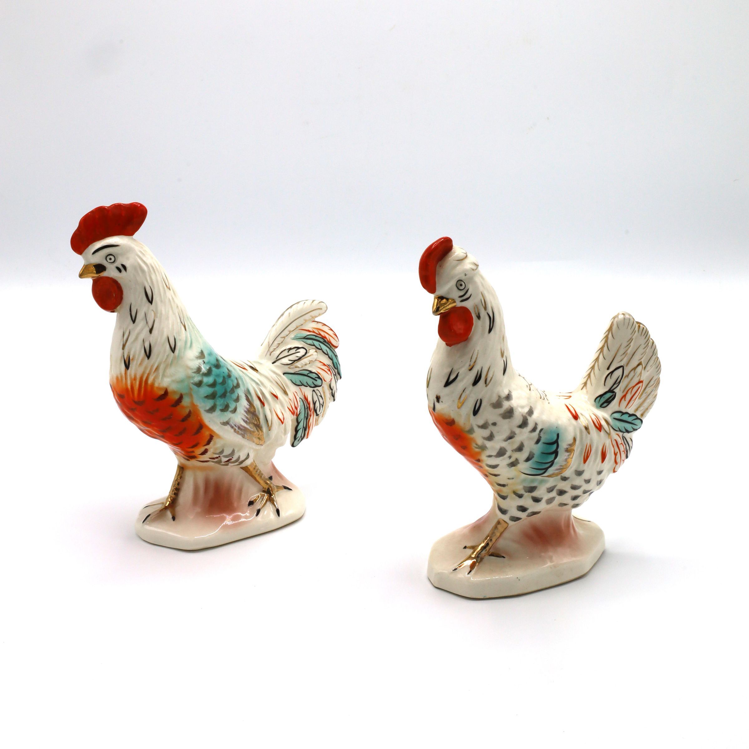 Pair of ceramic chickens: a rooster and a hen. Chickens are on white bases with what appears to be hand-painted red, blue, black, and gold accents. The inscription 'JAPAN' is on the bottom of both.