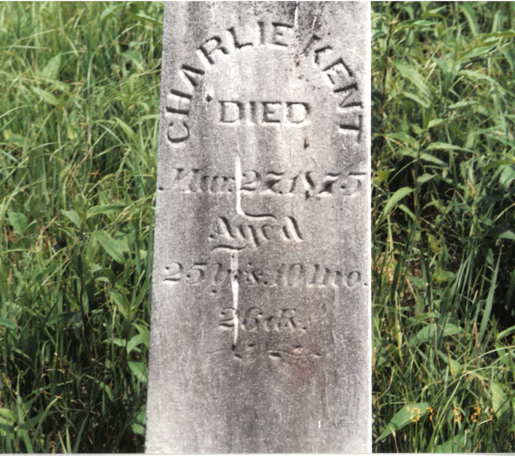CHARLIE KENT Born May 1, 1849 Died Mar. 27. 1875 Aged 25 yrs. 10 mo. 26 ds.