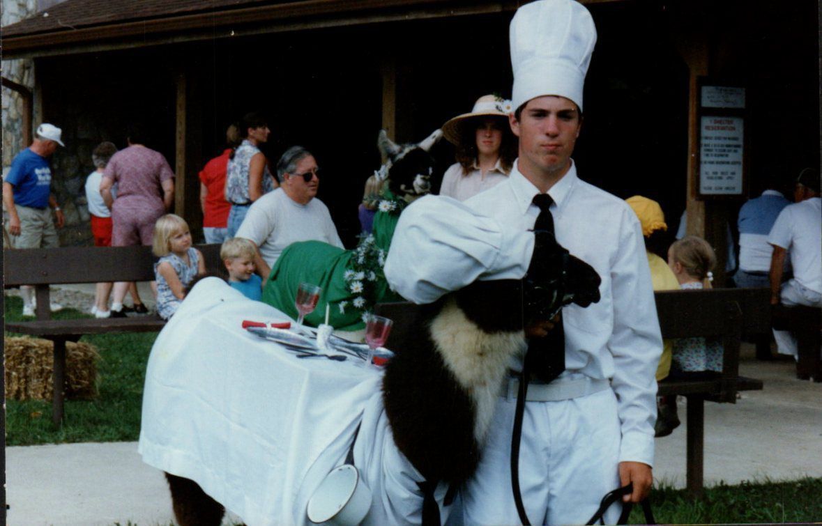 A chef and his llama, decorated in culinary attire and accessories, walk together at Mt. Gilead State Park during the park's Farm Day in 1996.