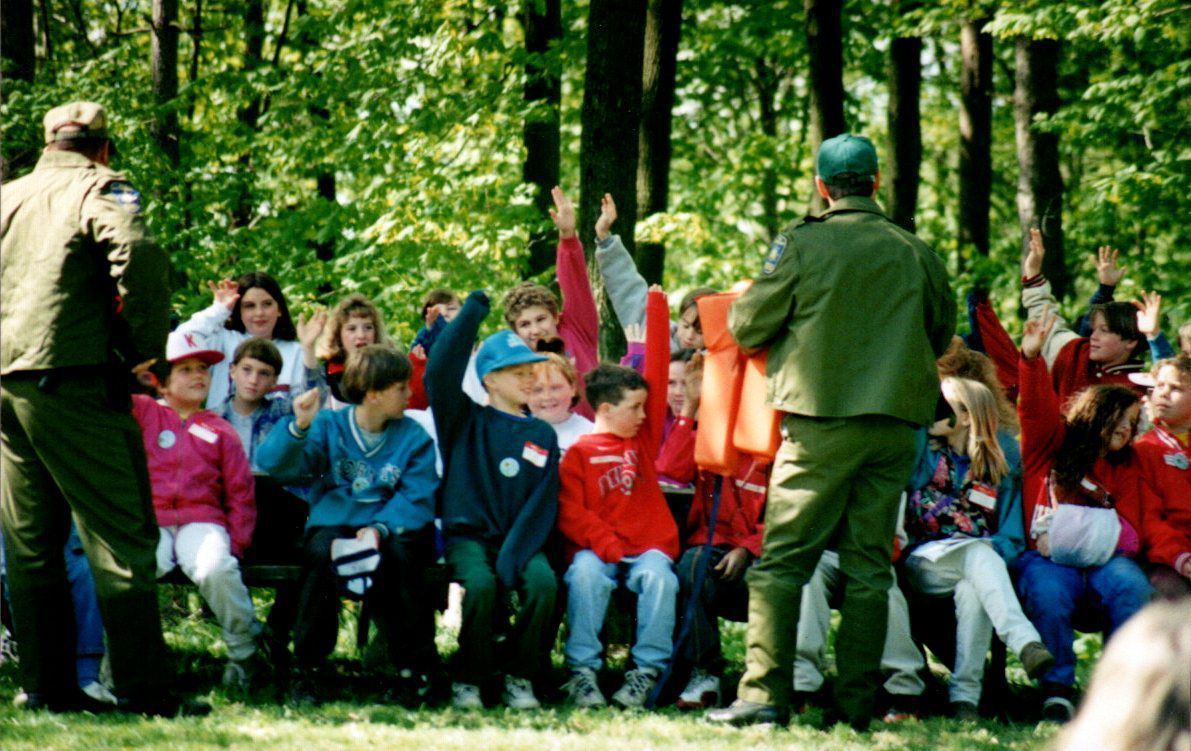 Two rangers from Mt. Gilead State Park ask a question to children about life jackets during the park's 1997 edition of their Farm Days festival. The children respond enthusiastically by raising their hand.Cataloged By