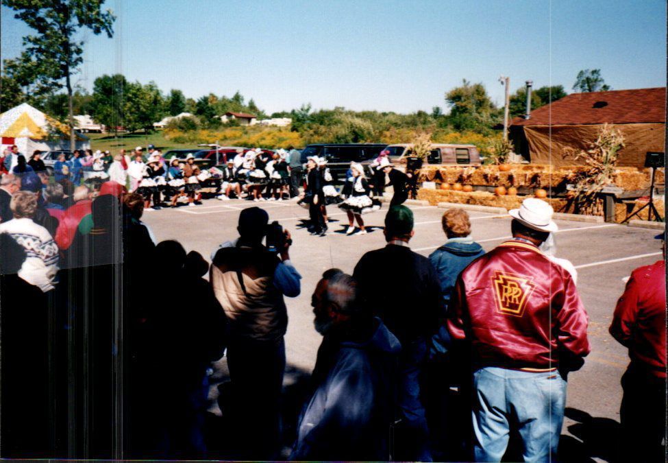 A troupe of traditionally-dressed children dance for a crowd during what appears to be a harvest festival at Indian Lake State Park.