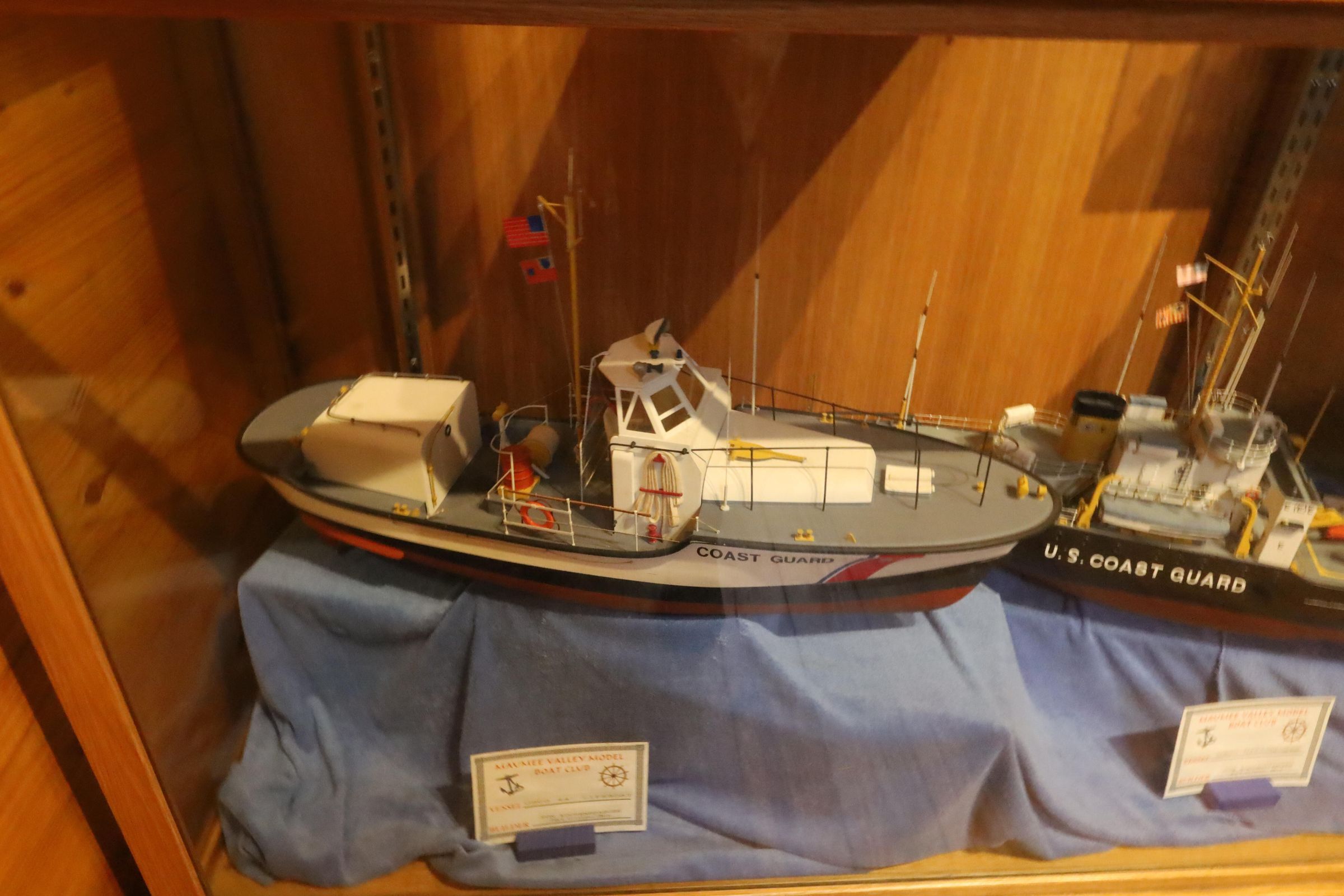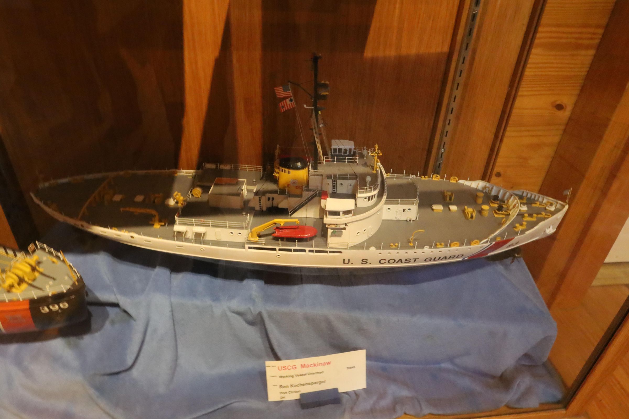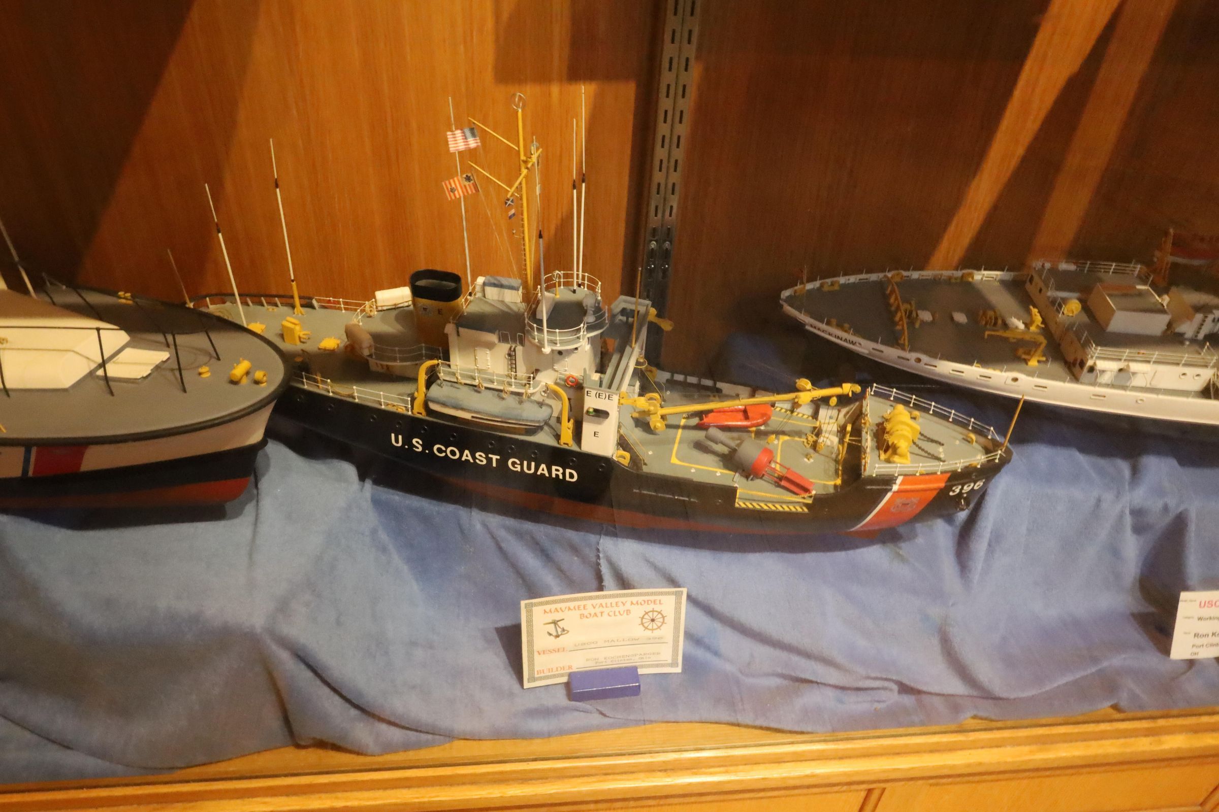 Three Coast Guard boat models on display include the USCG Mackinaw, USCG Mallow, and USCG 44' Lifeboat.