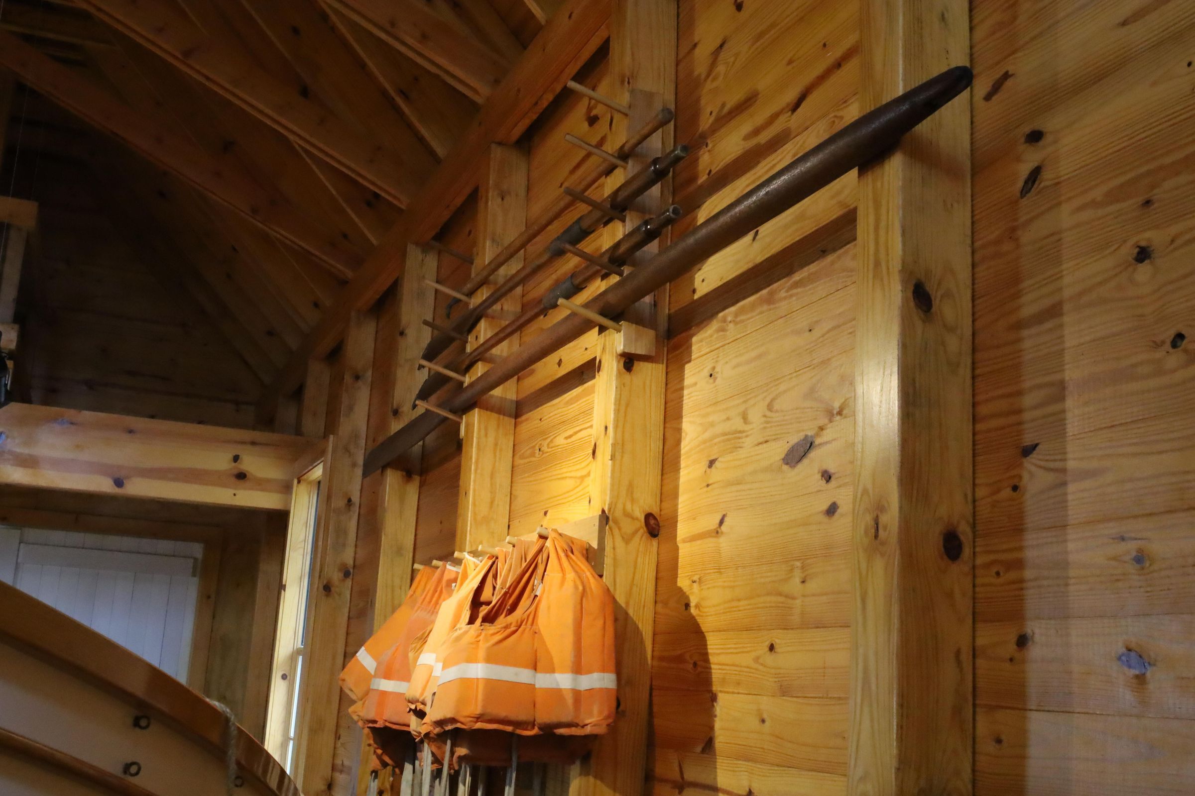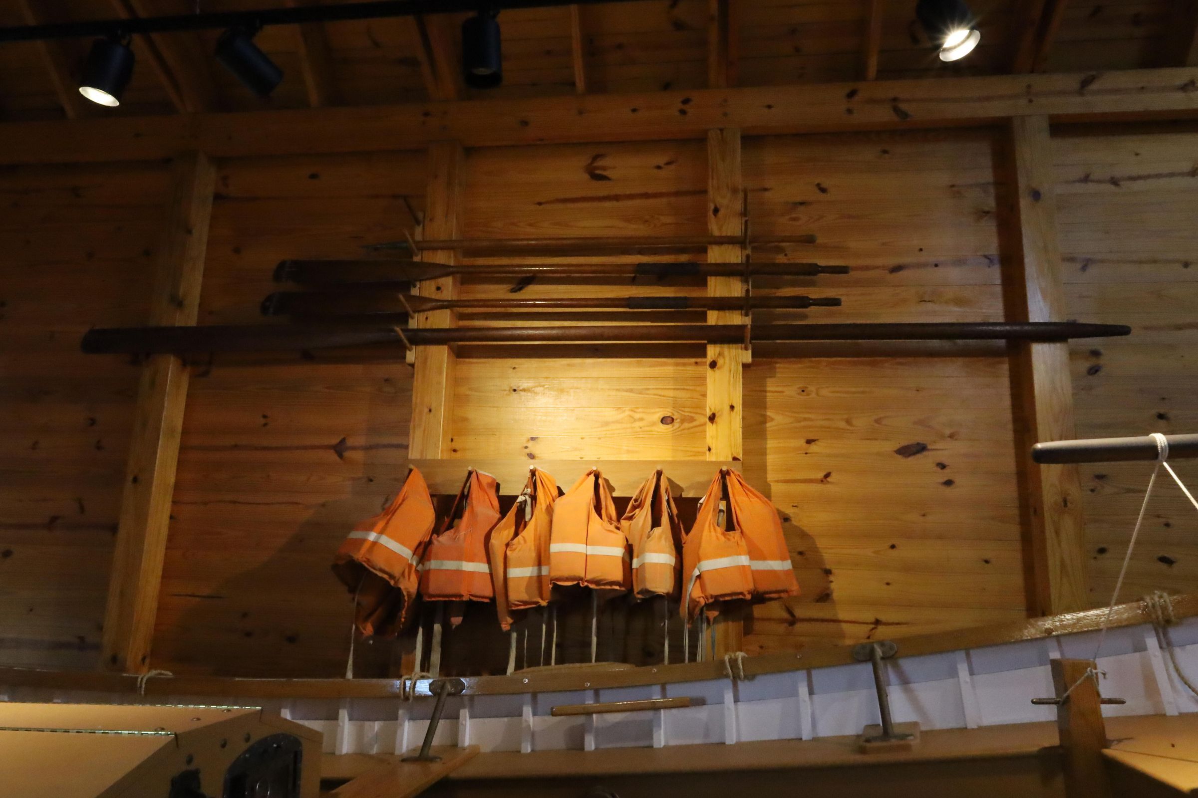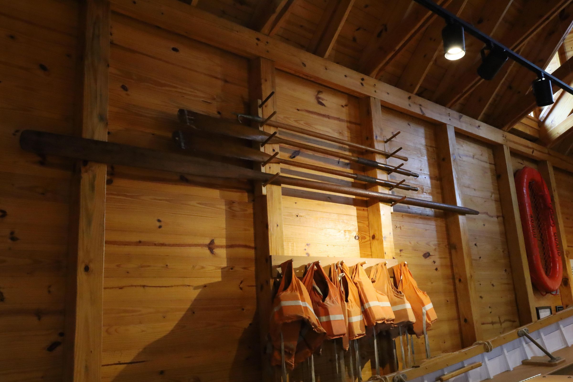 Oars and life preservers are showcased alongside the restored 1931 Coast Guard surf boat at the Marblehead Life Saving Station.