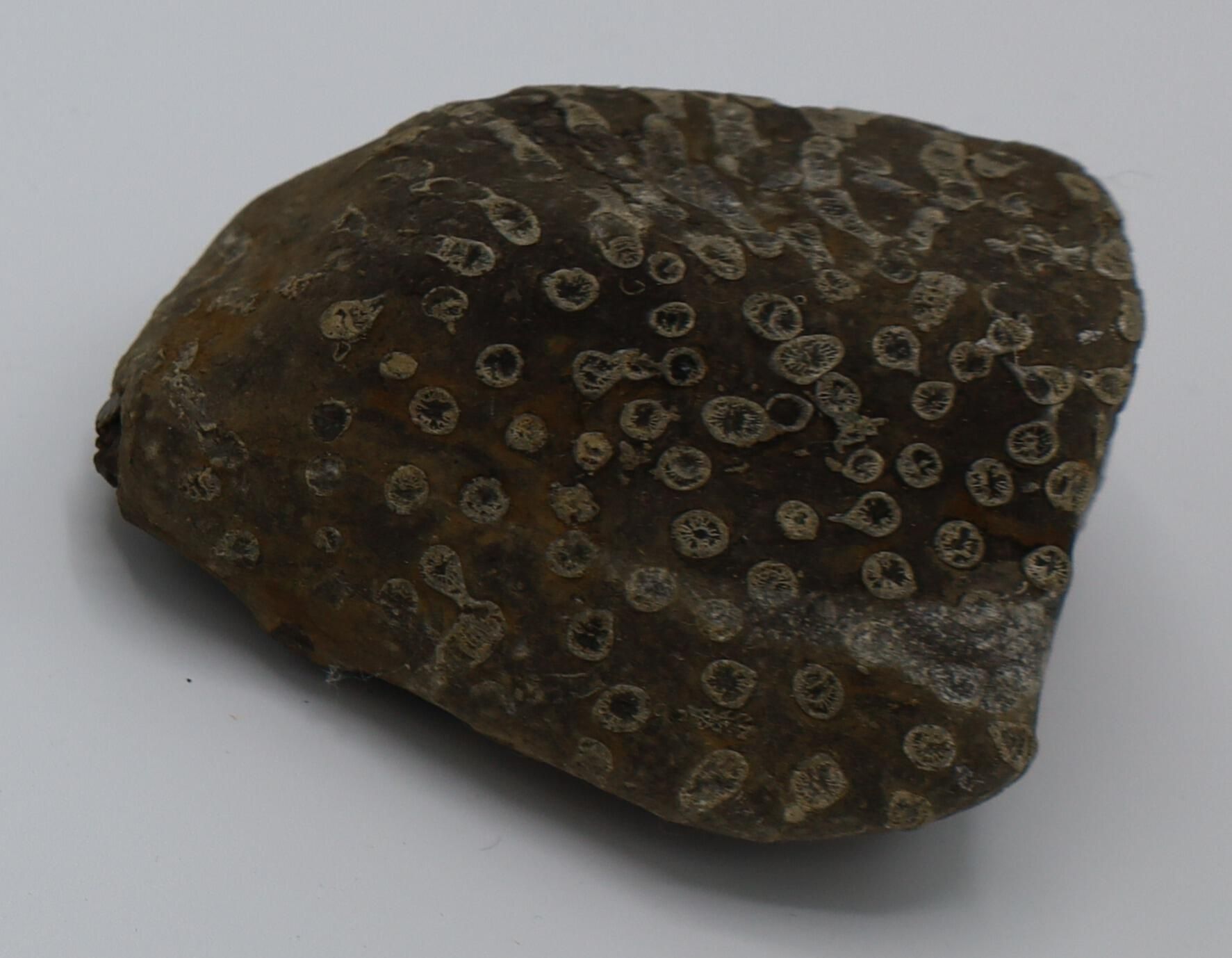 This colonial rugose “finger” coral Eridophyllum is a fossil of the Columbus Limestone originating from the Devonian Period, 360—419 million years ago.