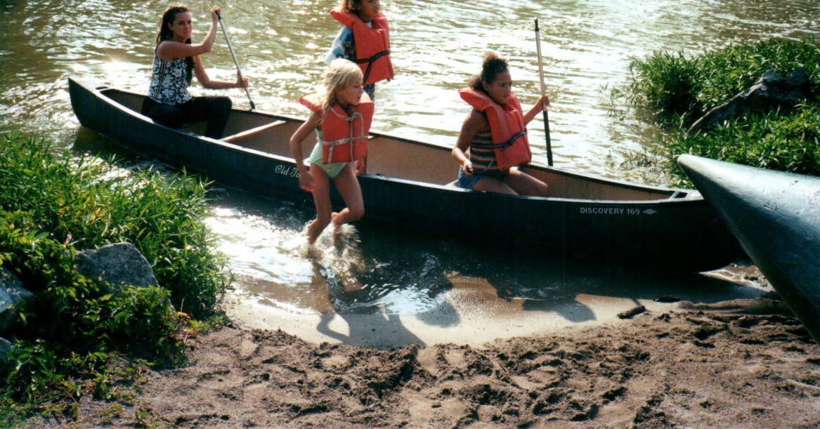 Two children and two adults have guides a canoe to the shore of Indian Lake State Park. One excited girl has jumped out and runs ashore.