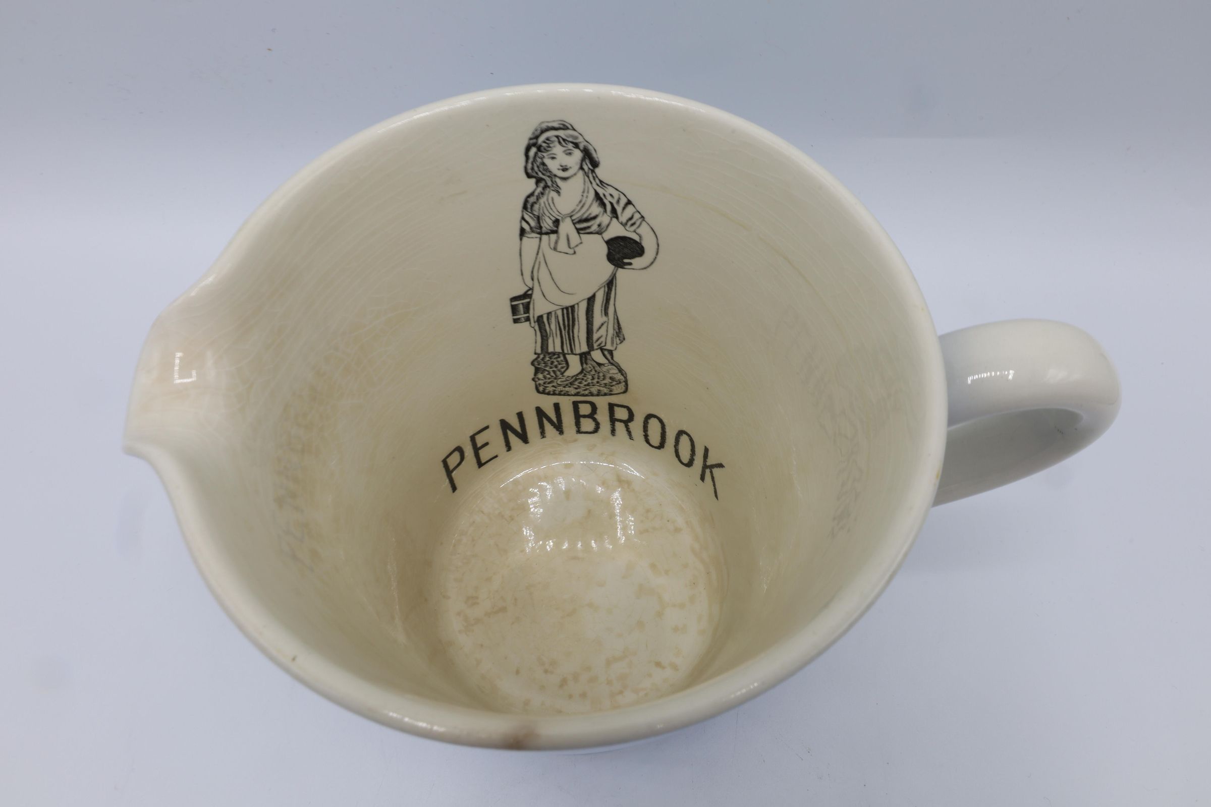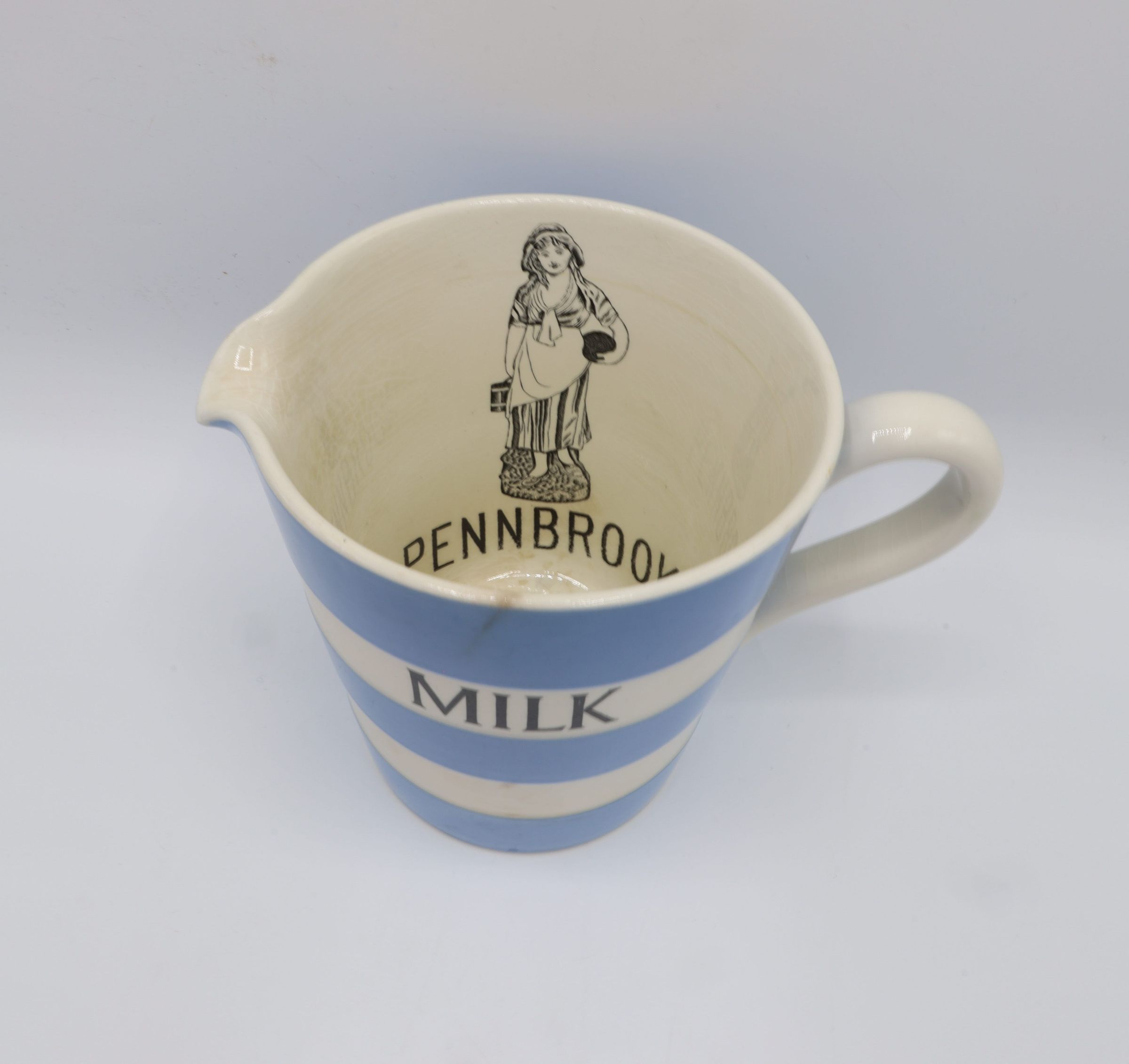 The one quart milk pitcher has blue and ivory stripes with "MILK" written on the outside. The inside ismarked with volume measurements: Pint, Pint & Half, Quart. Also on the inside is a milkmaid standing over the work "Pennbrook." Pennbrook Dairy Co. is a dairy located in Philadelphia, Pennsylvania. The pitcher is marked on the bottom with a shield and Cornish Kitchenware