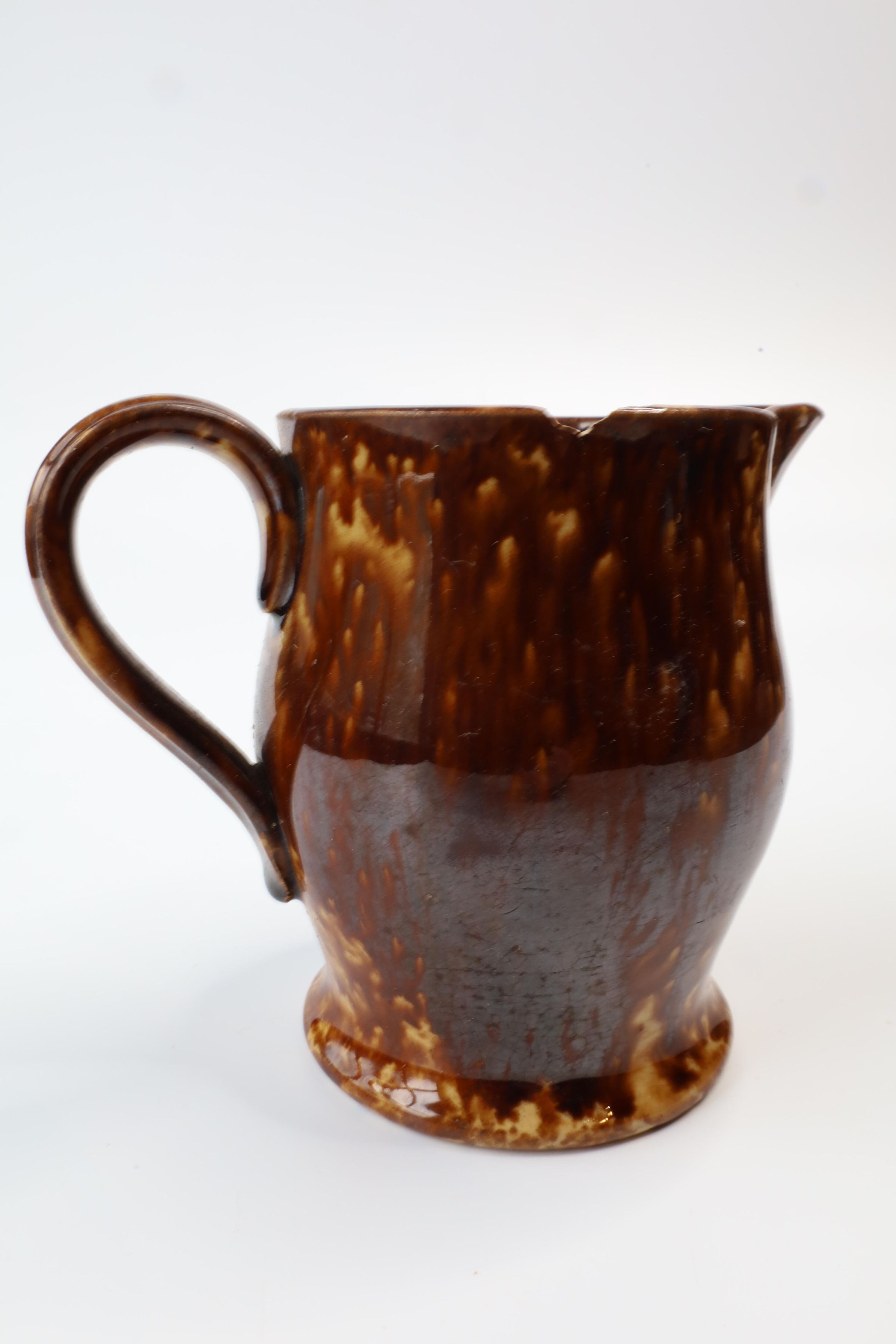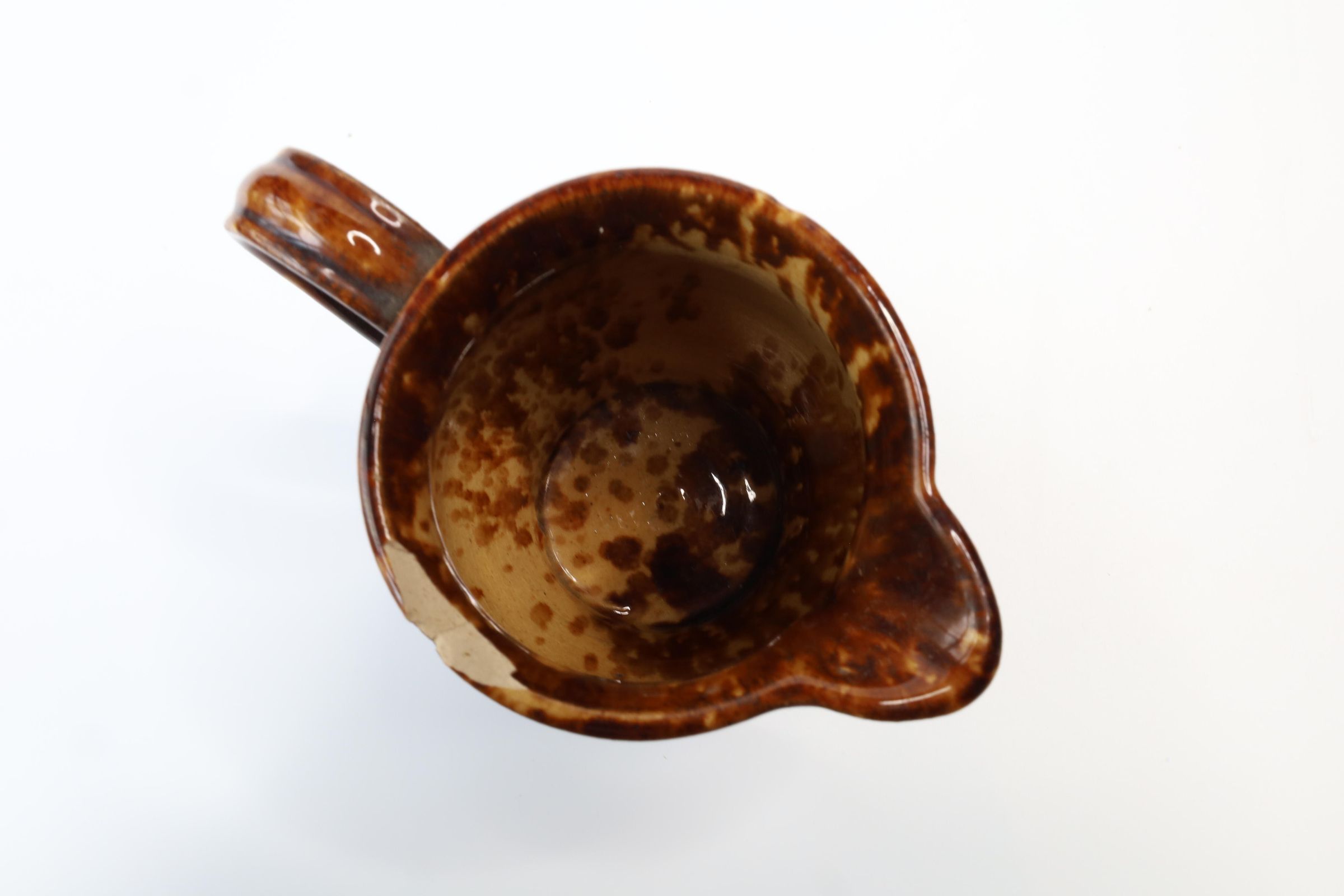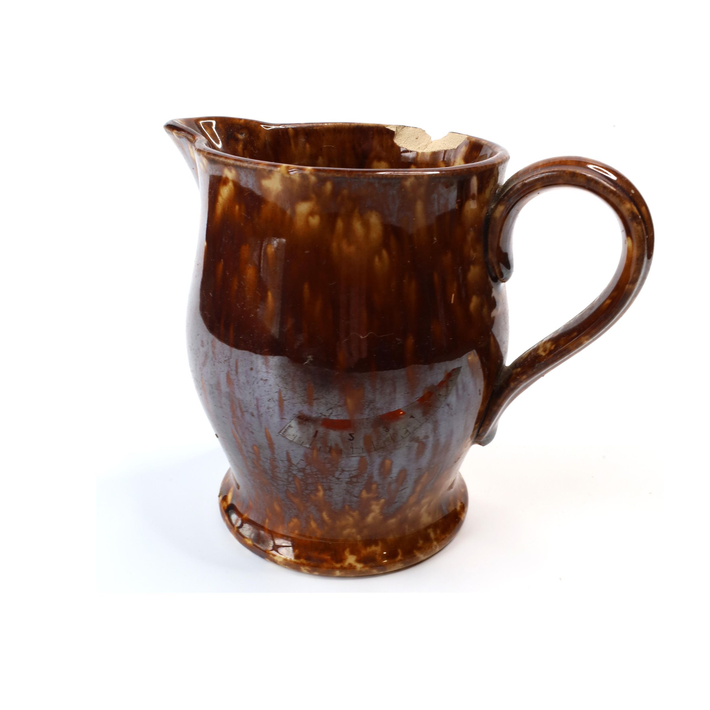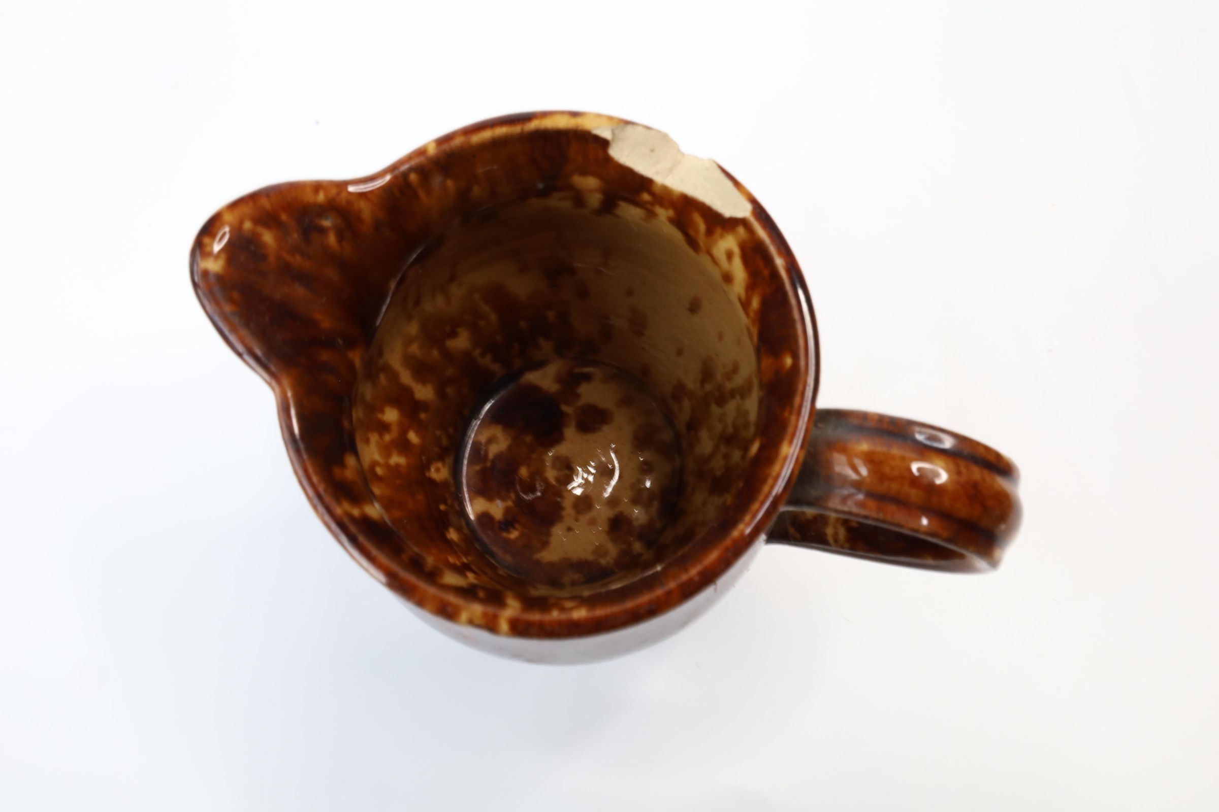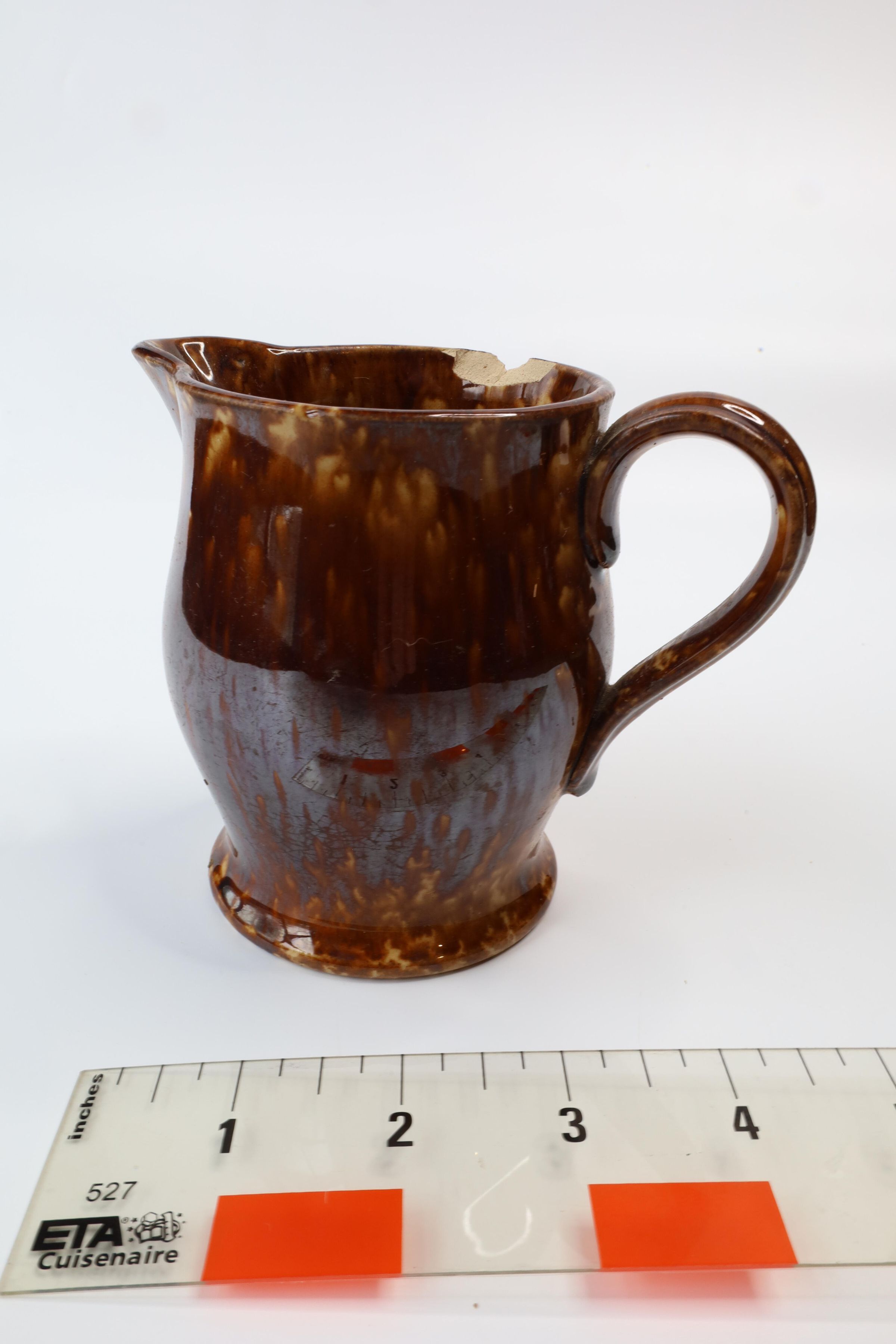 This ceramic creamer features a Rockingham glaze with light and dark brown tones on the inside and outside. Rockingham is generally not felt to be a specific ware type; rather simply a type of glaze applied to yellow, buff, or (rarely) white-bodied ceramics.