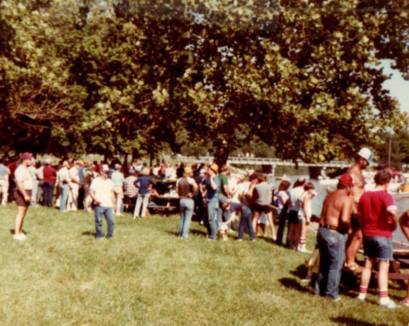 A crowd of parkgoers line the shore of Indian Lake. It looks like they are watching a boating event taking place on the water. Many gather around picnic tables and have laid out food and drink. One child in the center of the photograph bends over to pet a dog in attendance.