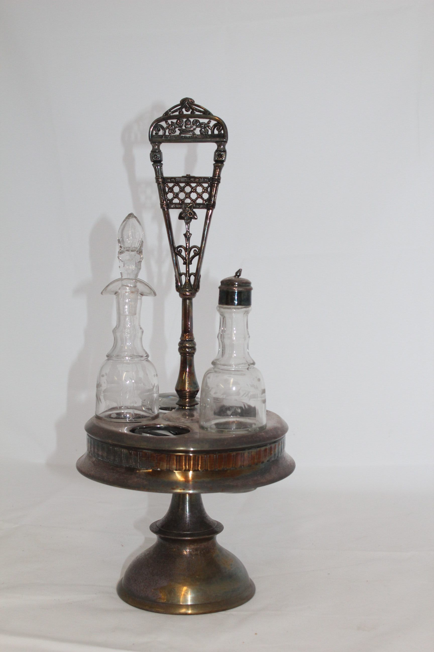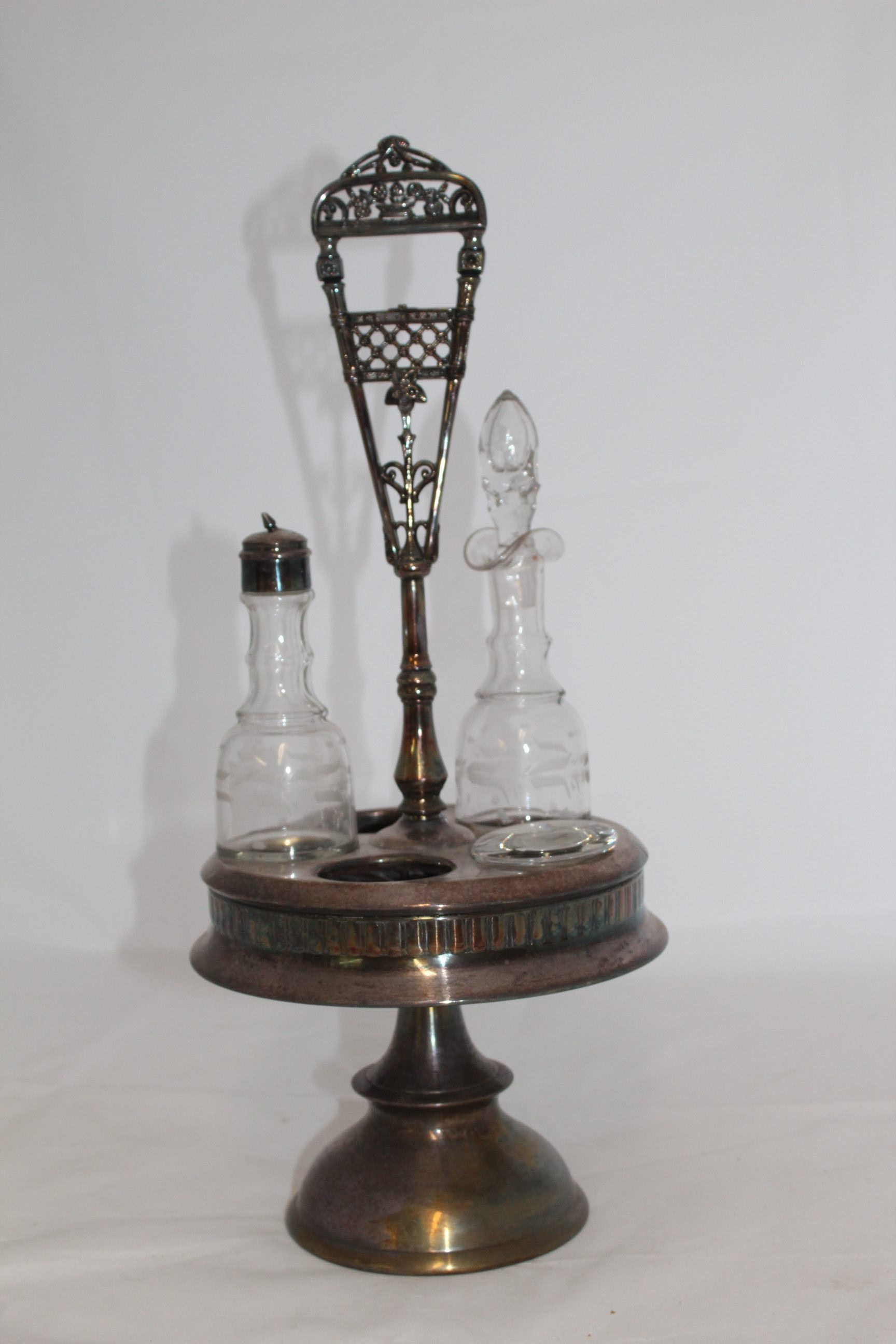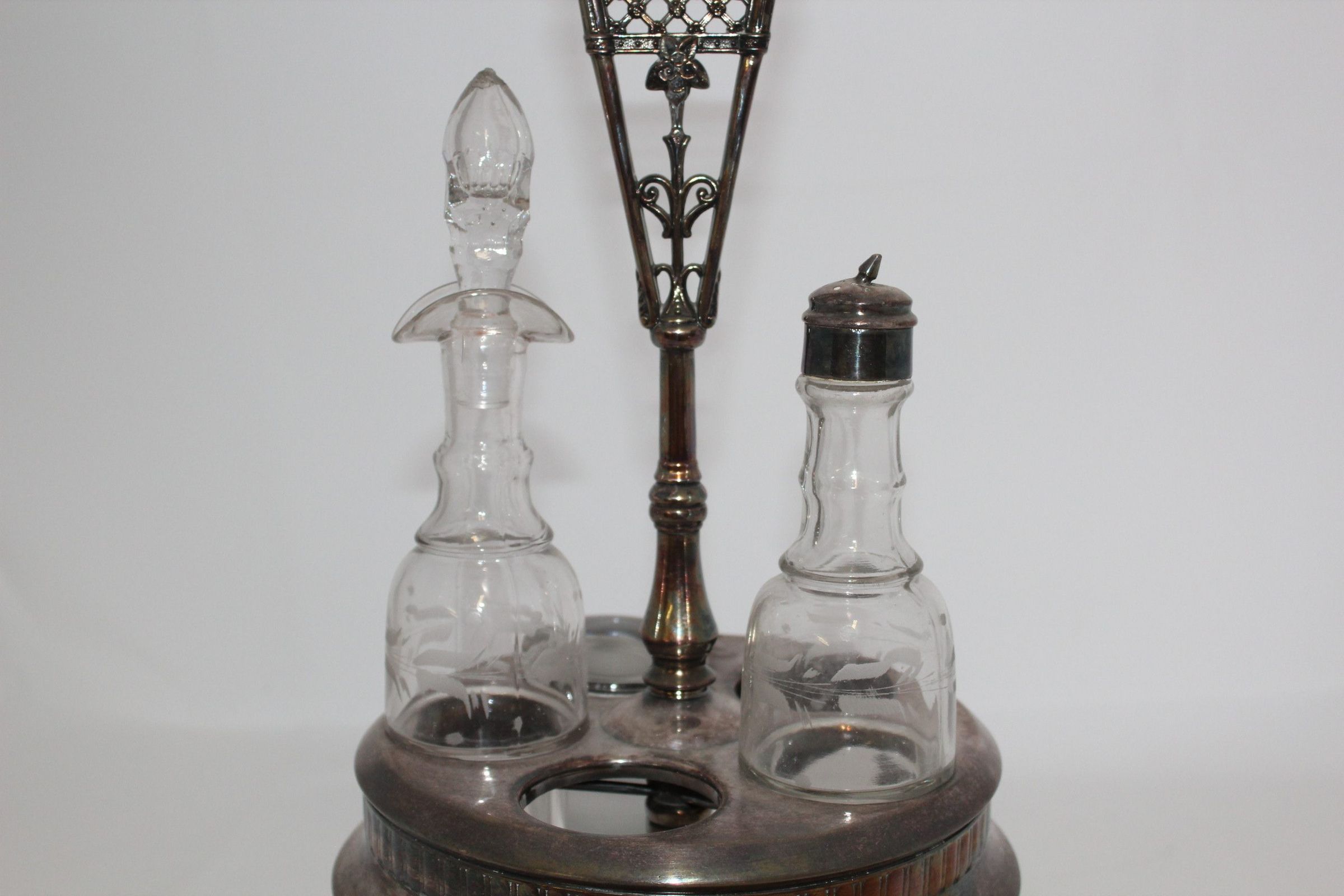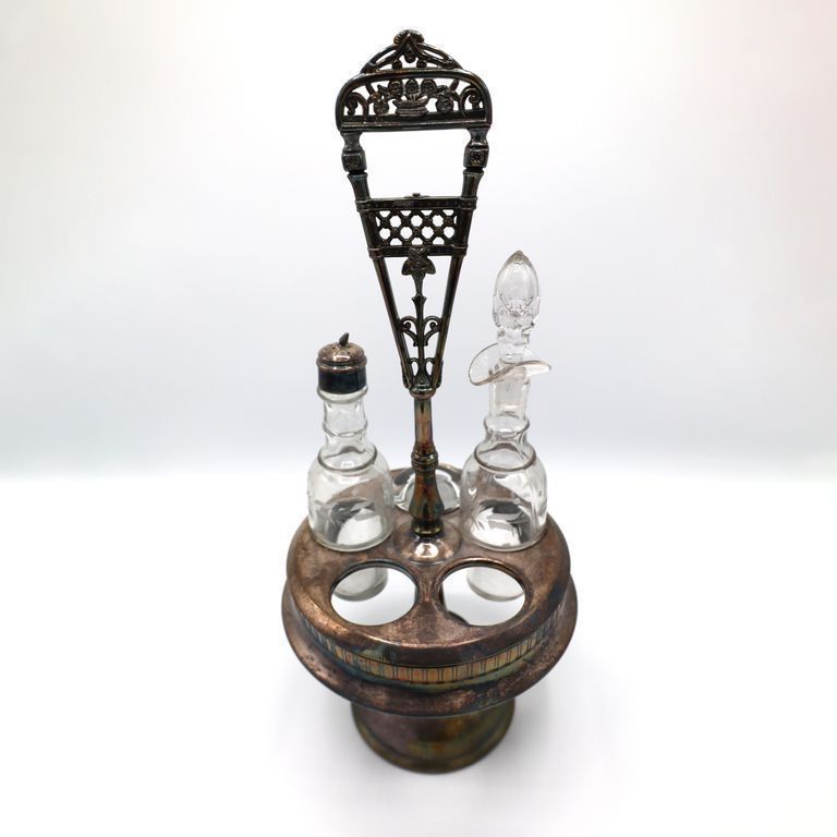 This Victorian cruet set once held five etched bottles, although only two remain. The silver cruet stand features a floral design on the handle and a frieze around the base using classical vertical lines.Cataloged By