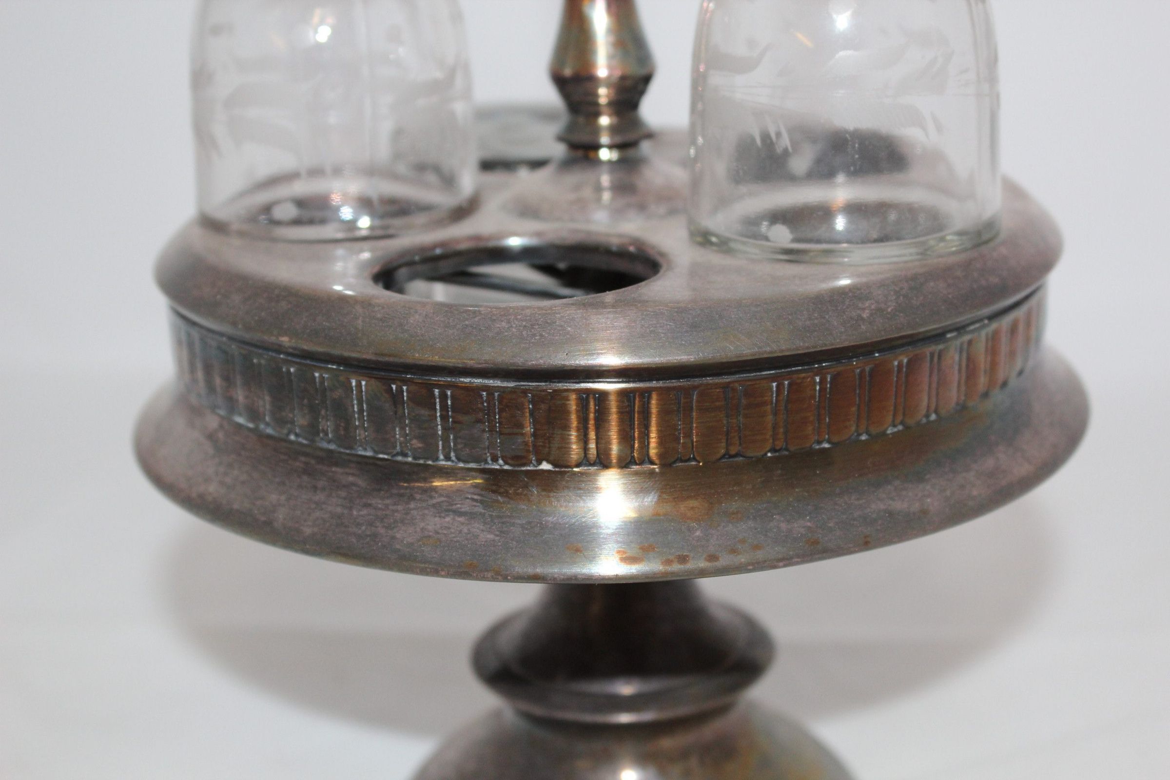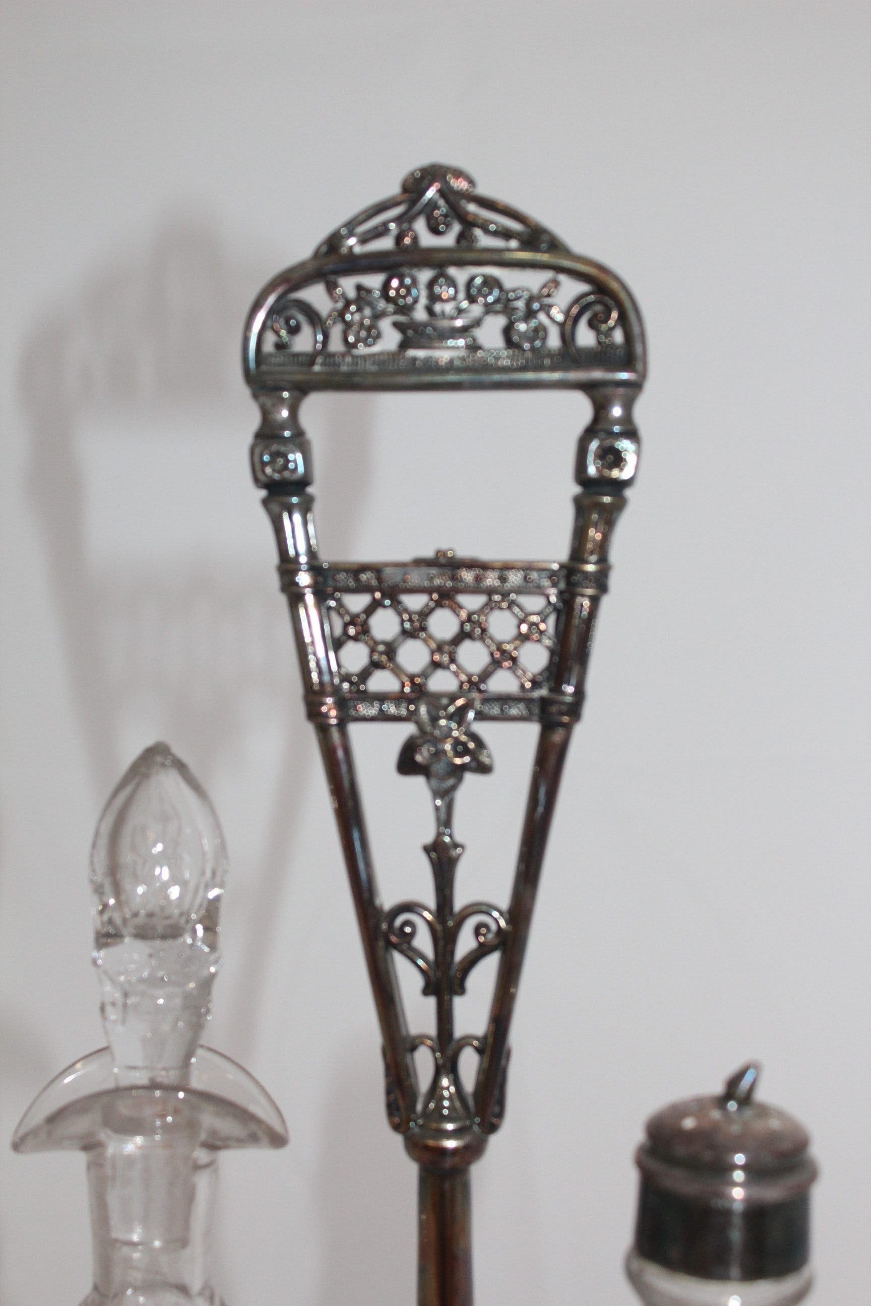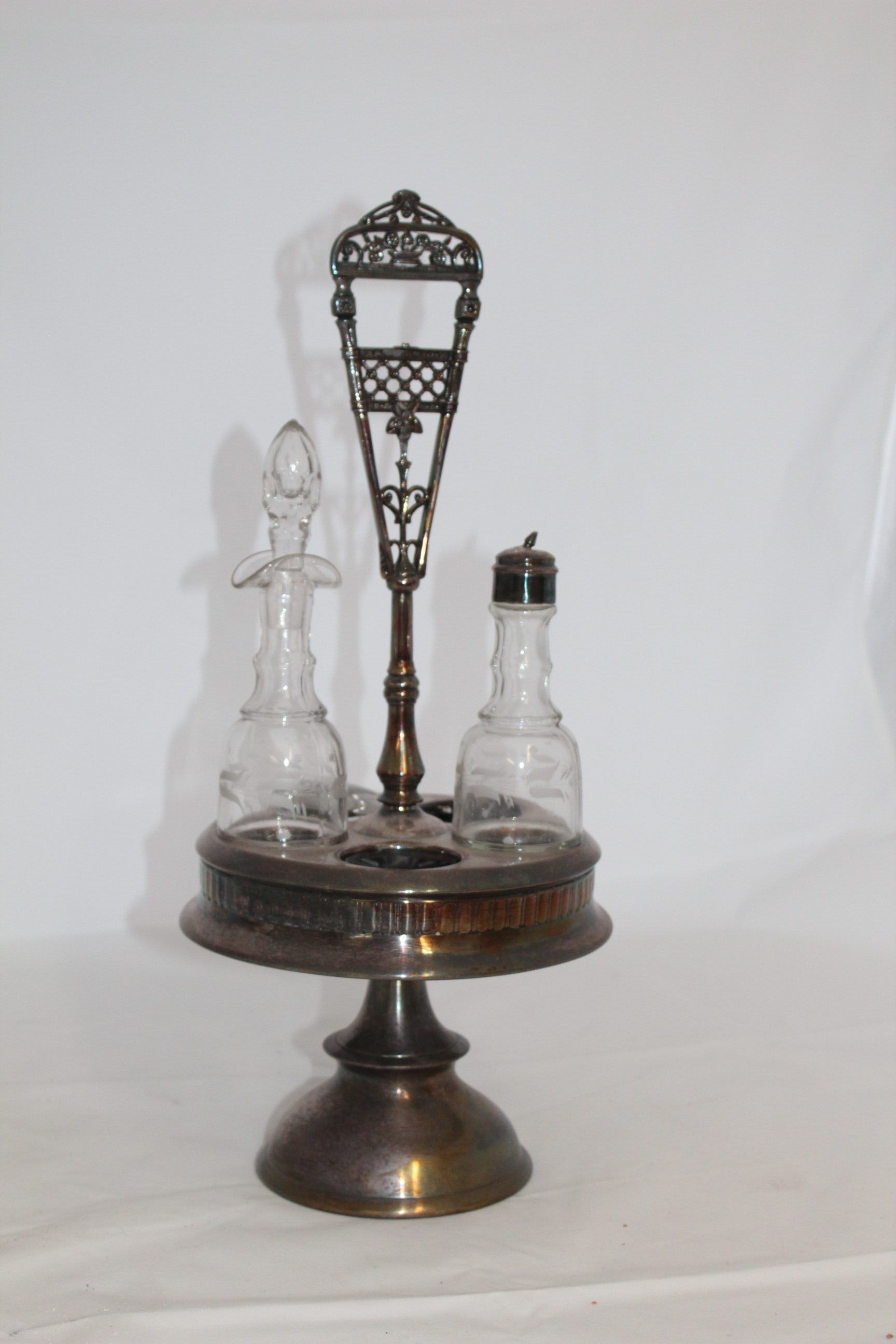 This Victorian cruet set once held five etched bottles, although only two remain. The silver cruet stand features a floral design on the handle and a frieze around the base using classical vertical lines.Cataloged By