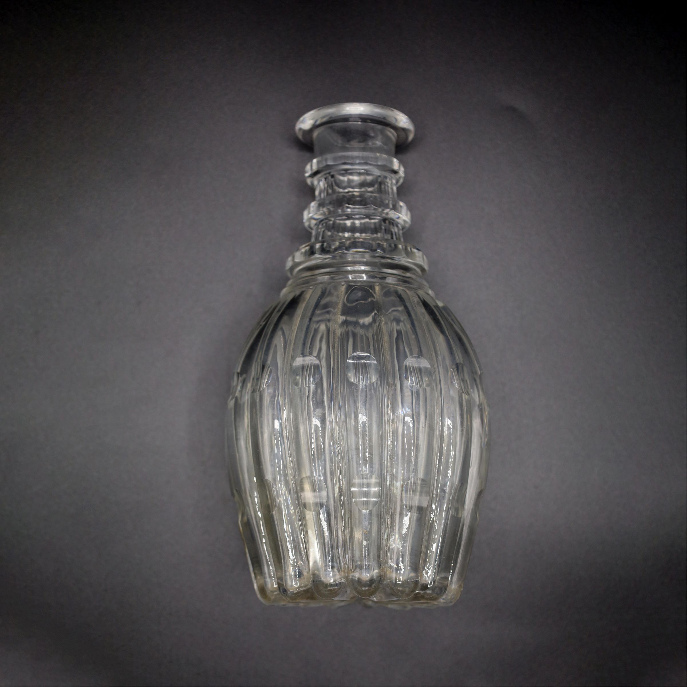 While the date of this specific decanter is not known, the 1820s and 1830s saw the introduction of this classic shape decanter with three neck rings. This decanter is made of colorless glass with flutes from the base to the shoulder. The top of the decanter has a lip to make pouring easier.Location