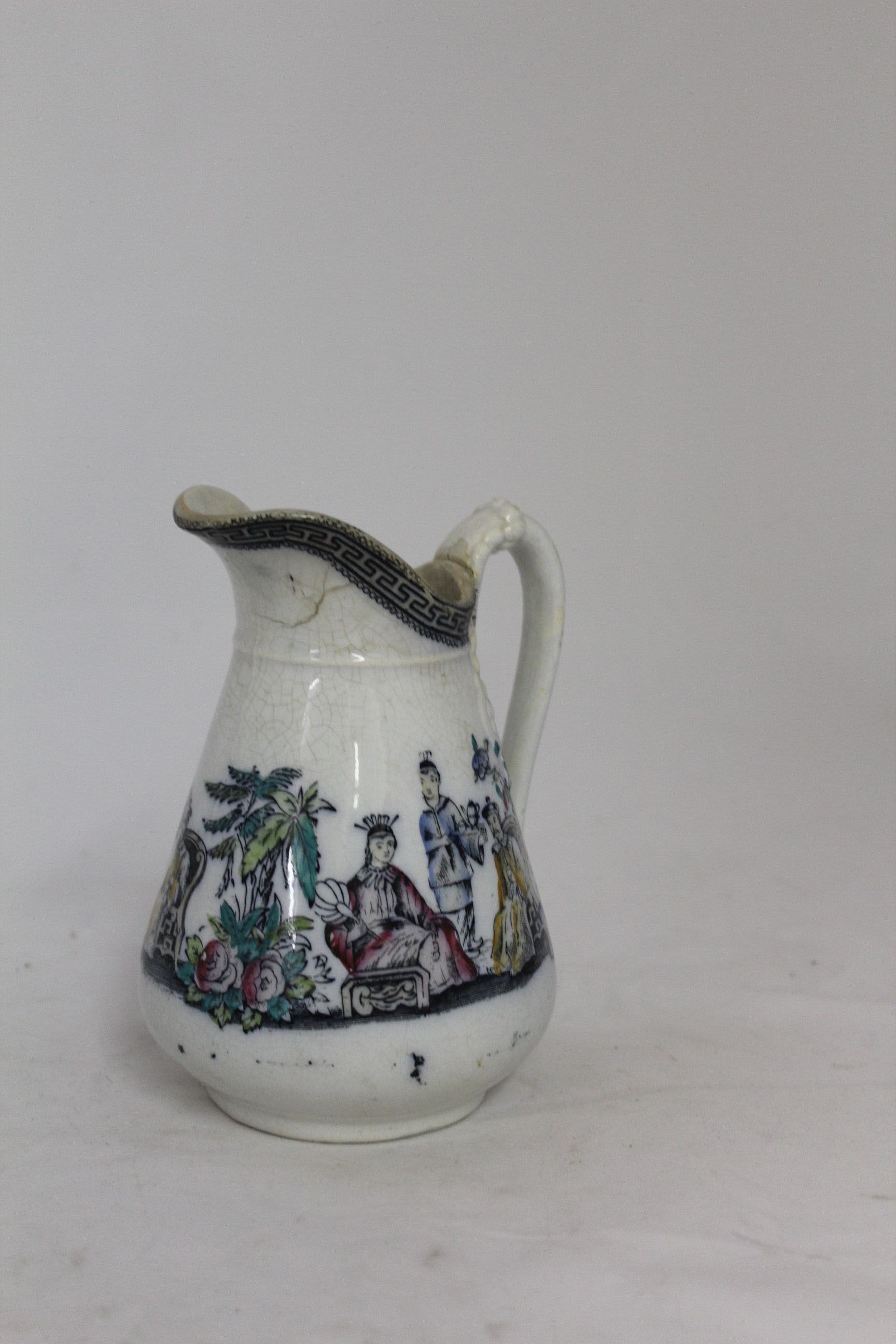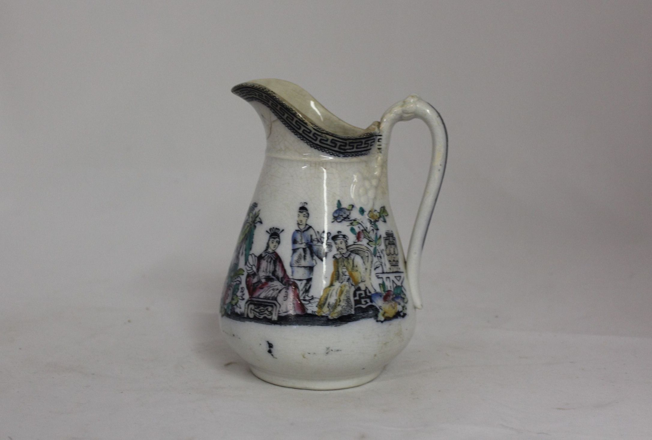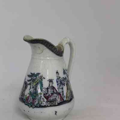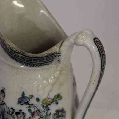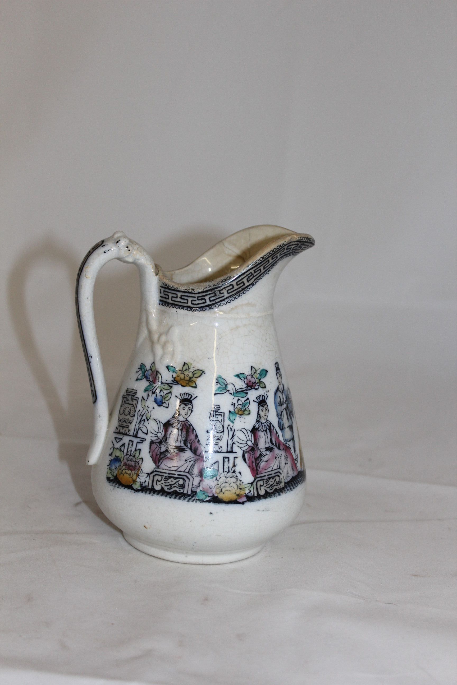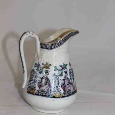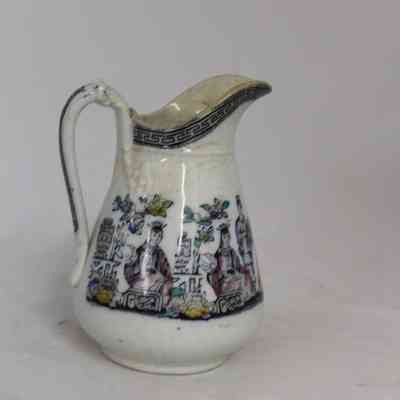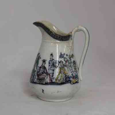 This unmarked ironstone pitcher features a chinoiserie design. Ironstone was developed in the early 19th century. It was a less expensive and more durable alternative to porcelain.Cataloged By
