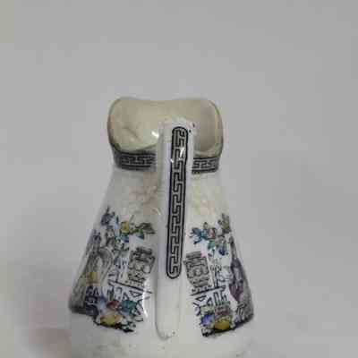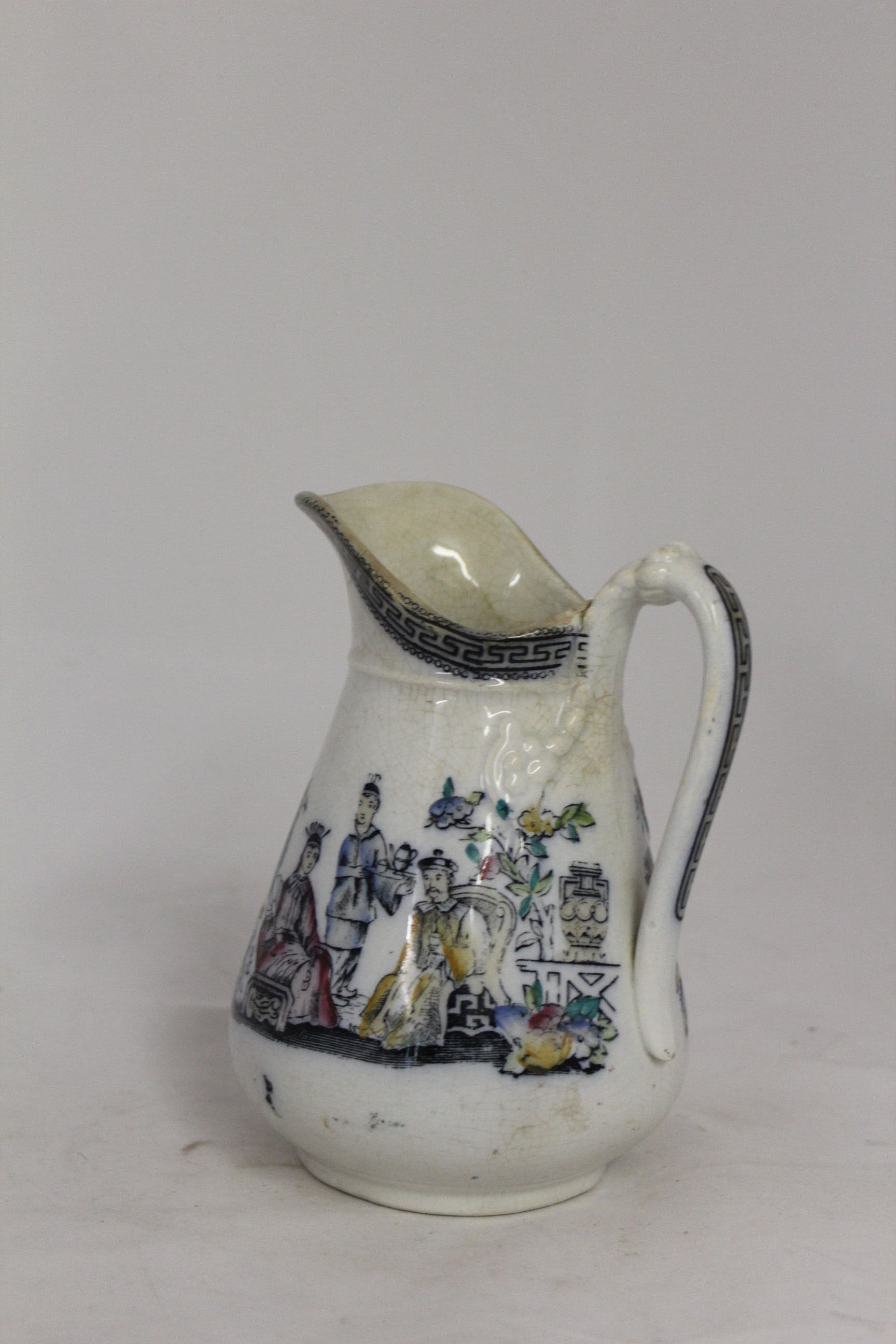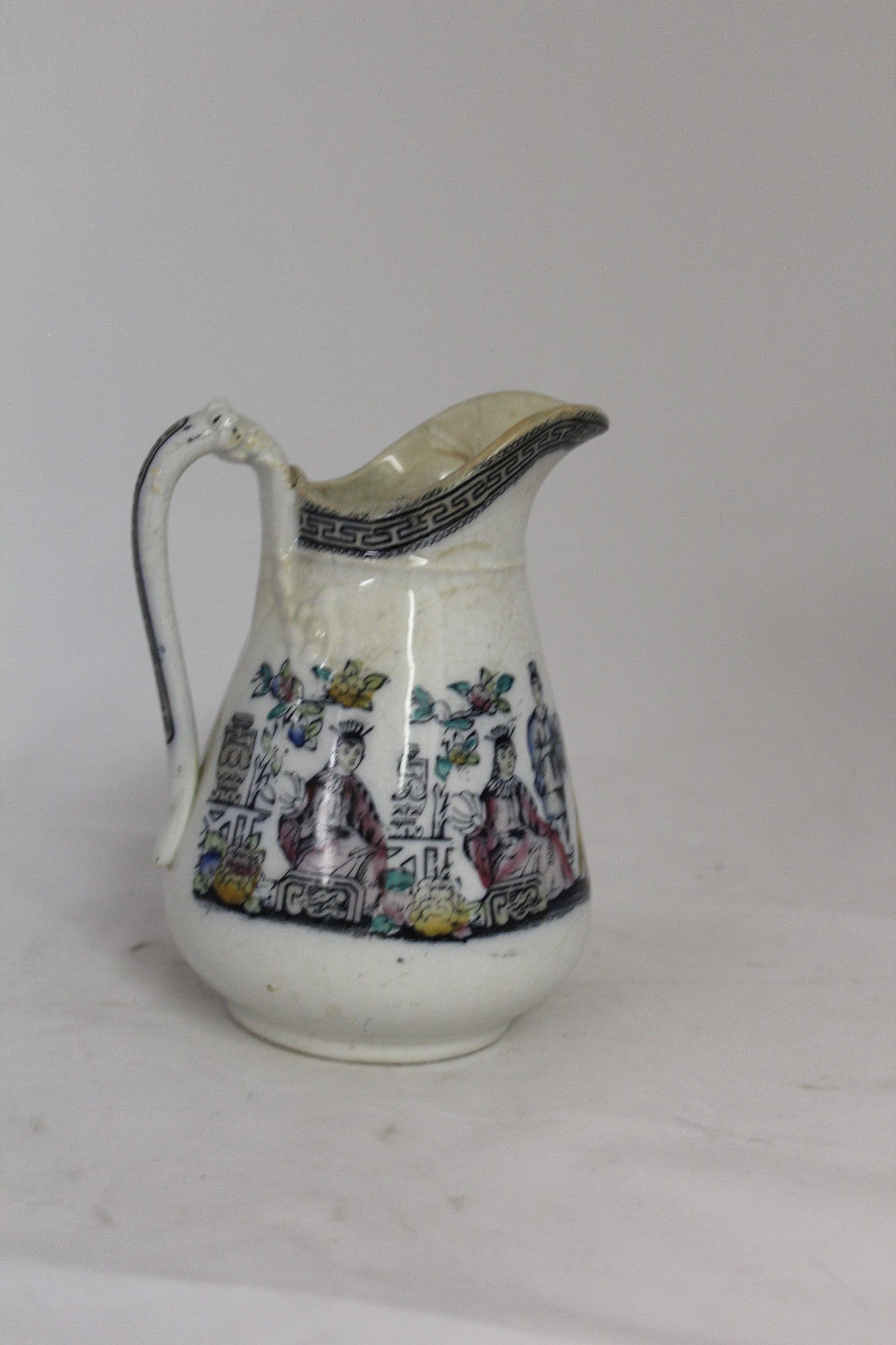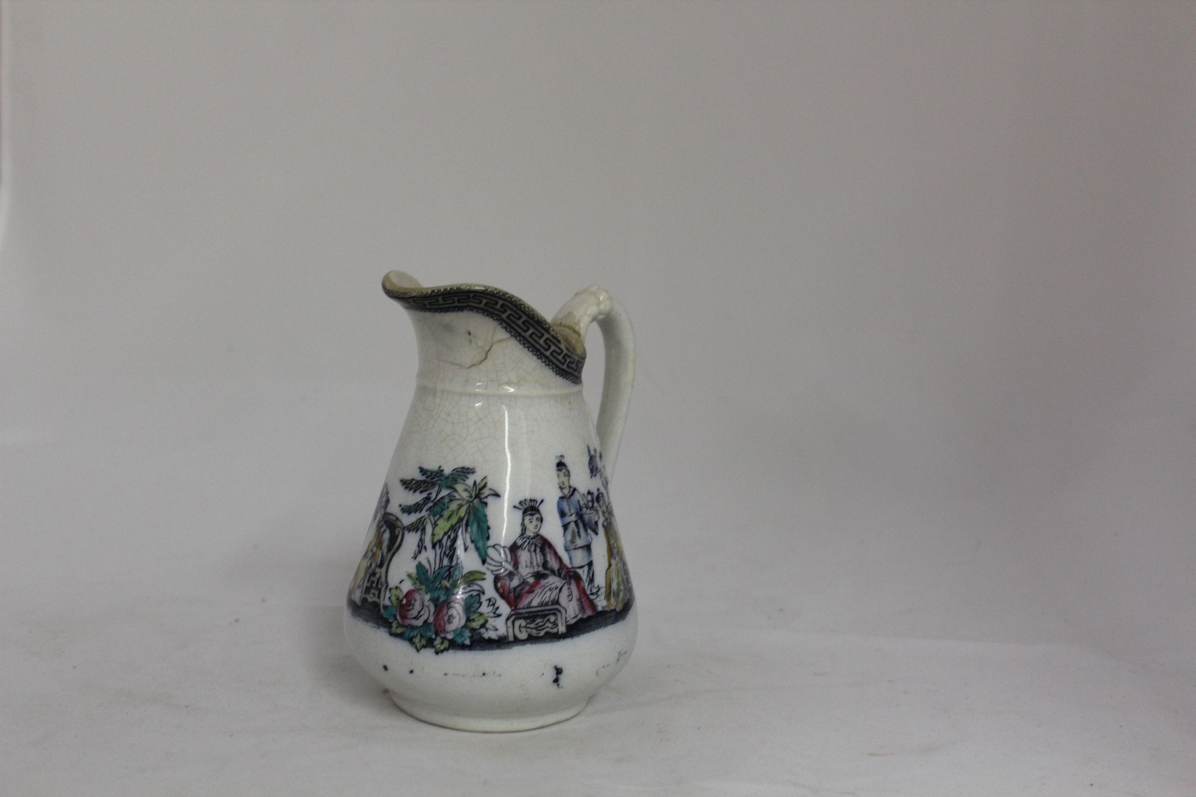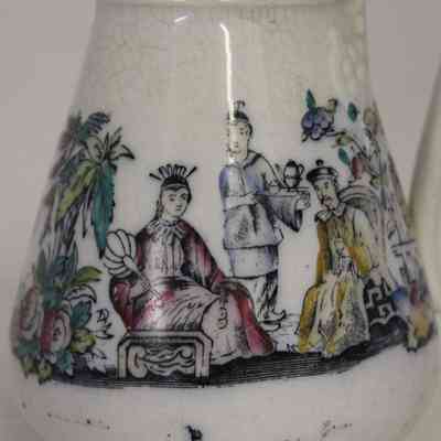This unmarked ironstone pitcher features a chinoiserie design. Ironstone was developed in the early 19th century. It was a less expensive and more durable alternative to porcelain.Cataloged By