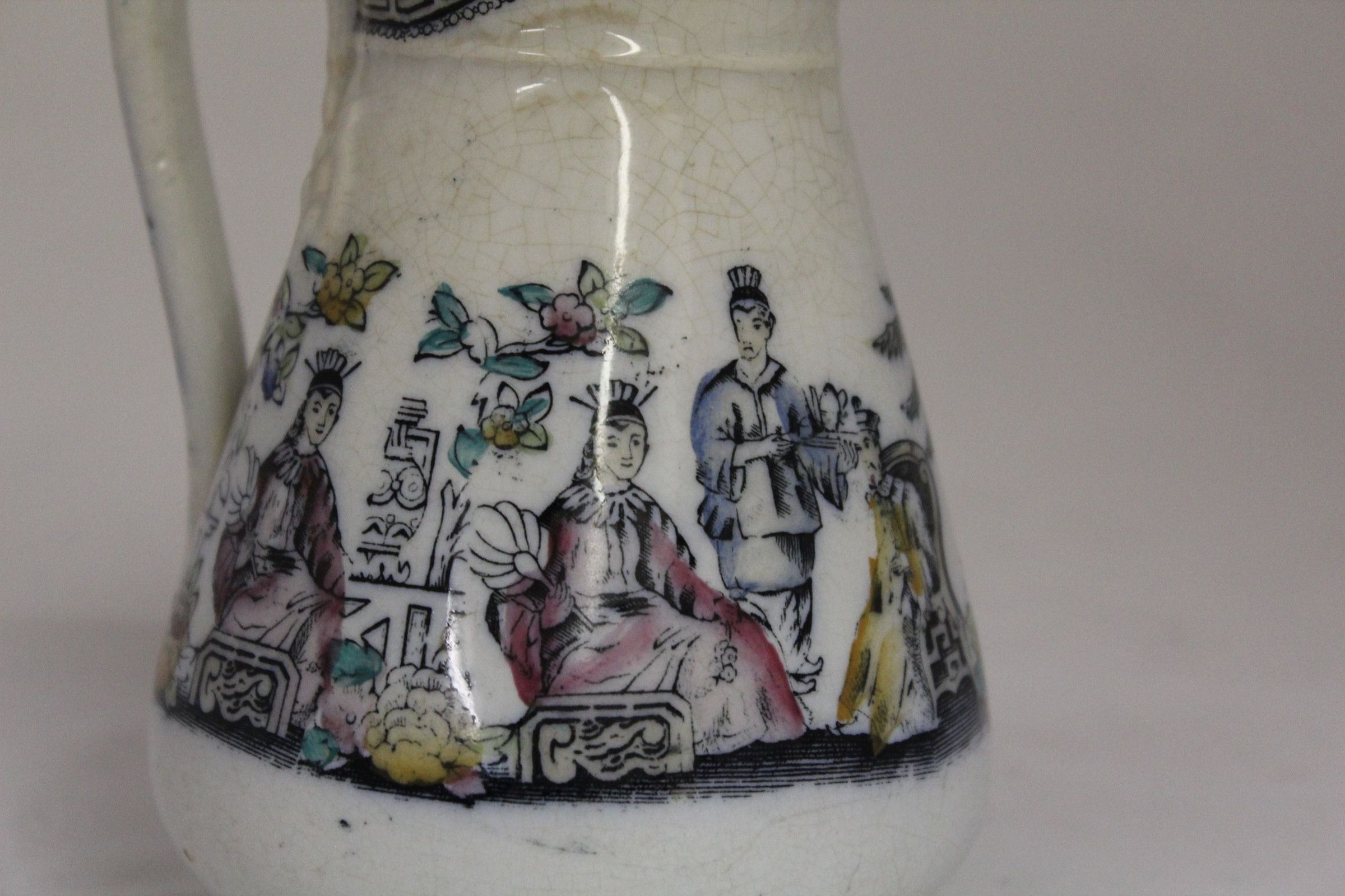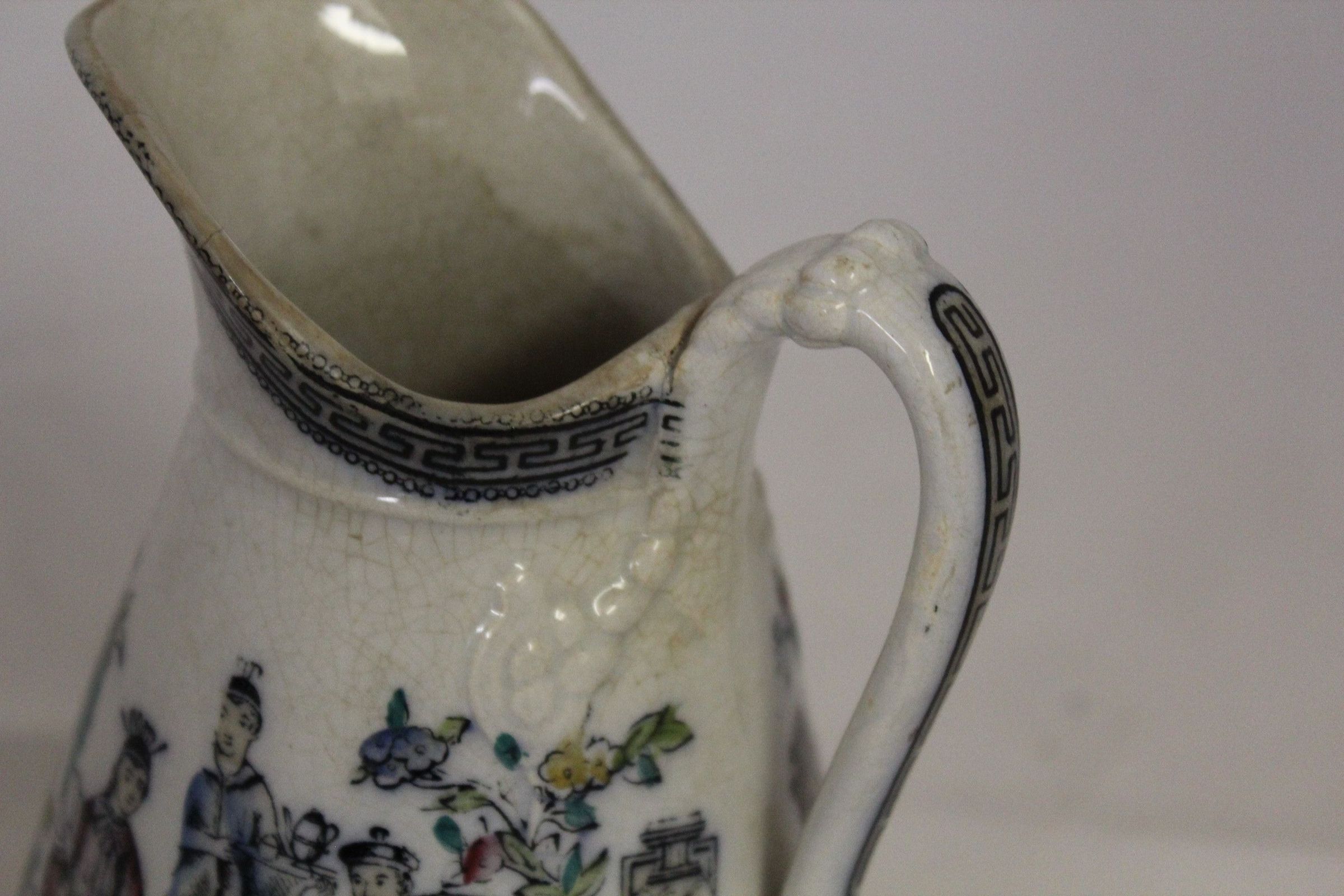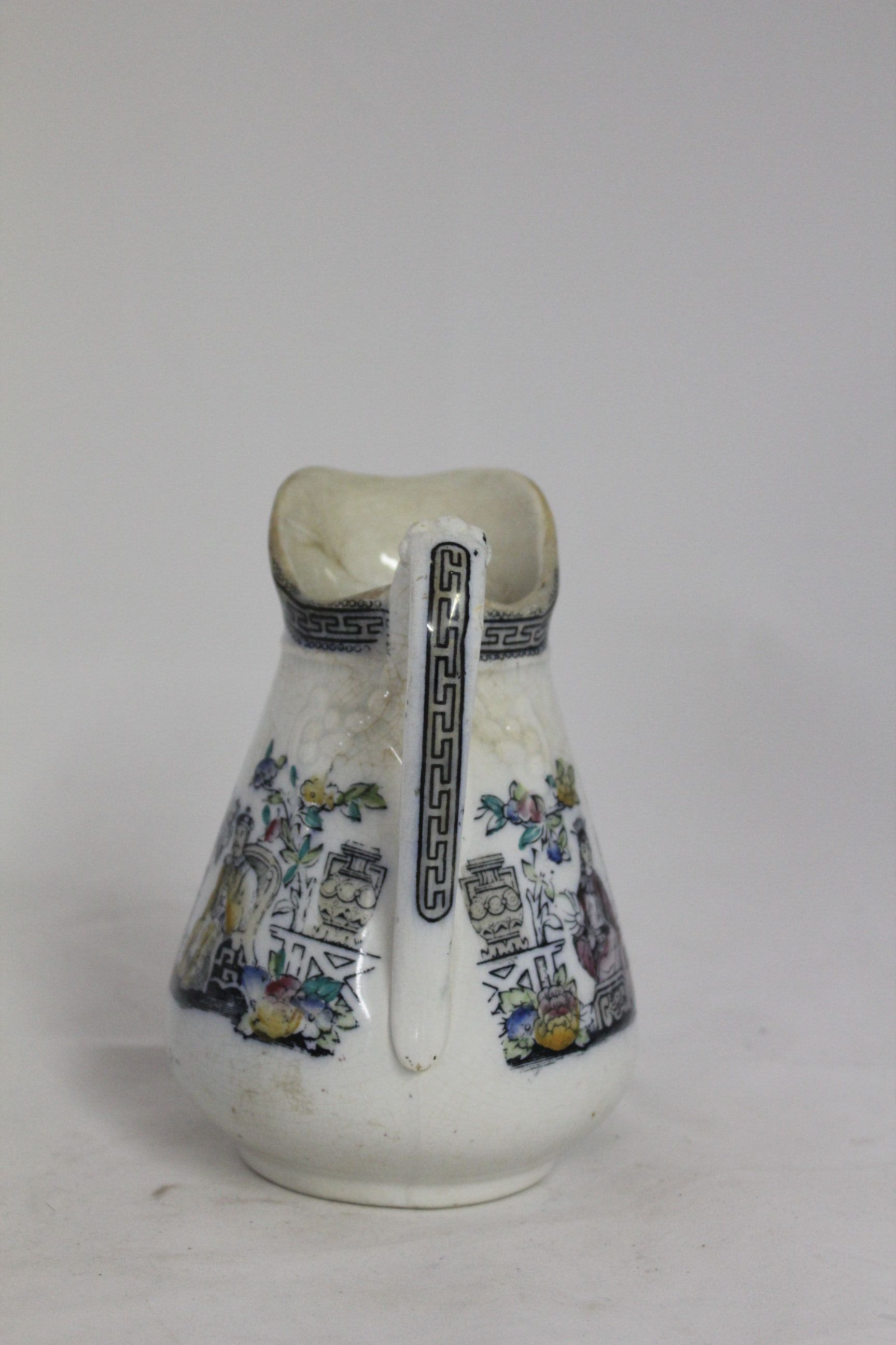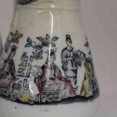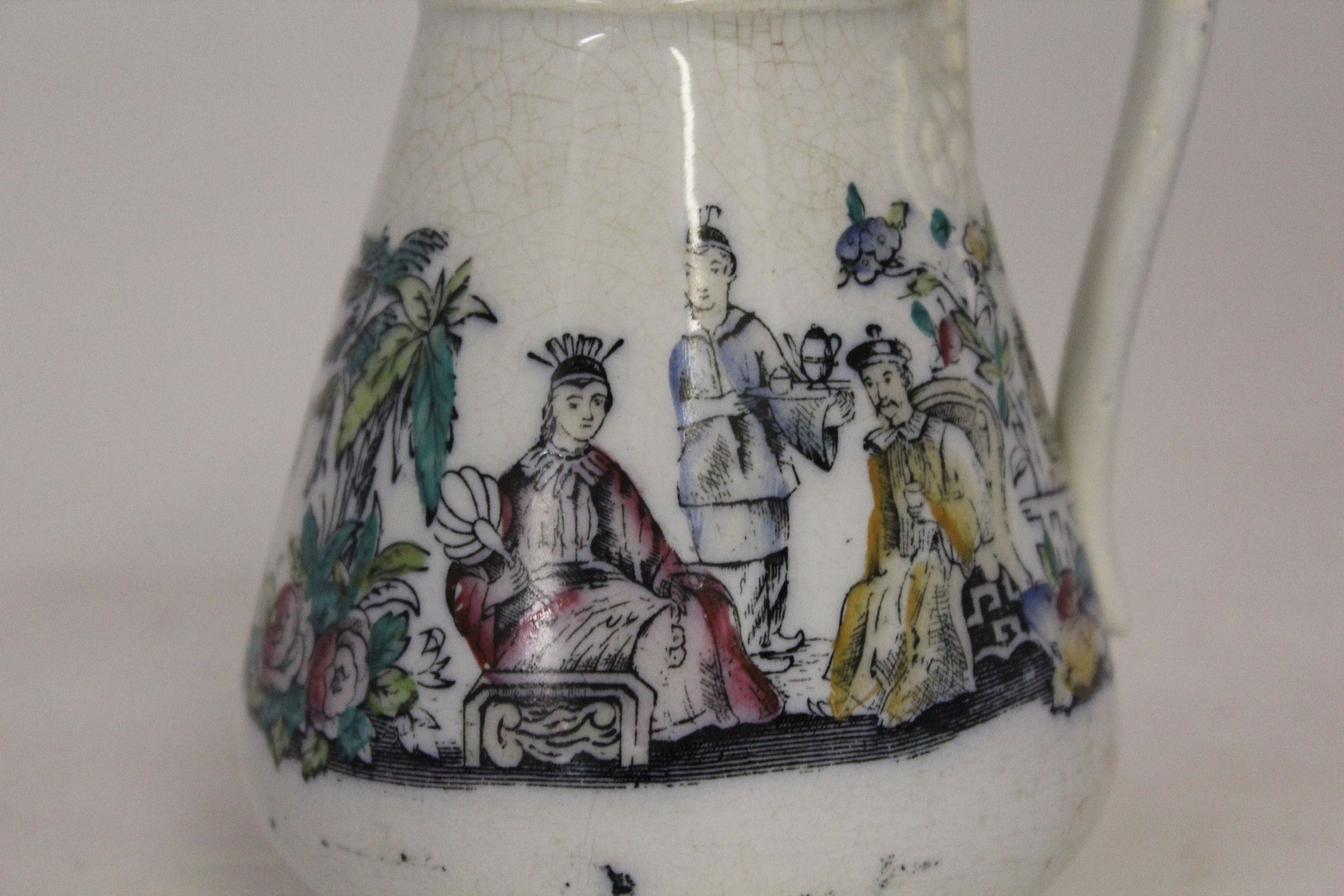 This unmarked ironstone pitcher features a chinoiserie design. Ironstone was developed in the early 19th century. It was a less expensive and more durable alternative to porcelain.Cataloged By