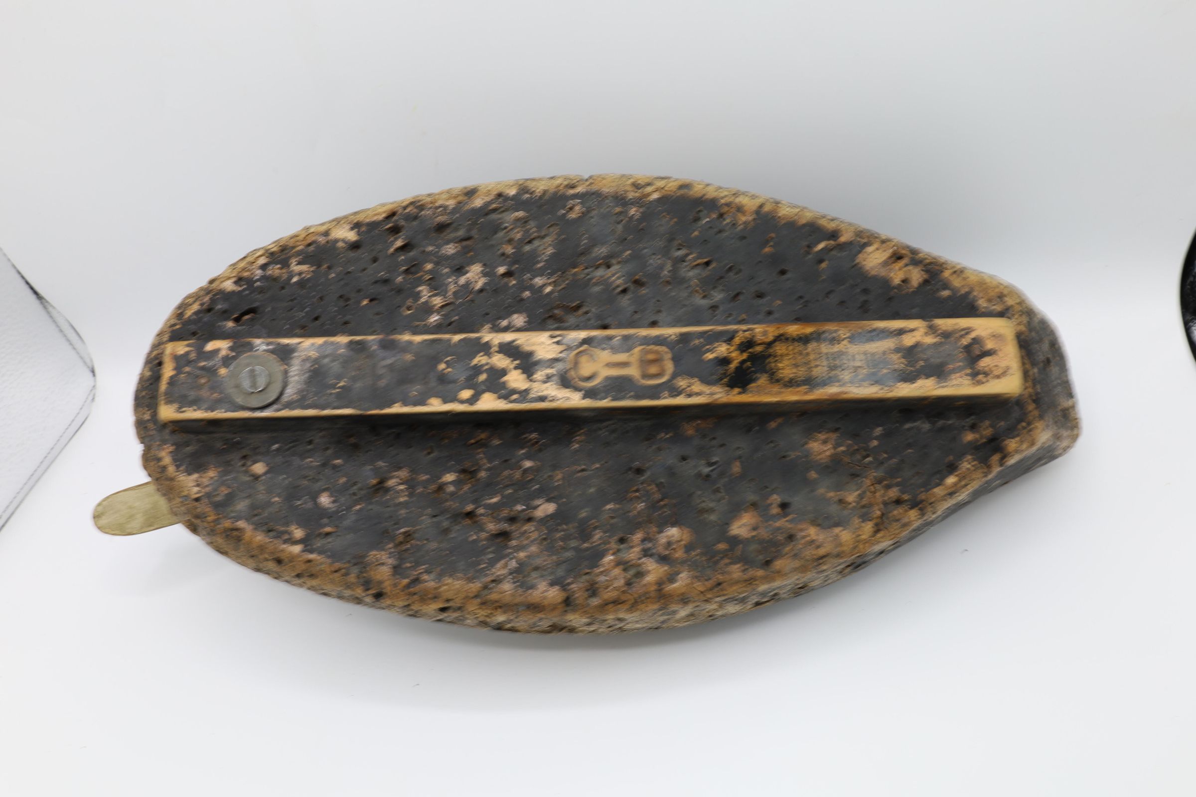 The example here shows apparent wear from use. The paint has worn off over the years, exposing the cork body and some of the balsa wood on the head. The CB stamped on the keel refers to the Casco Bay, Maine, location of Soule's manufacturing plant.Use