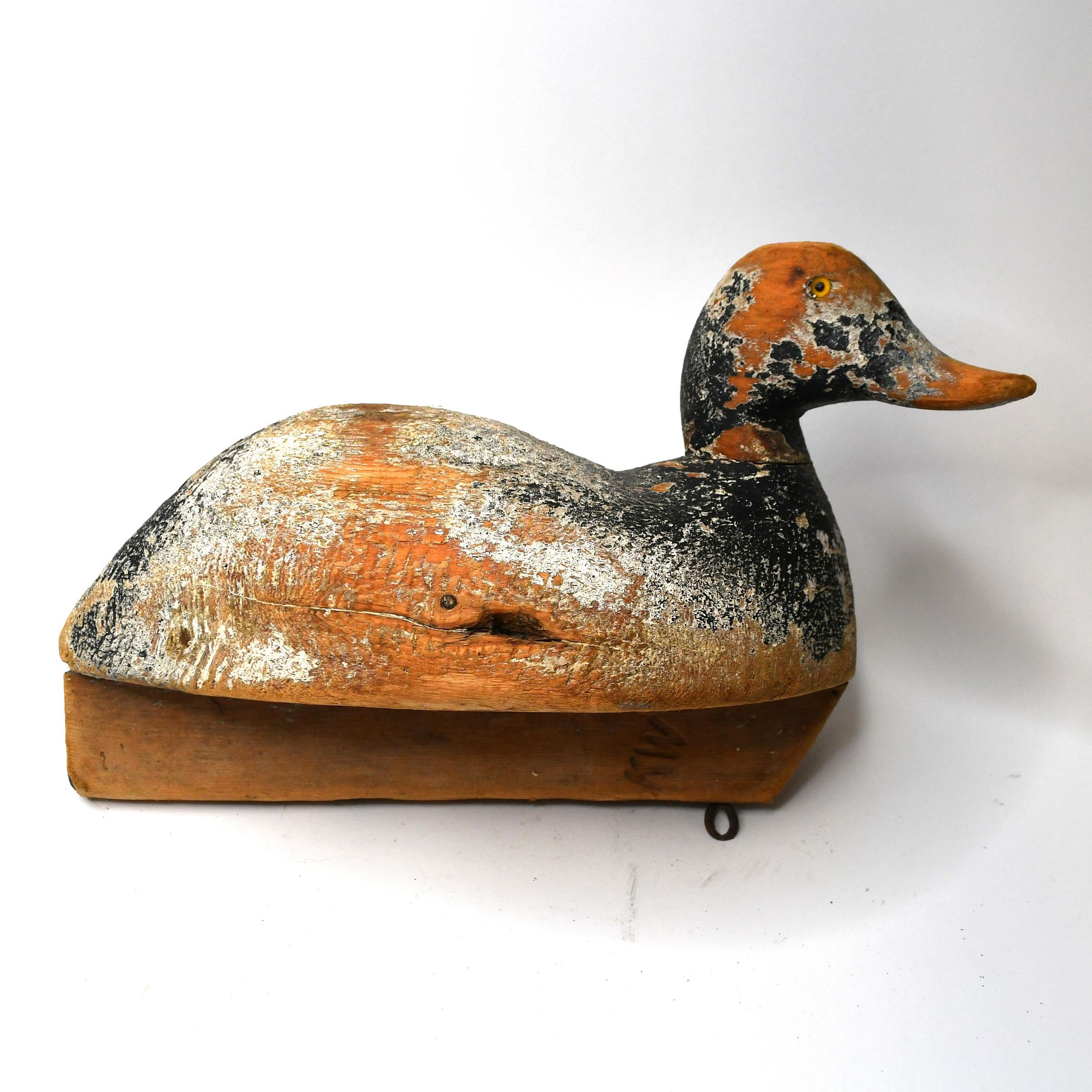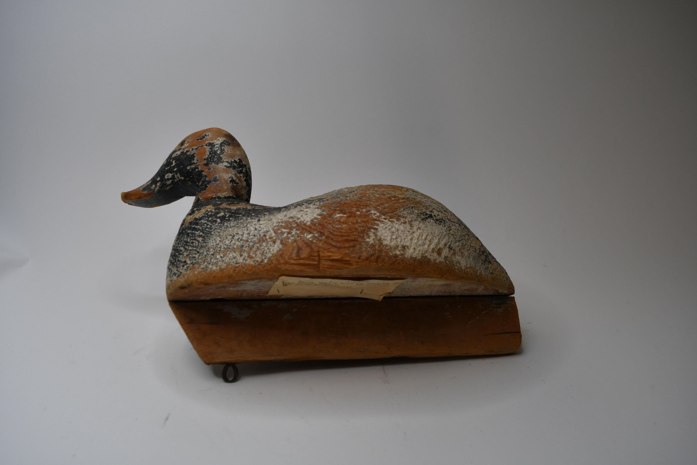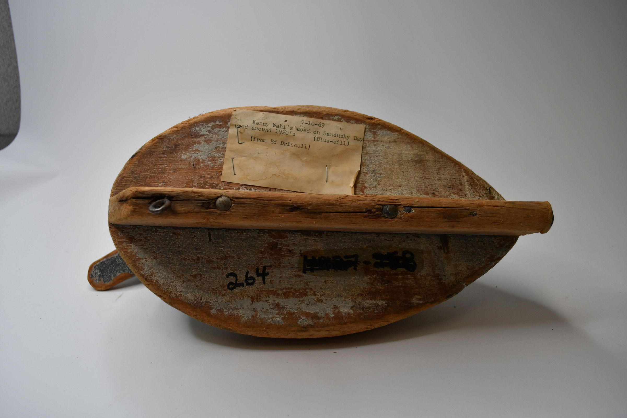 Only a hint of light blue paint remains on this decoy to indicate it is a Bluebill, or Scaup. There are both Greater and Lesser Scaup in the United States, but both are diving ducks, meaning they dive under the water to capture water invertebrates and plants. The decoy was carved by Ken Wahl and used in Sandusky Bay during the 1920s.Location