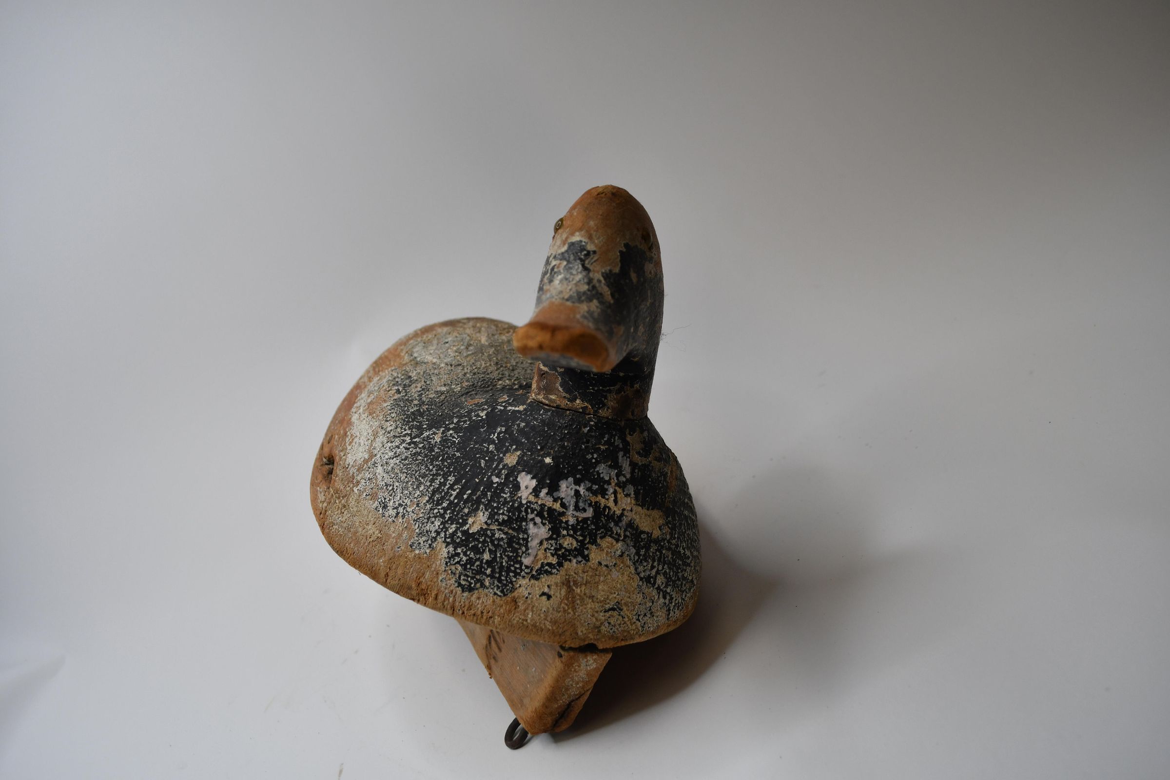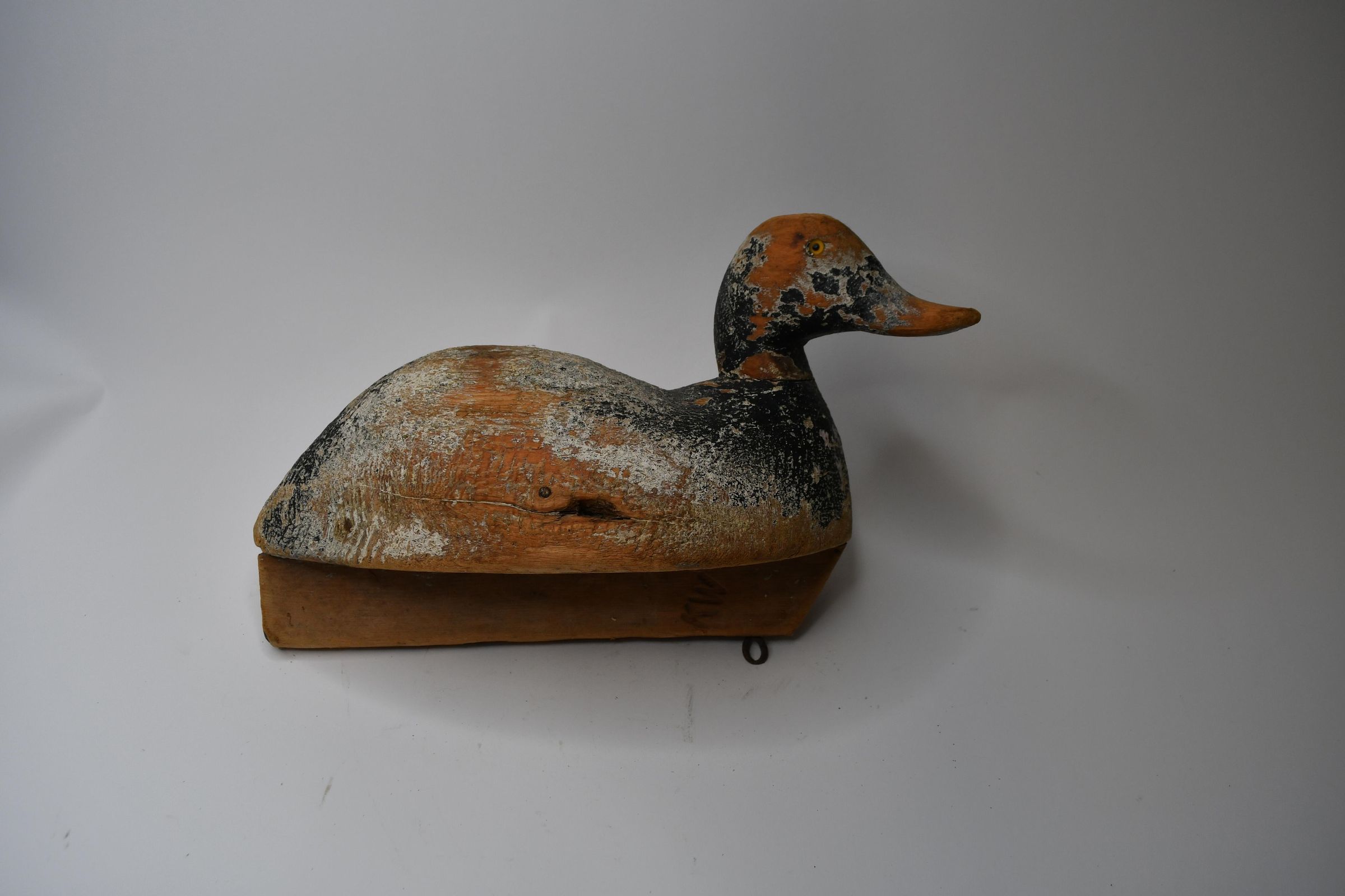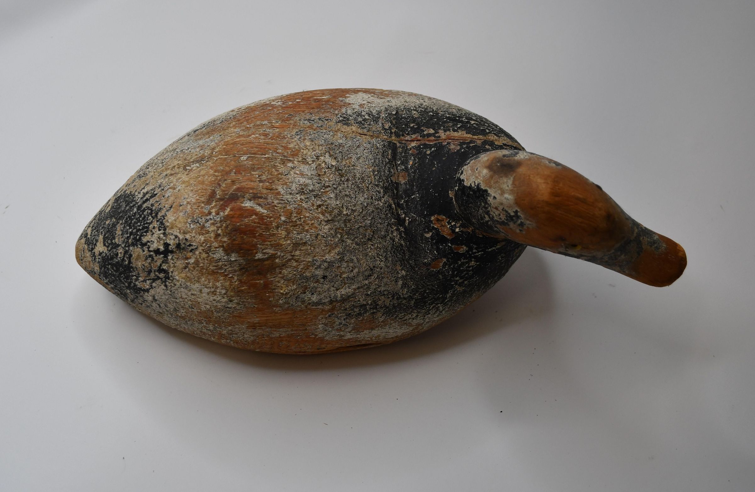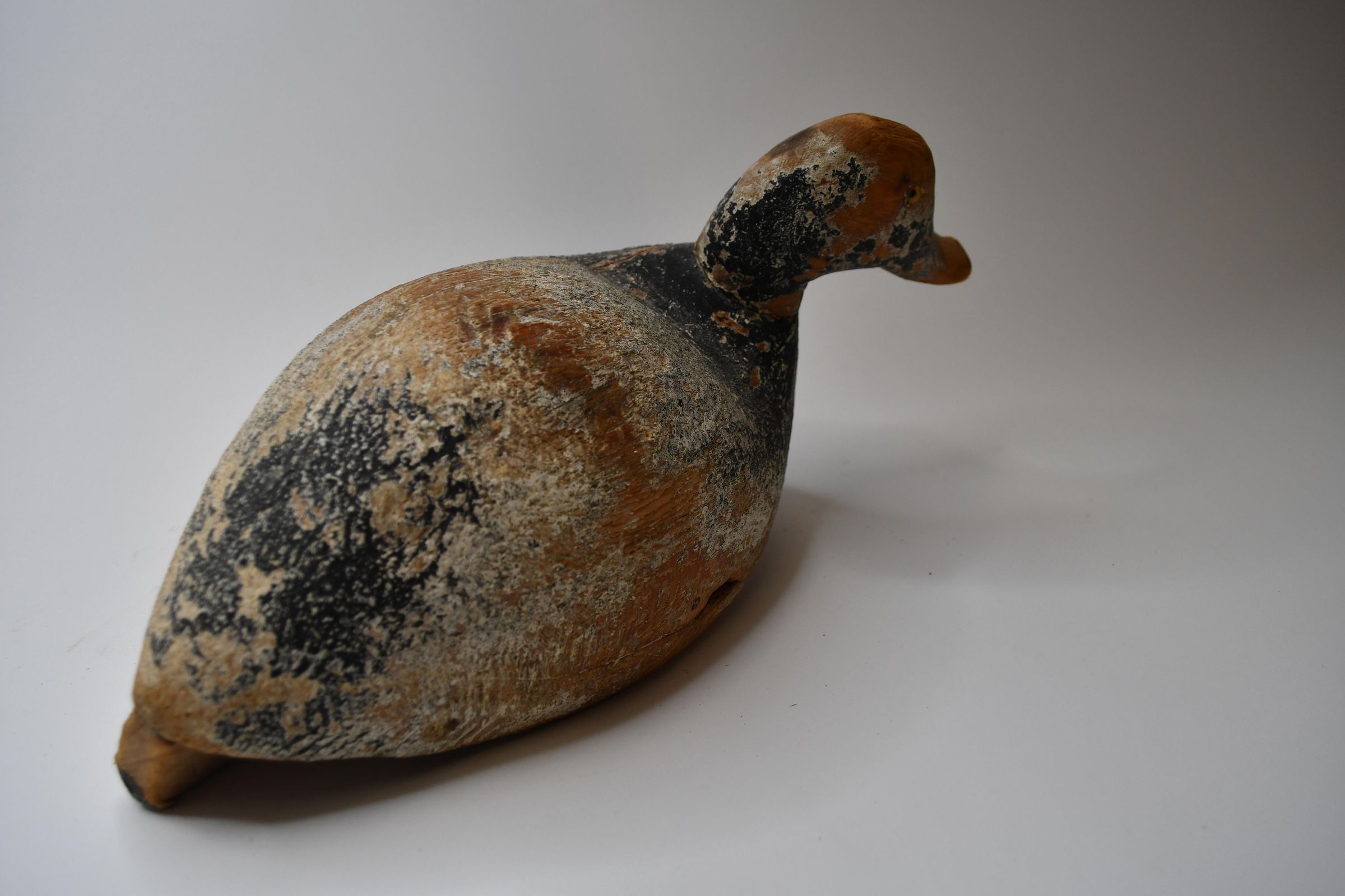 Only a hint of light blue paint remains on this decoy to indicate it is a Bluebill, or Scaup. There are both Greater and Lesser Scaup in the United States, but both are diving ducks, meaning they dive under the water to capture water invertebrates and plants. The decoy was carved by Ken Wahl and used in Sandusky Bay during the 1920s.Location