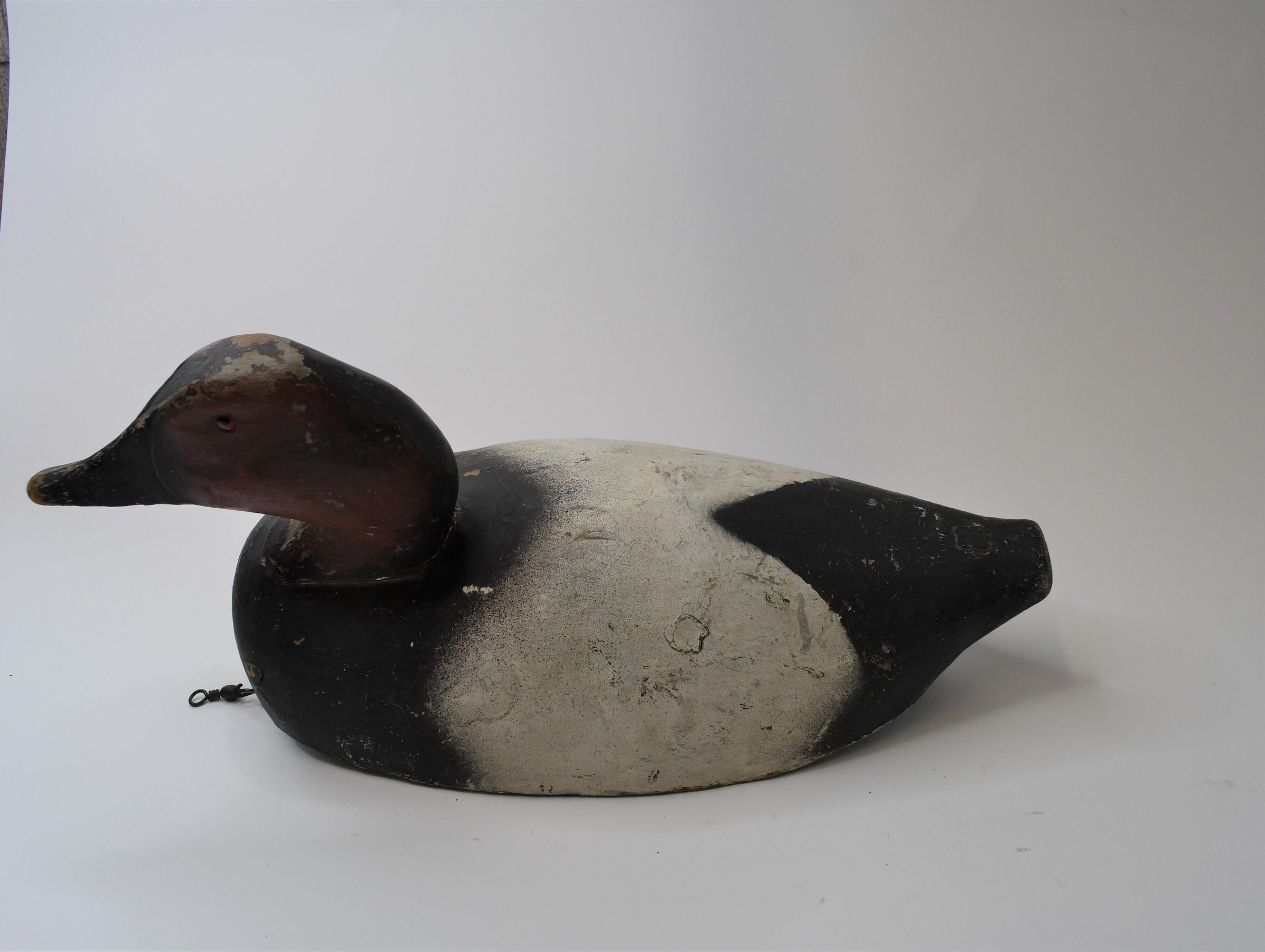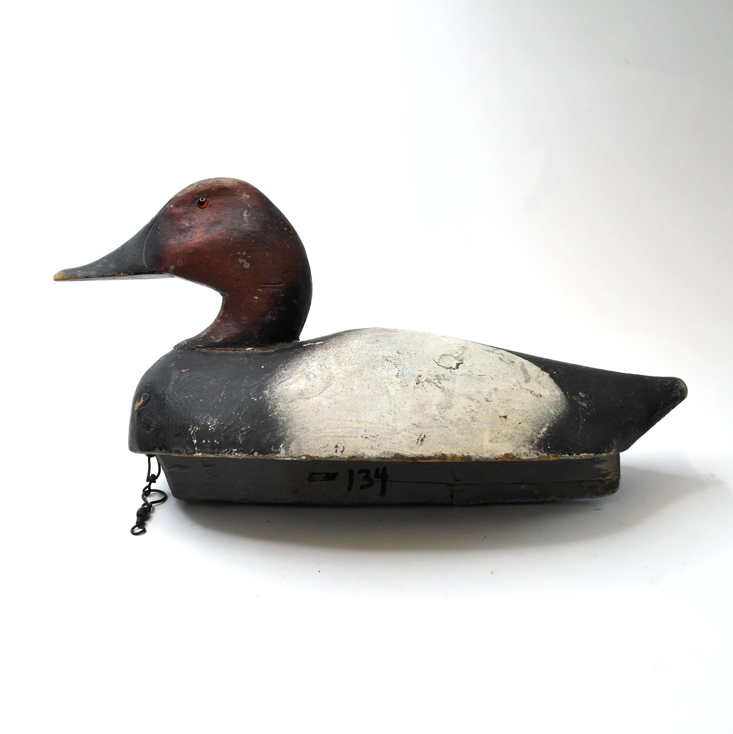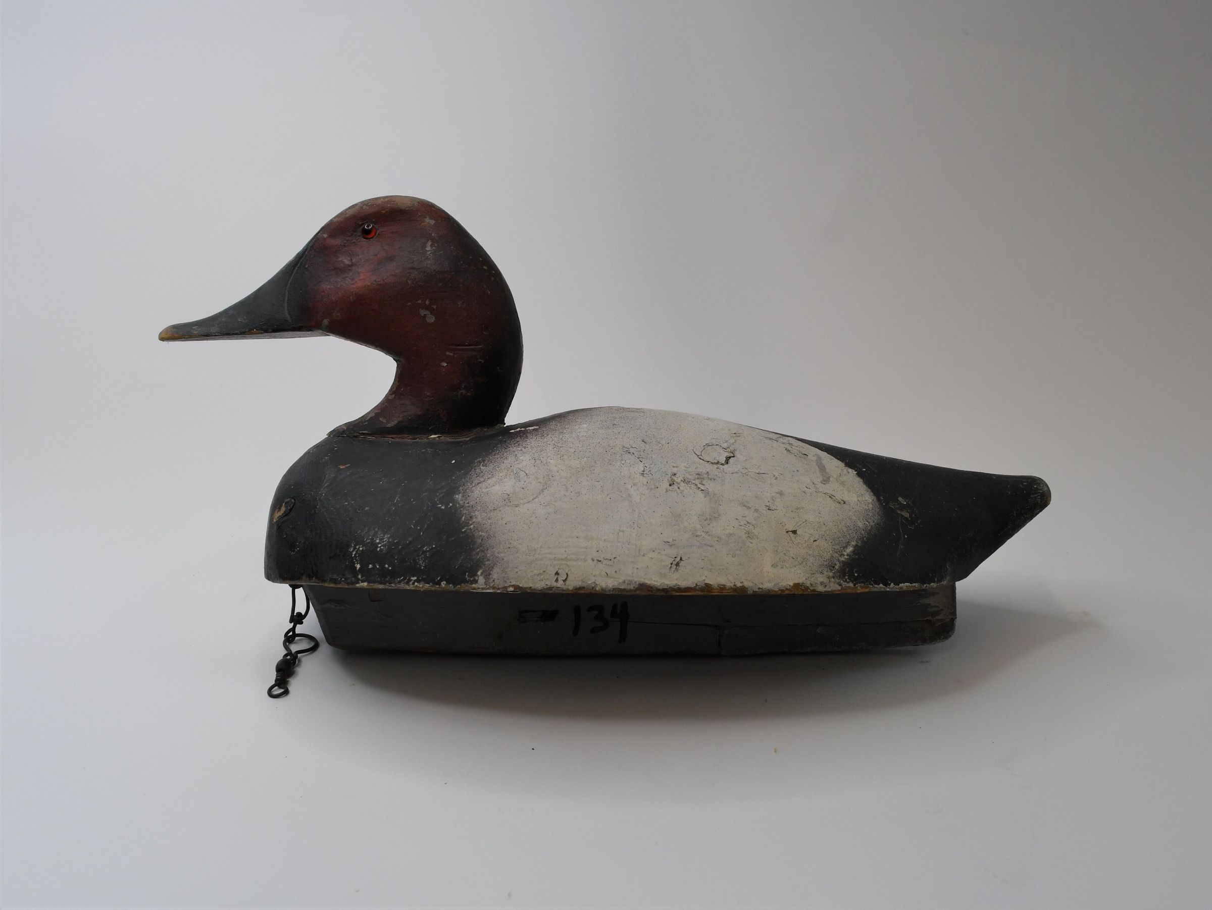Attributed to the Wildfowler Decoy Company, which opened in Saybrook, Connecticut in 1939, this Canvasback has a pine body and glass eyes. The underside of the decoy shows the full-length keel and the swivel used to connect the decoy to a line of others when deployed in the water.Location