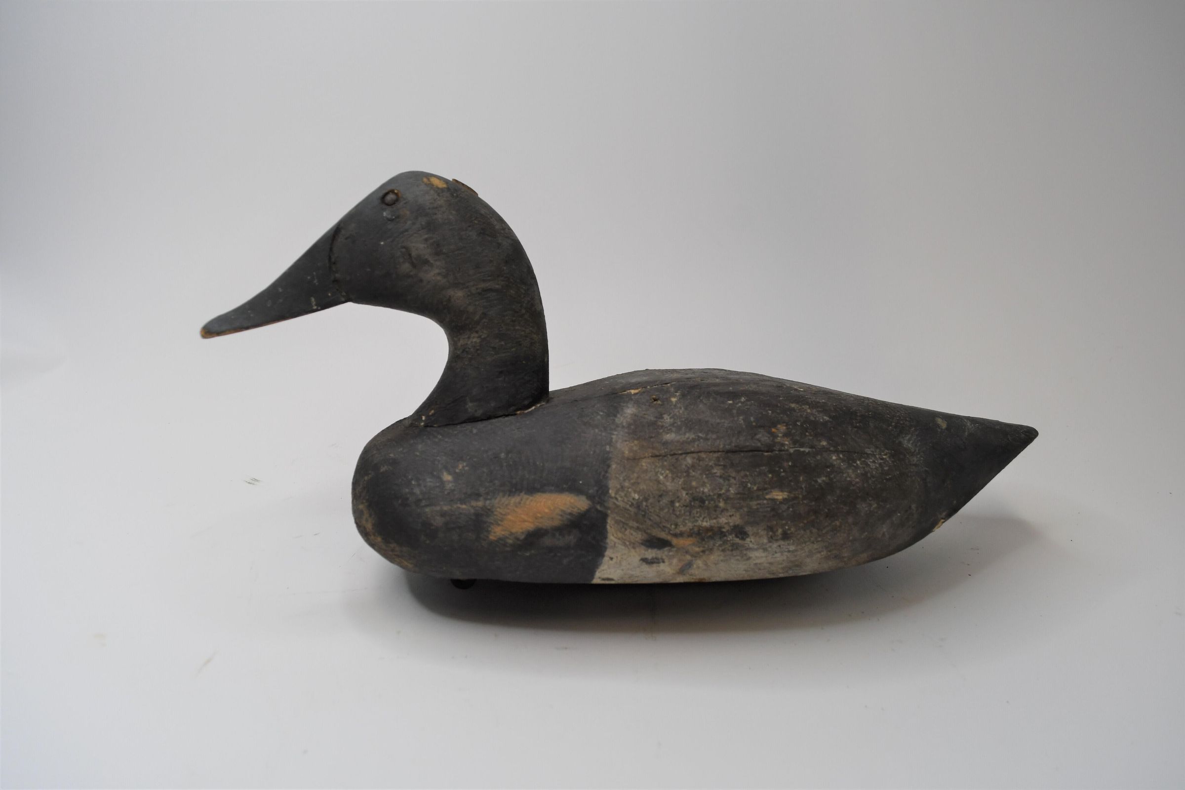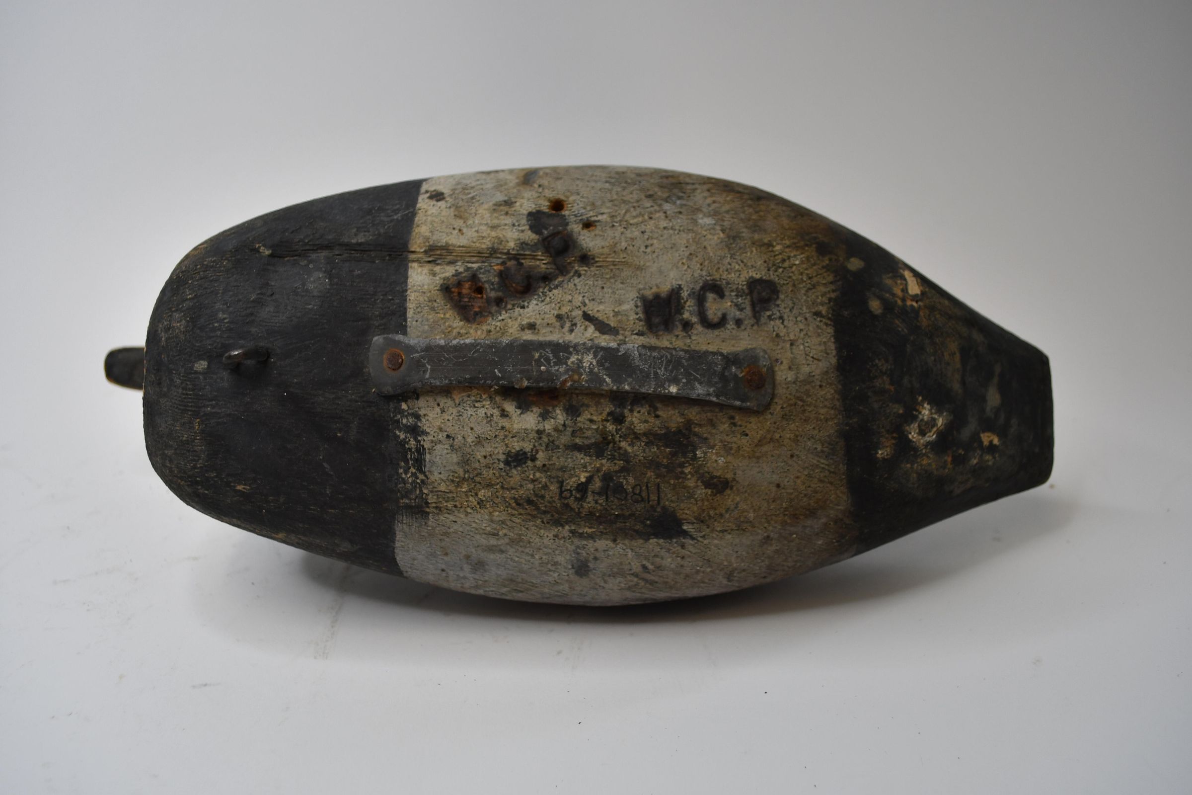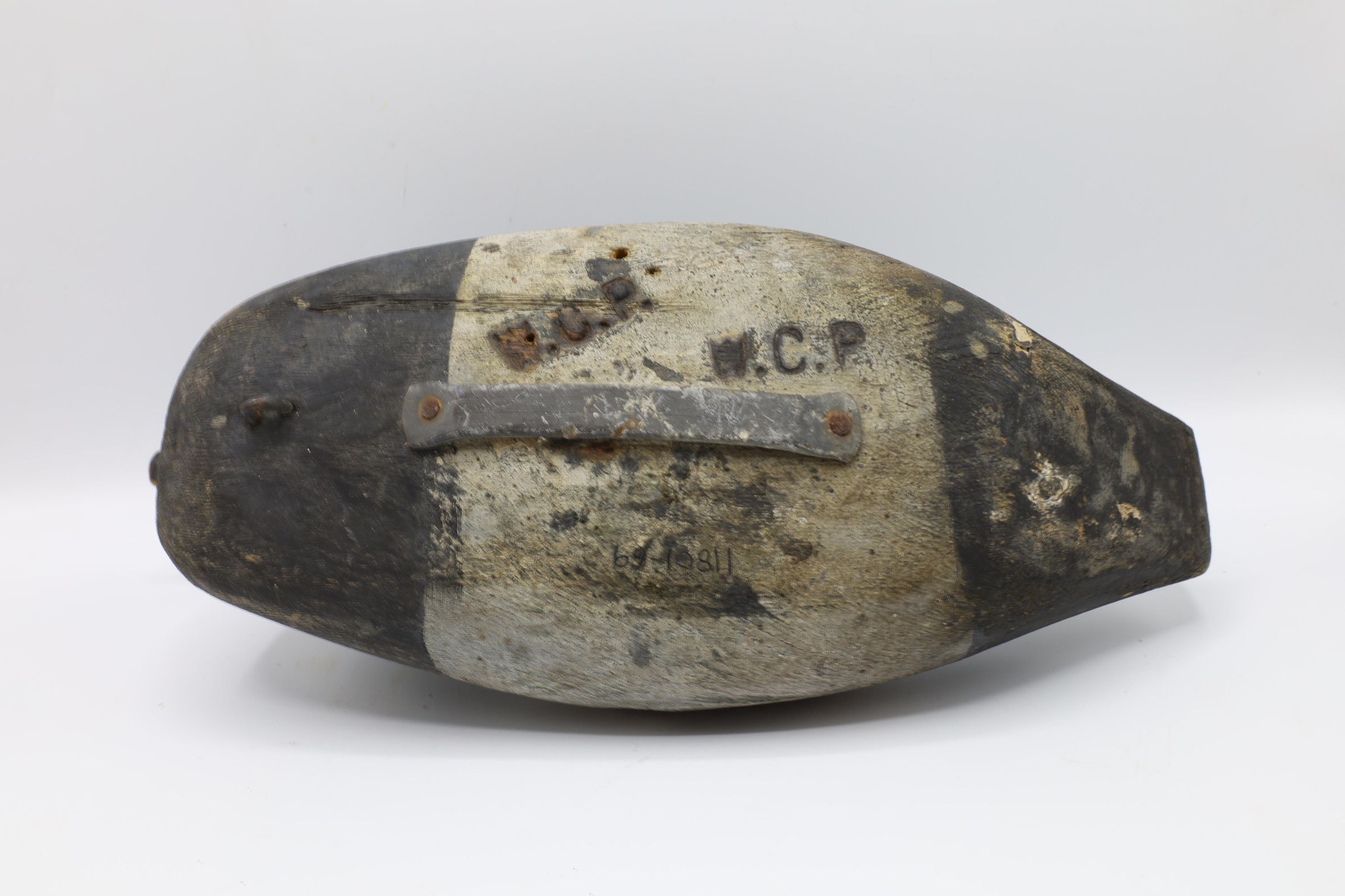 This black and white decoy, carved from pine, dates back to the 1870s. It was used in Sandusky Bay. The head of this decoy pins onto the body. WCP is stamped on the bottom.Use