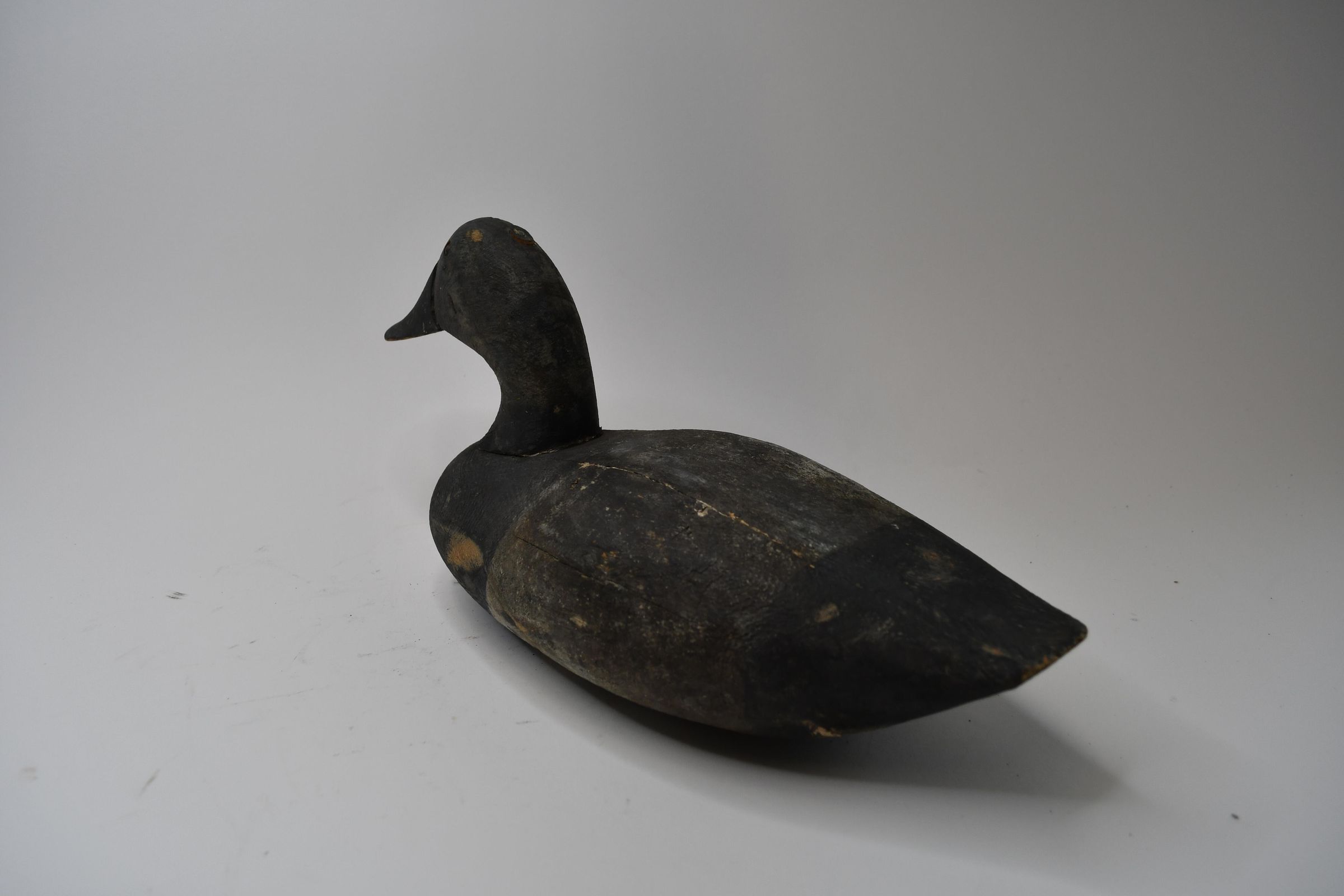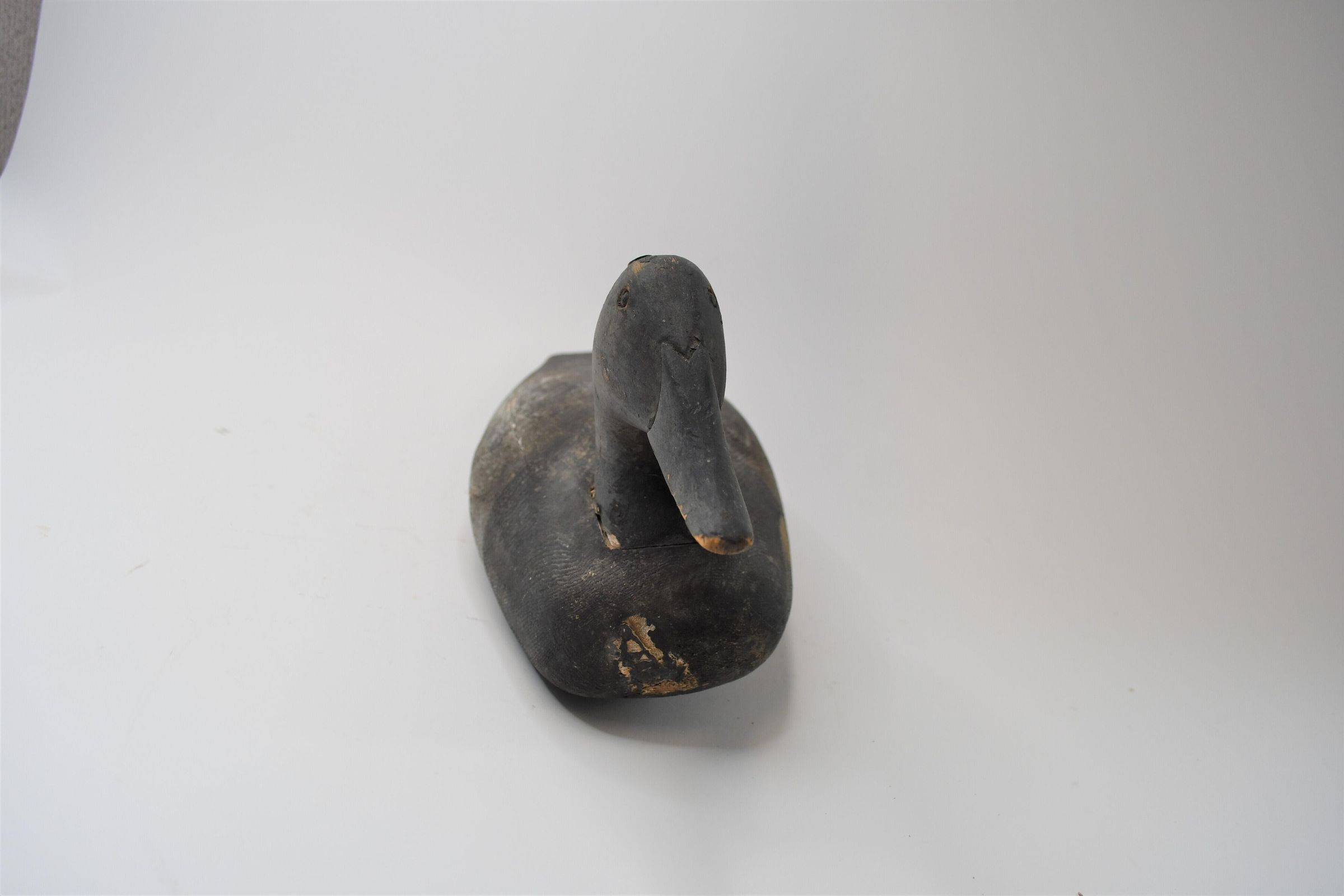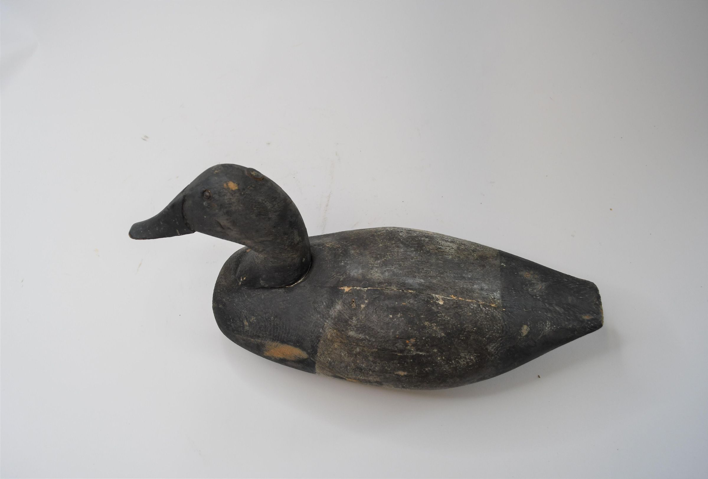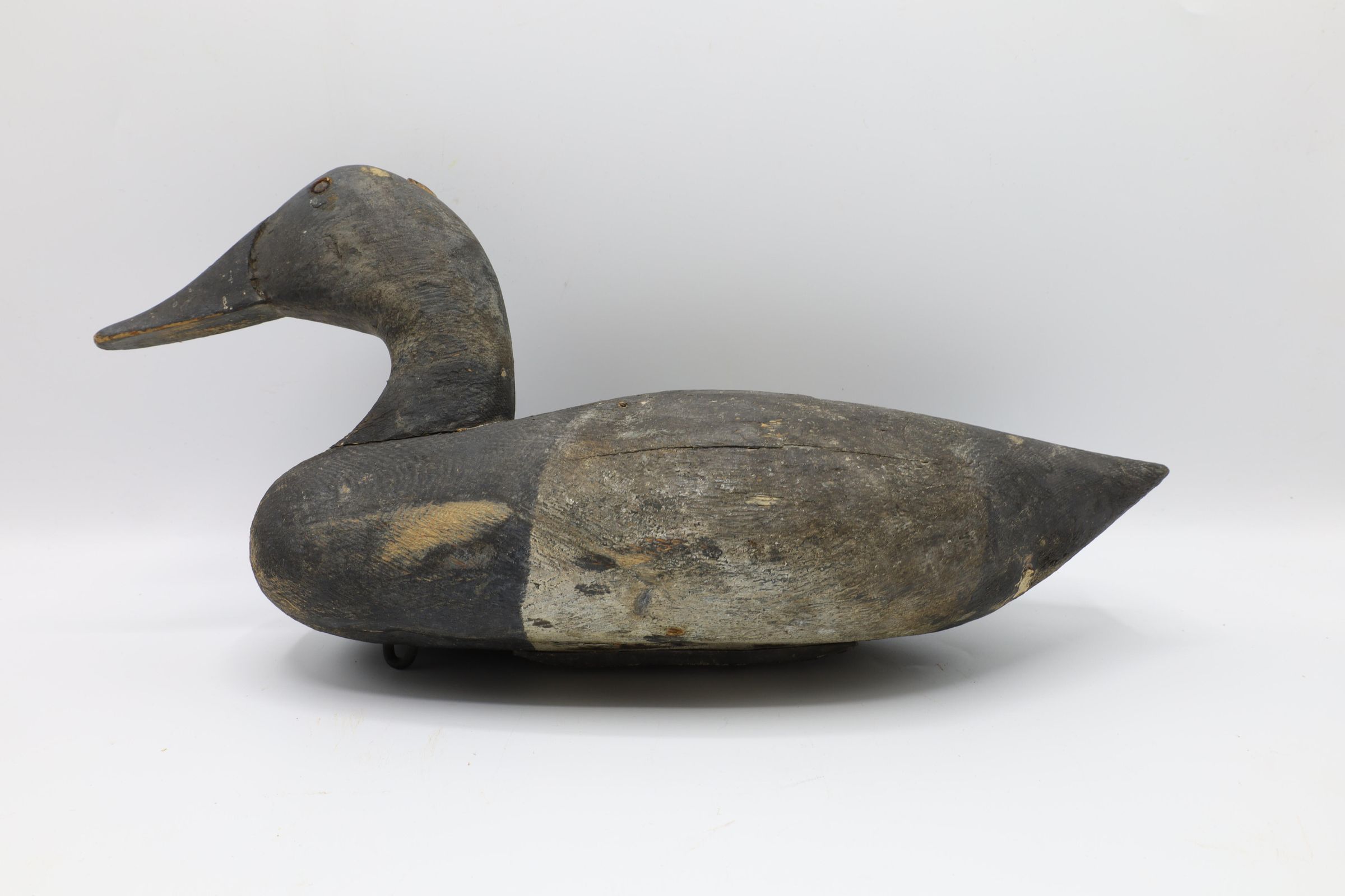 This black and white decoy, carved from pine, dates back to the 1870s. It was used in Sandusky Bay. The head of this decoy pins onto the body. WCP is stamped on the bottom.Use