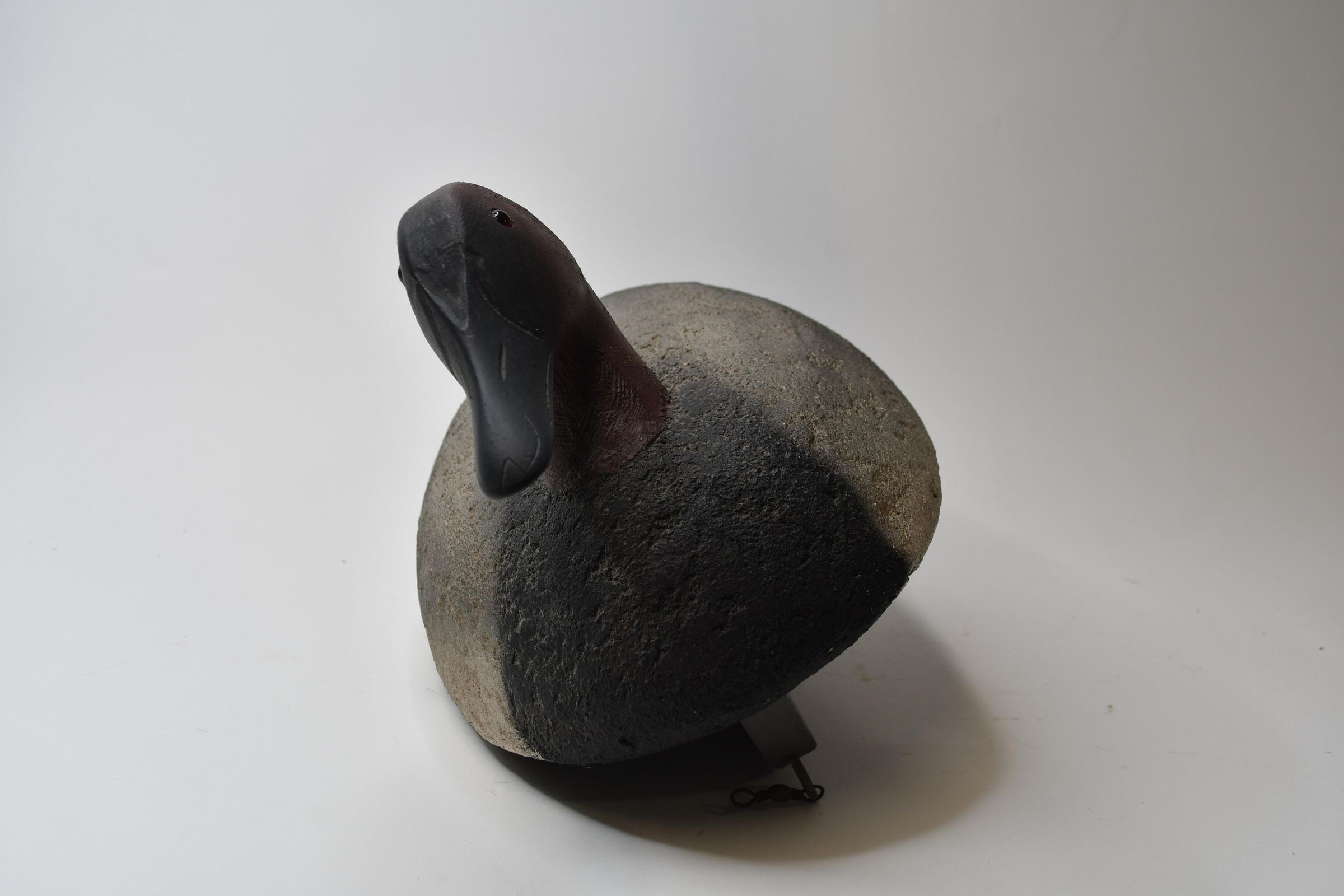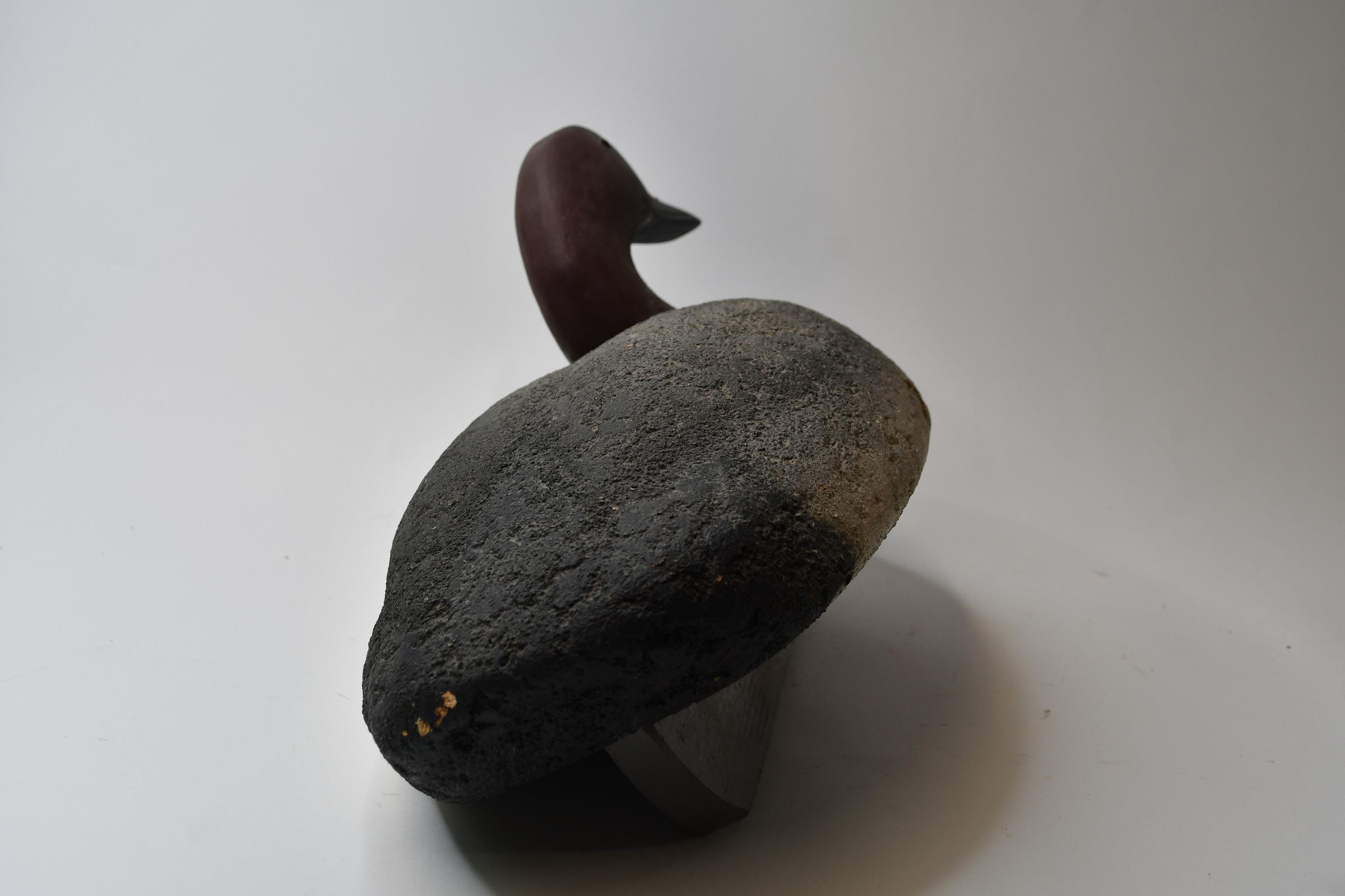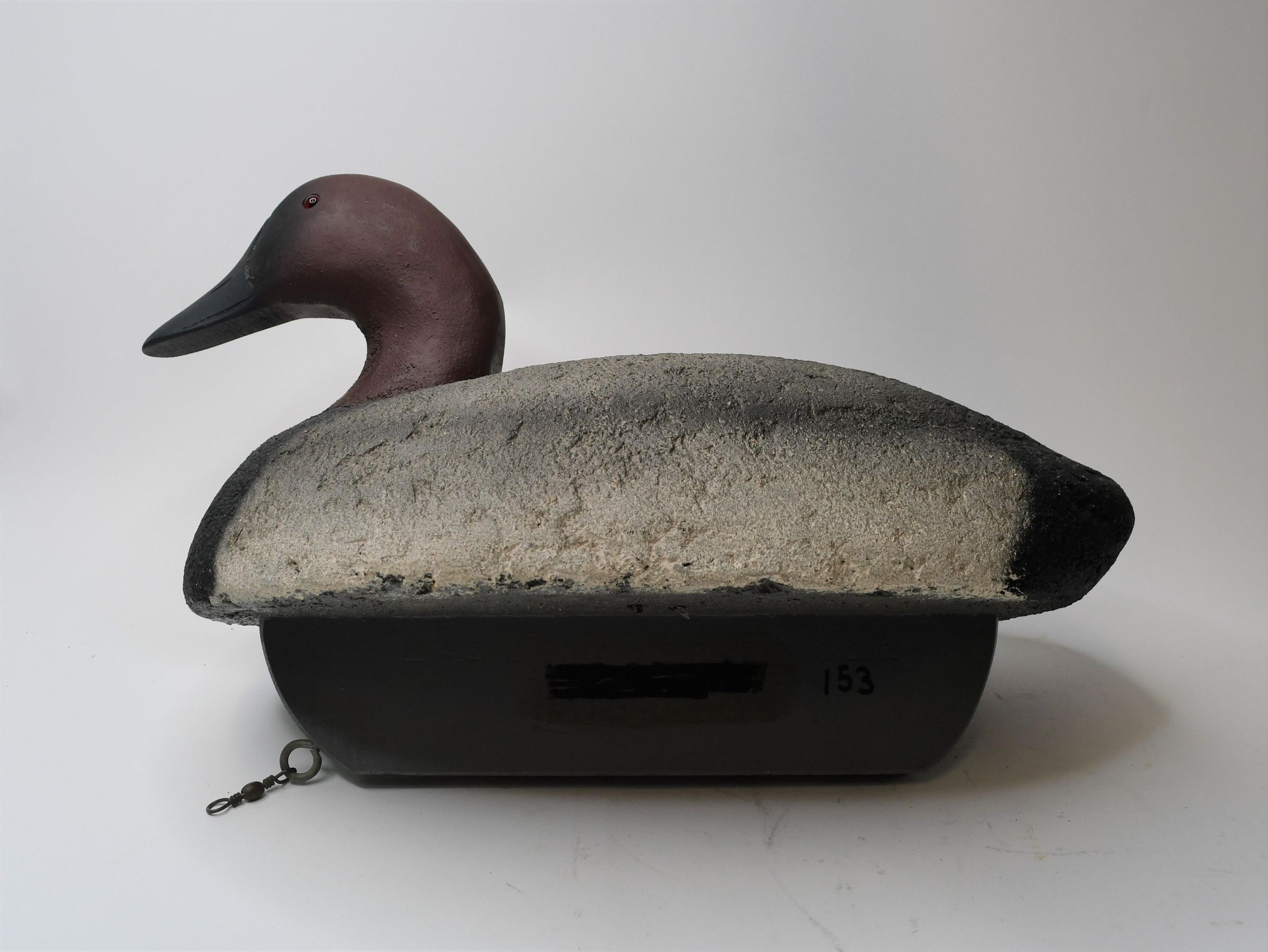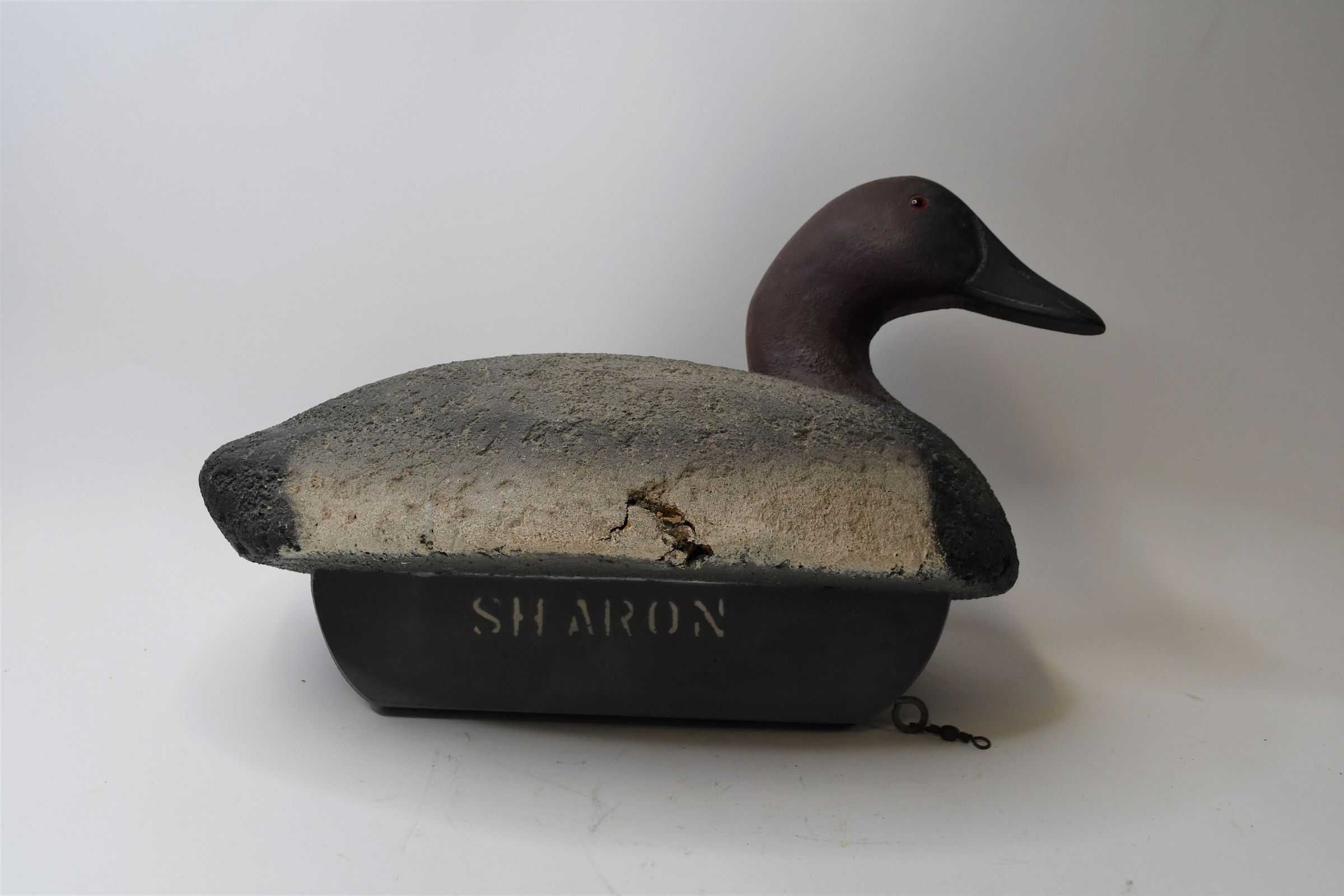 It is easy to determine this decoy was carved from cork by looking at the areas missing paint. Created by John Sharon of Oregon, Ohio in 1950, this Canvasback has a deep keel and attached swivel underneath, both essential when it was used in the waters of Lake Erie.Location