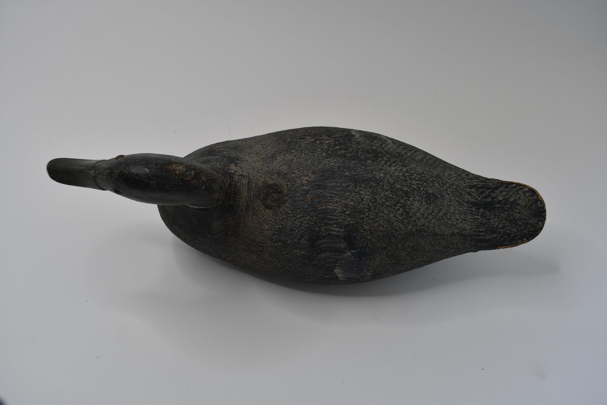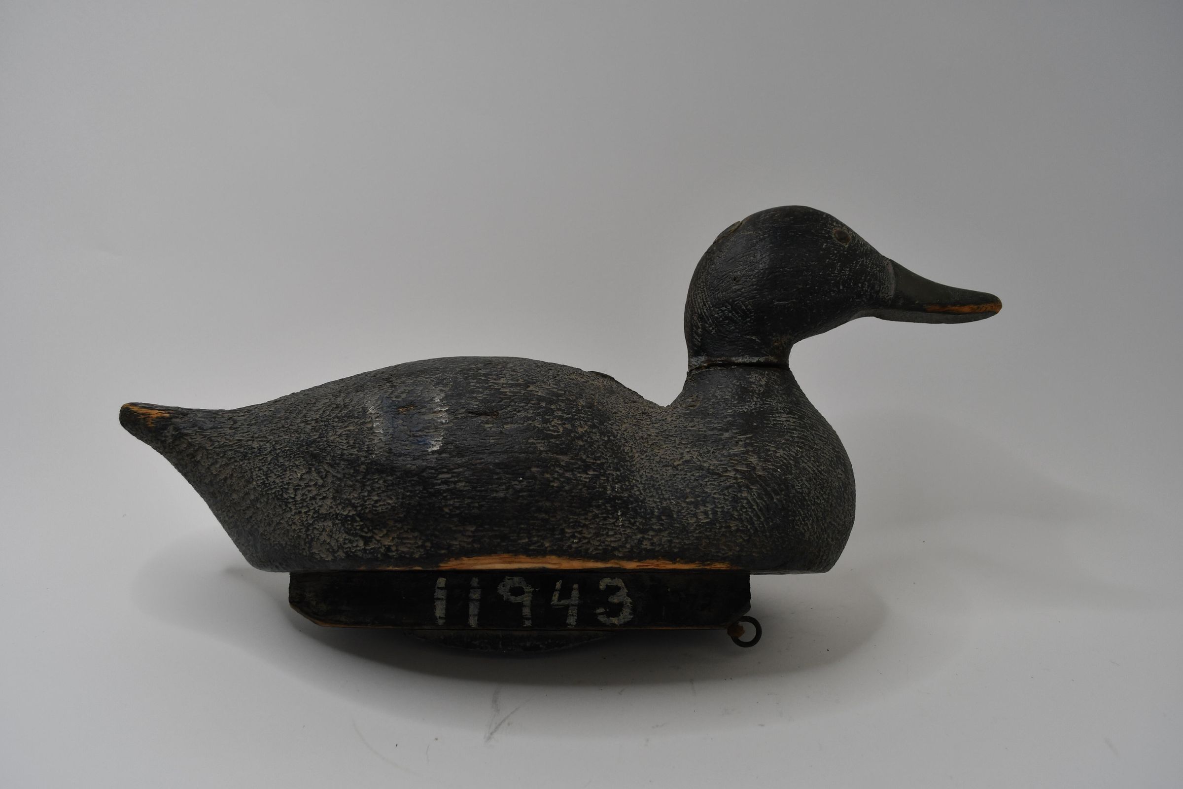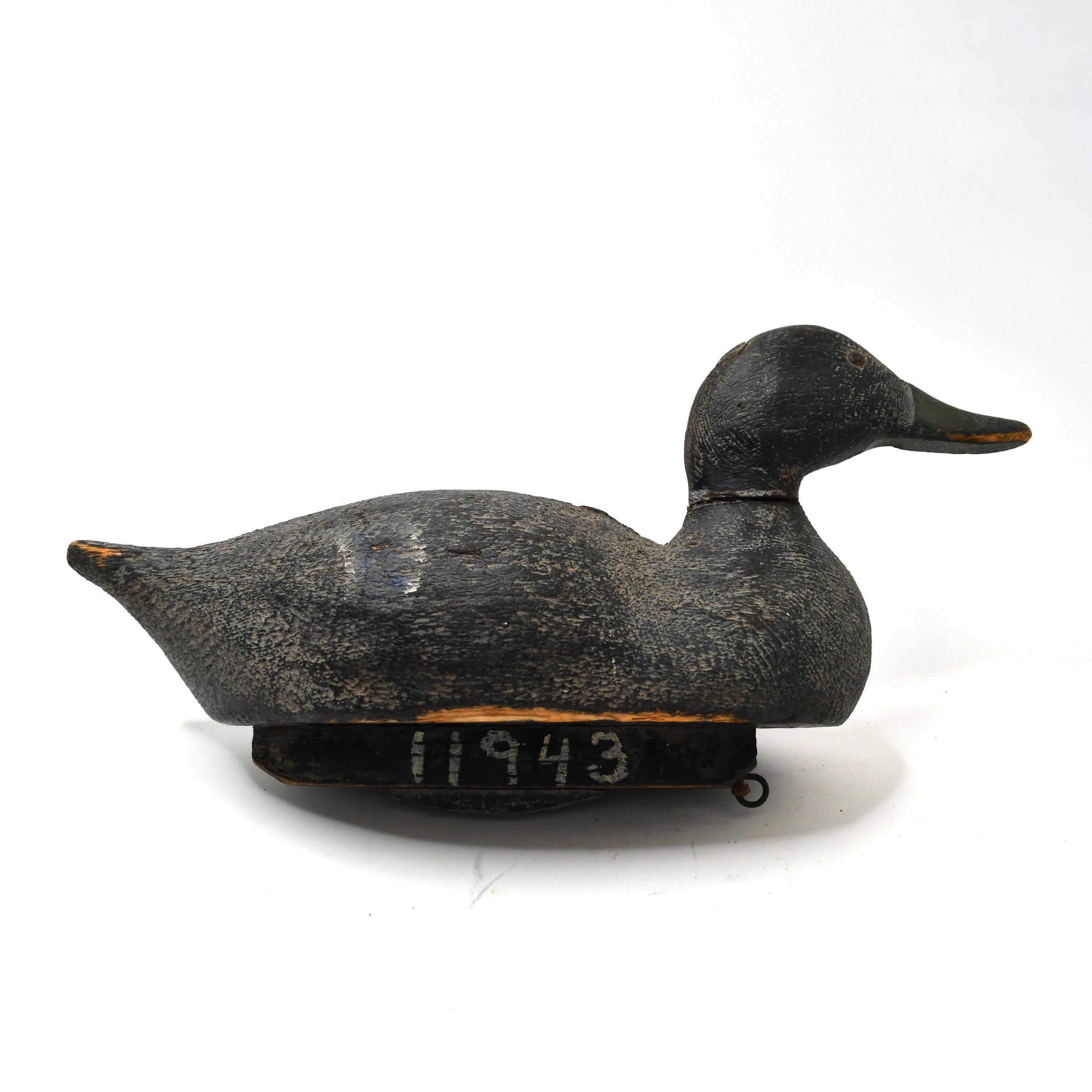 Carved in the late 1930s, the paint on this decoy has darkened over time, leaving only a faint white neck ring to identify this as a Mallard drake. It is carved from cedar wood and has a hollow body and lead weights on the keel.Location