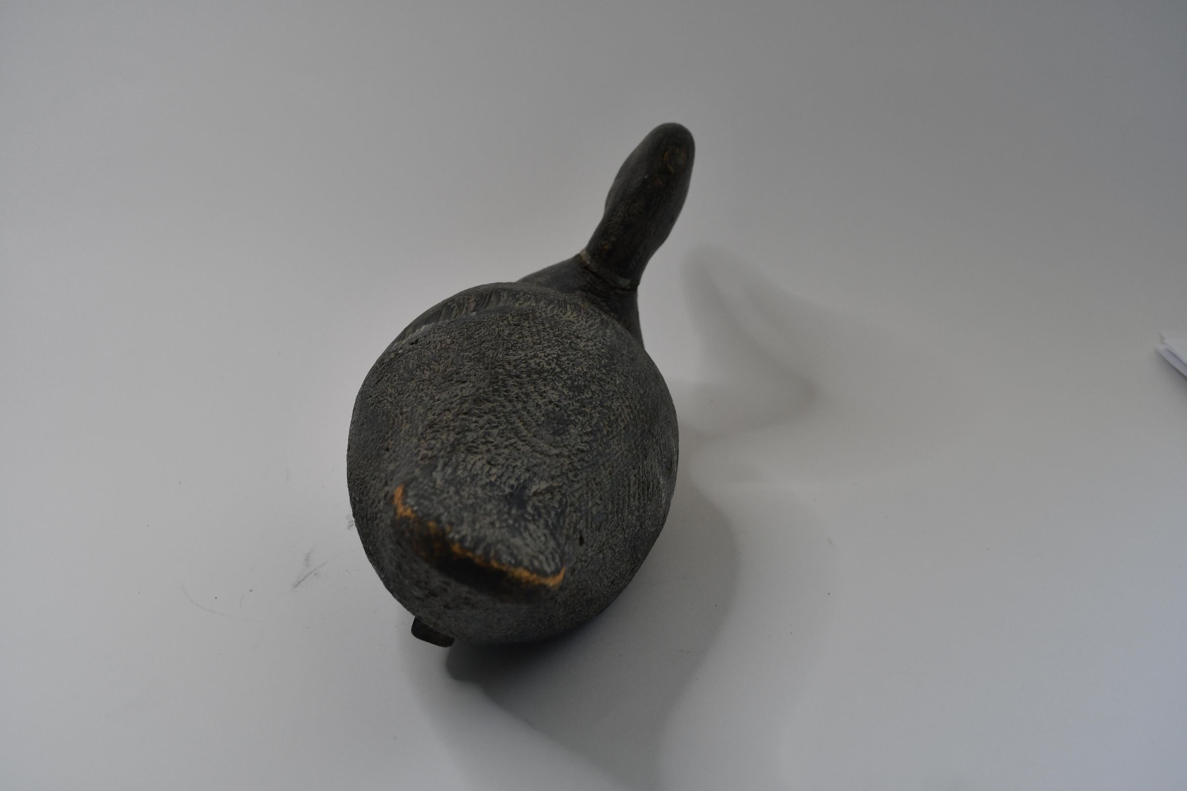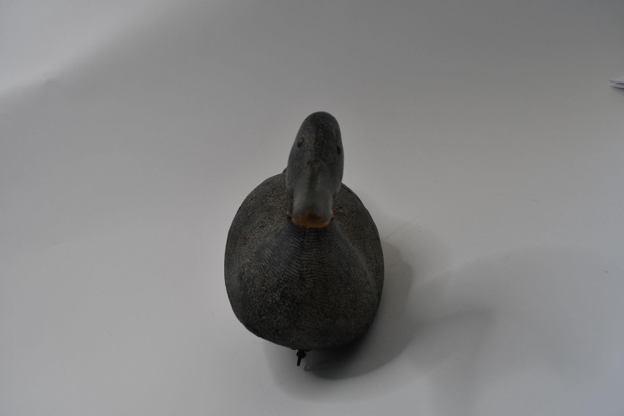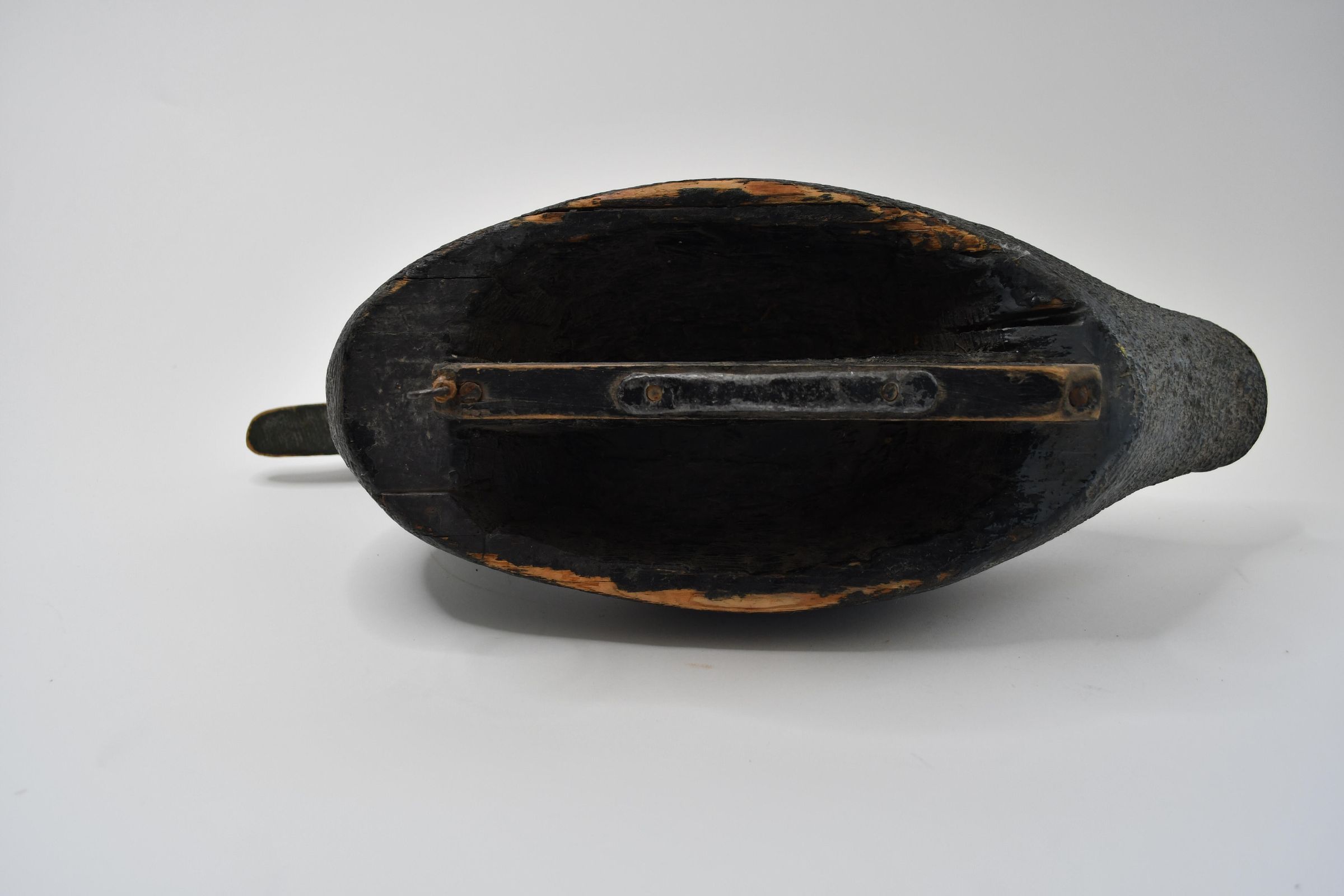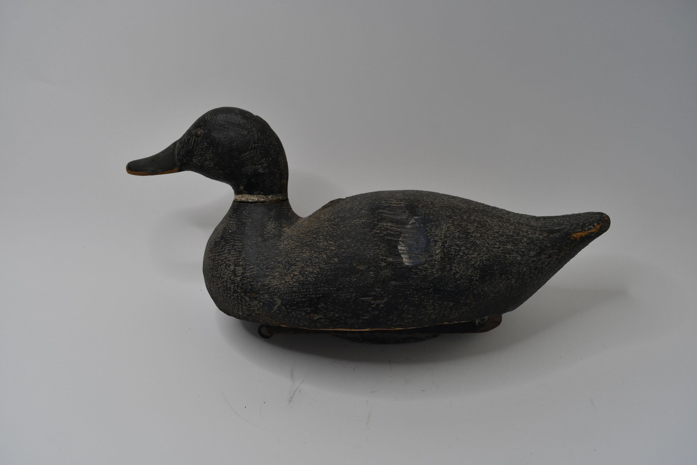 Carved in the late 1930s, the paint on this decoy has darkened over time, leaving only a faint white neck ring to identify this as a Mallard drake. It is carved from cedar wood and has a hollow body and lead weights on the keel.Location