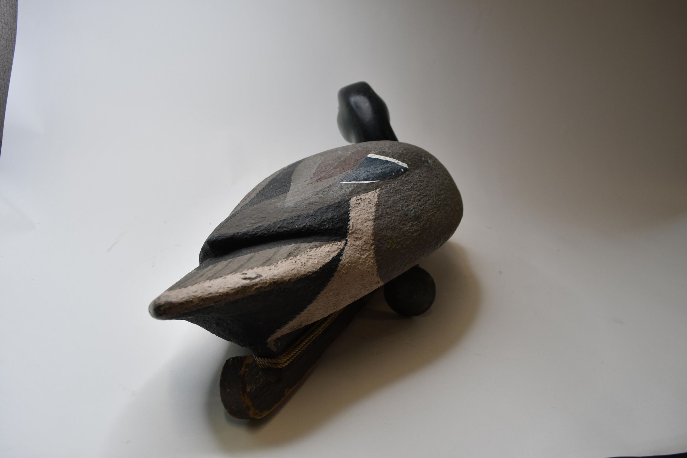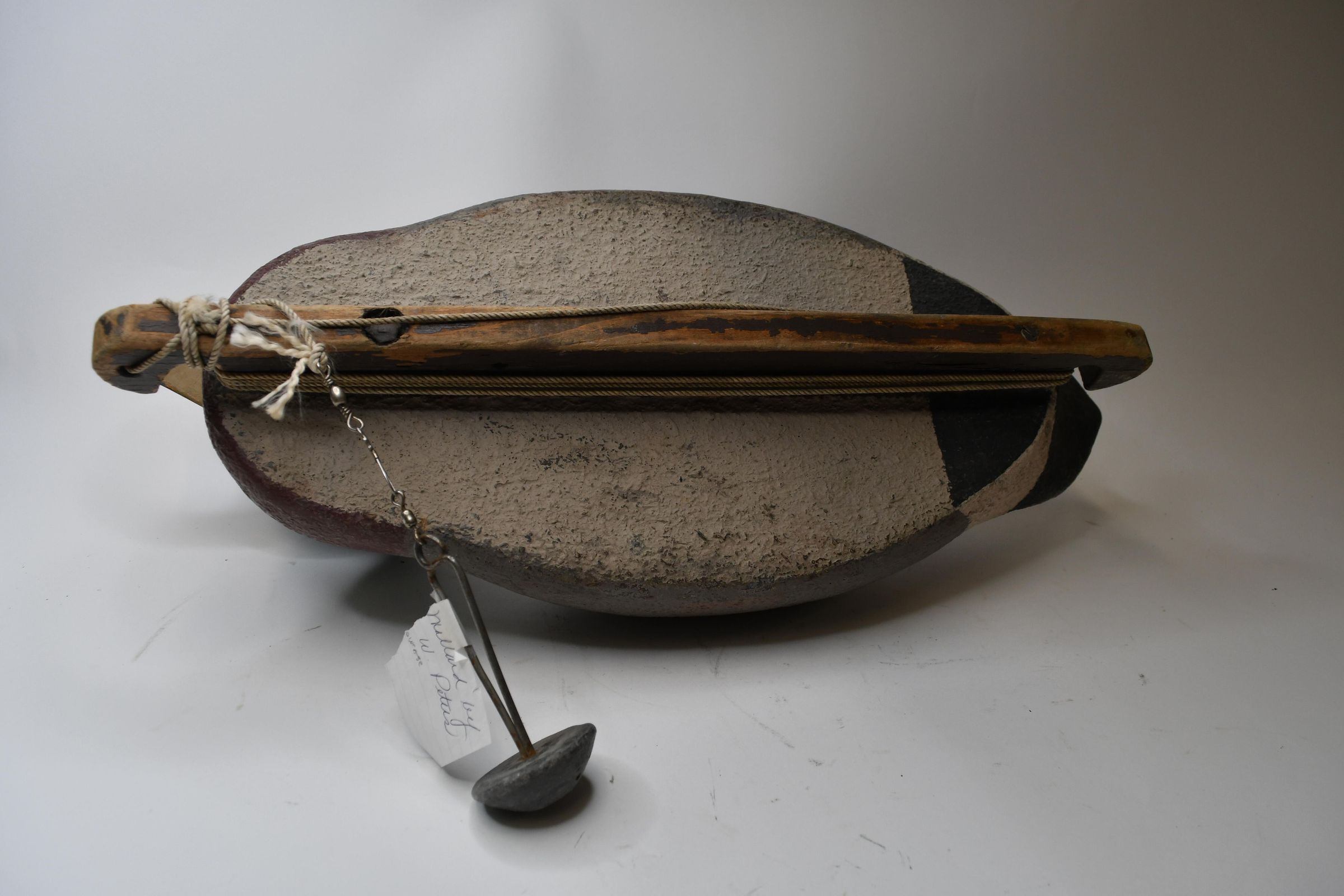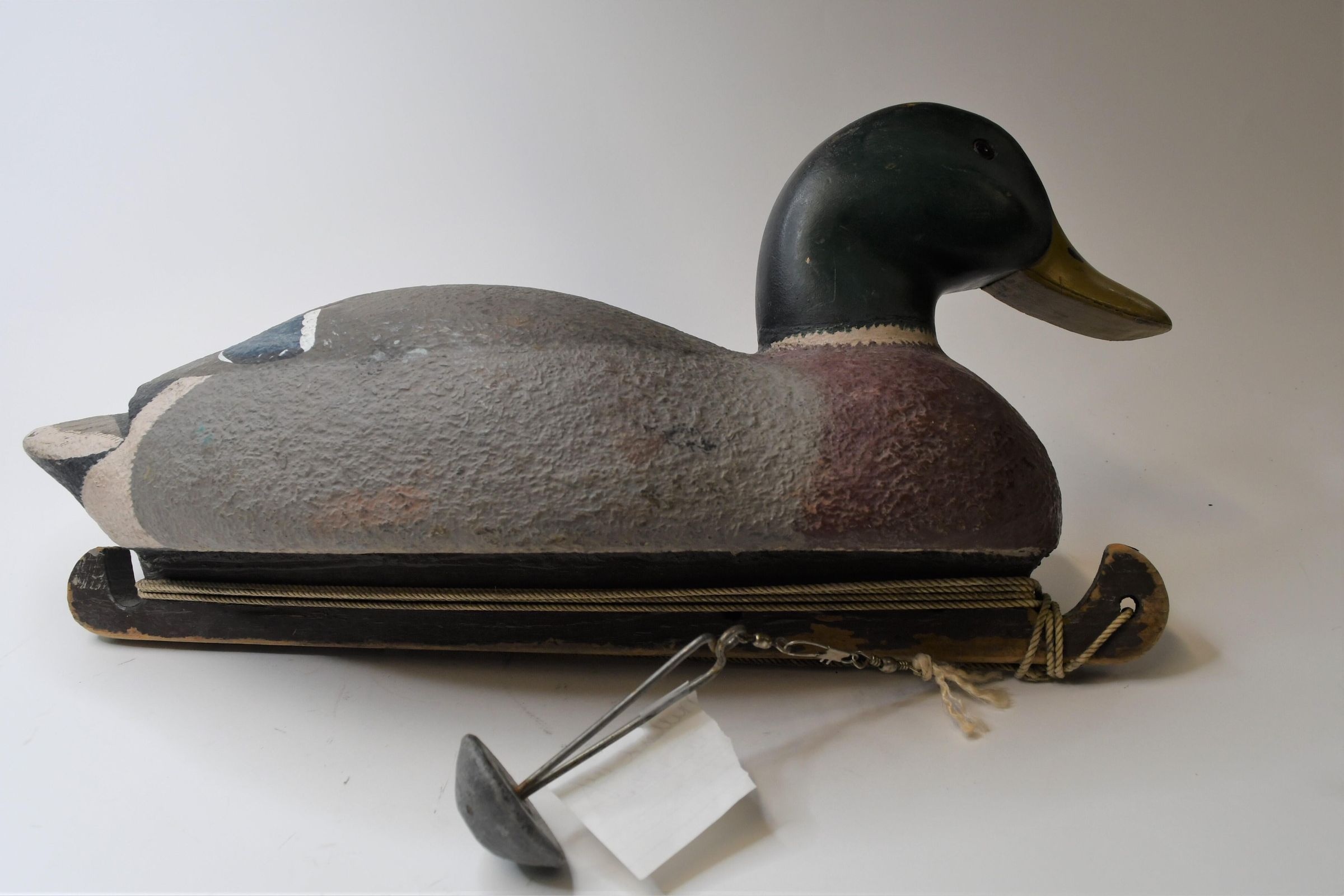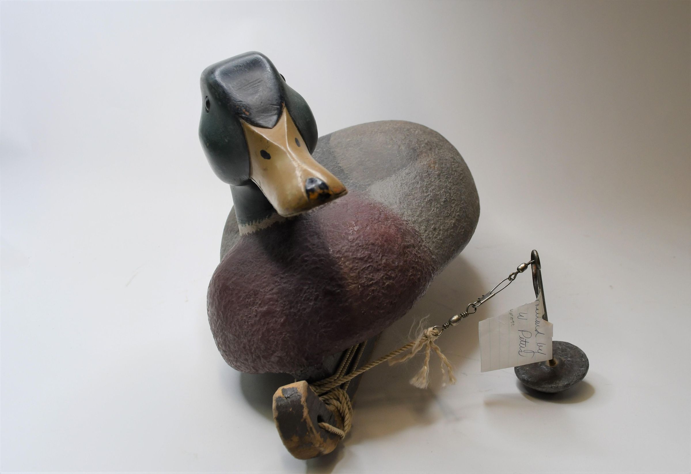 Many of the underwater features of a duck decoy are visible on this Mallard drake, carved by award winning artist Harold Peters of Toledo, Ohio. You can see the keel, or strip of stabilizing wood attached to the bottom, as well as a line attached to it, with a swivel and a lead weight just underneath the midpoint of the decoy.