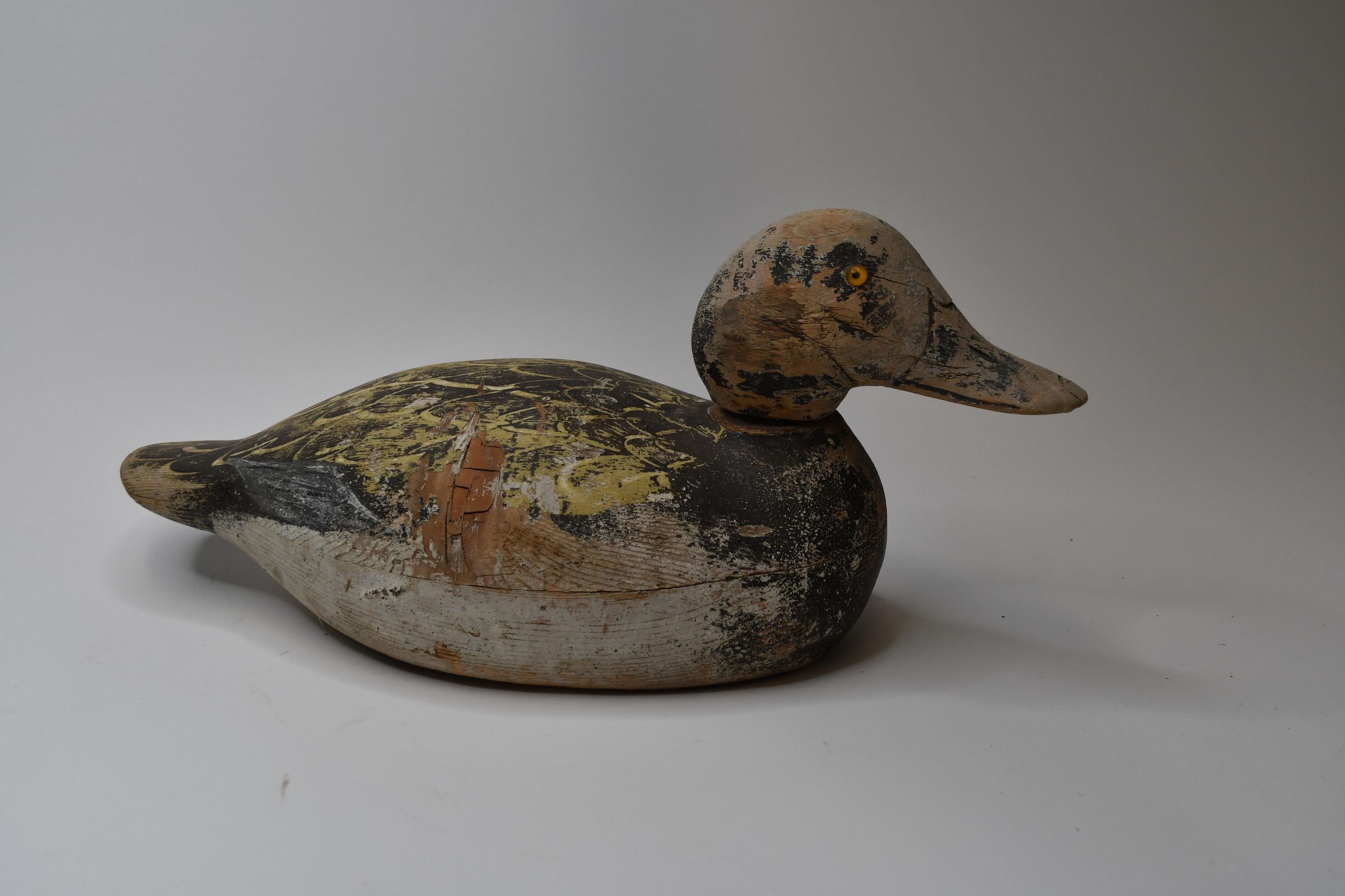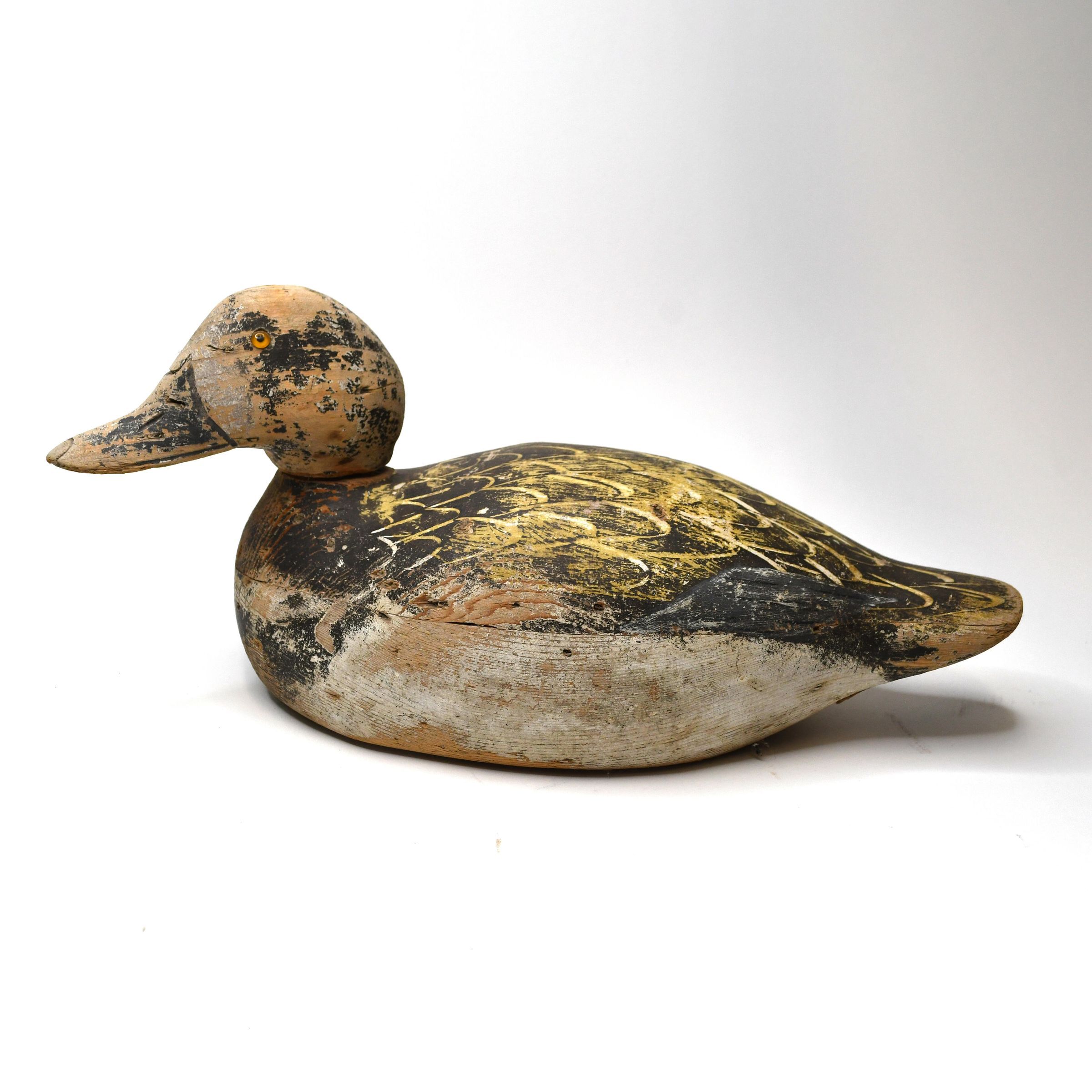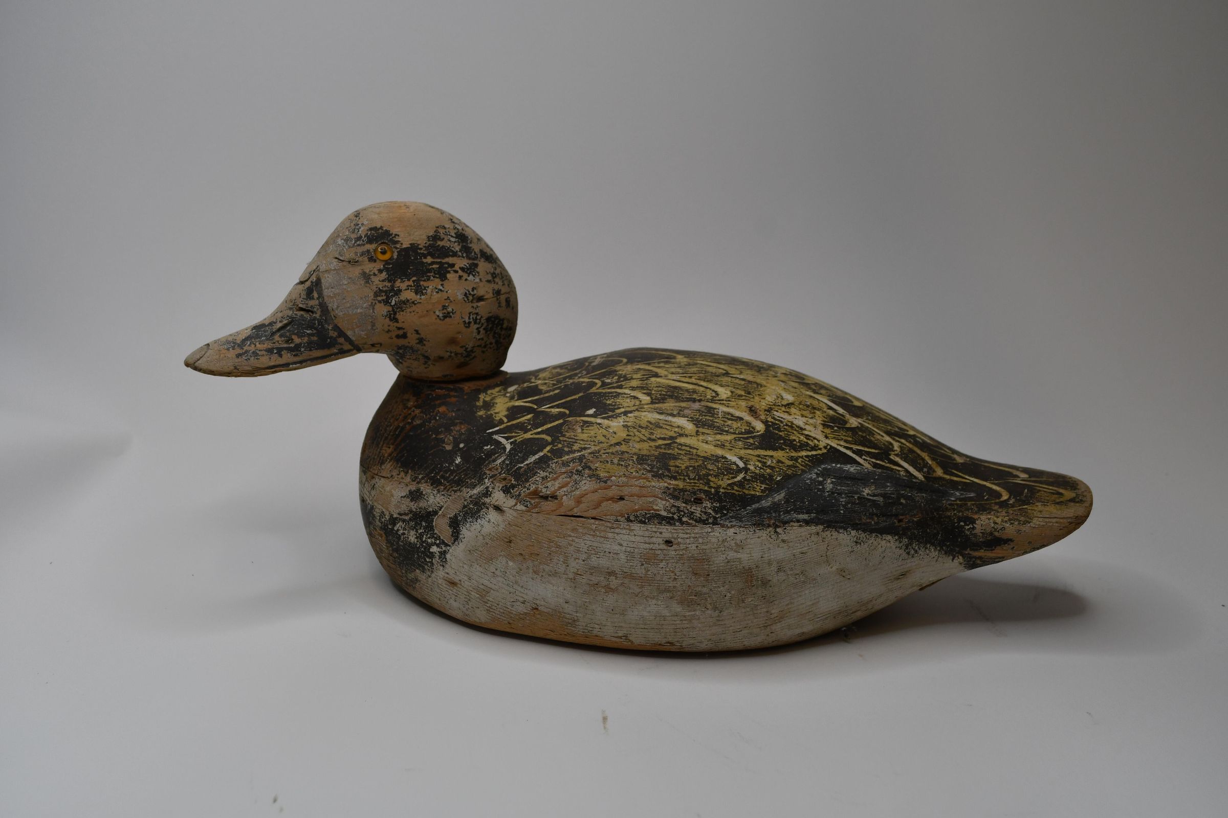 Both Greater and Lesser Scaup share many characteristics such as yellow eyes, bluish bill, and dark head, so it is difficult to assign this decoy to either species. The paint work on this decoy has been retouched. The decoy was manufactured by Wm. E. Pratt, Mfg of Joliet, Illinois. Although they originally produced screw jacks, Pratt began manufacturing decoys in 1920.Location
