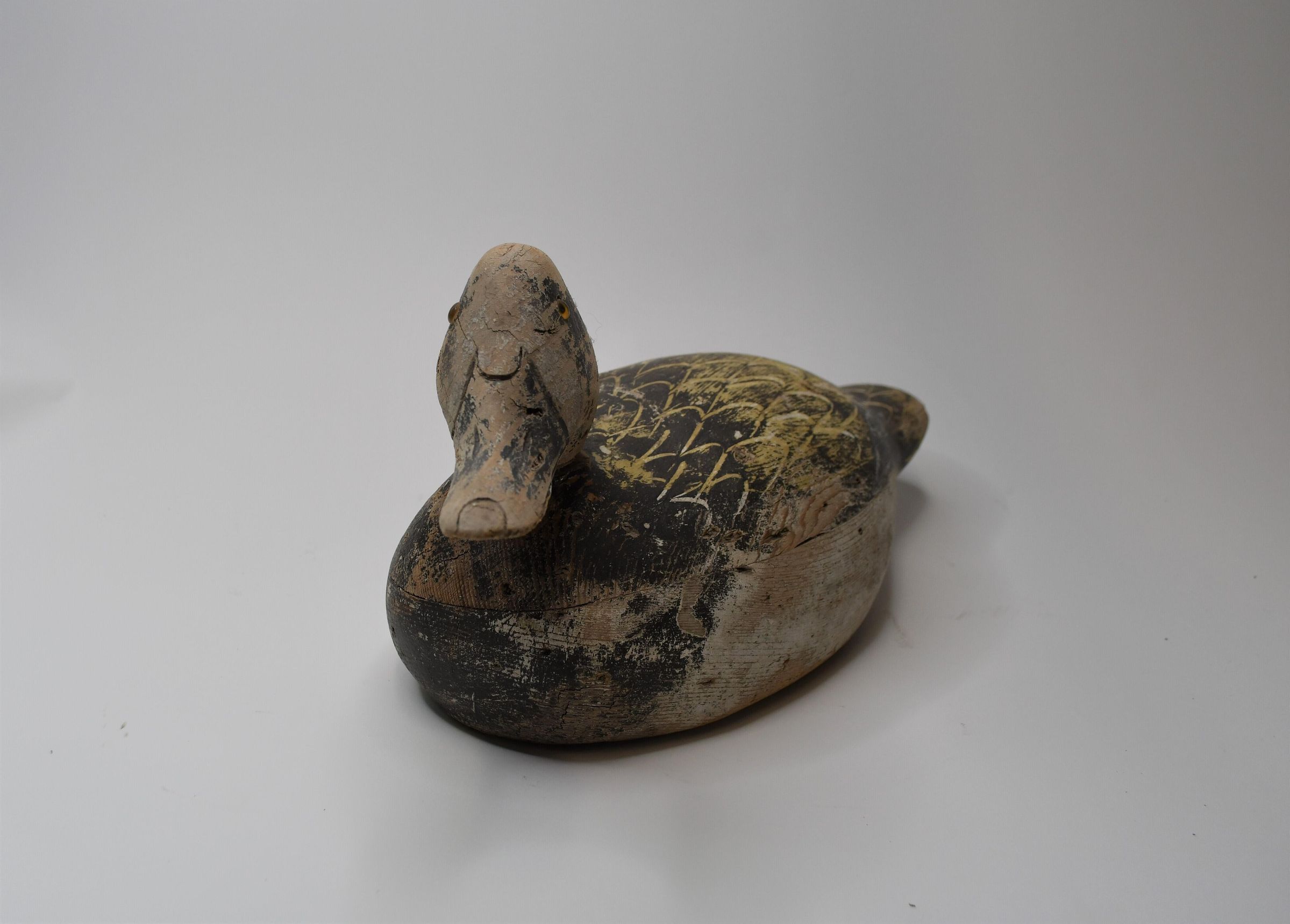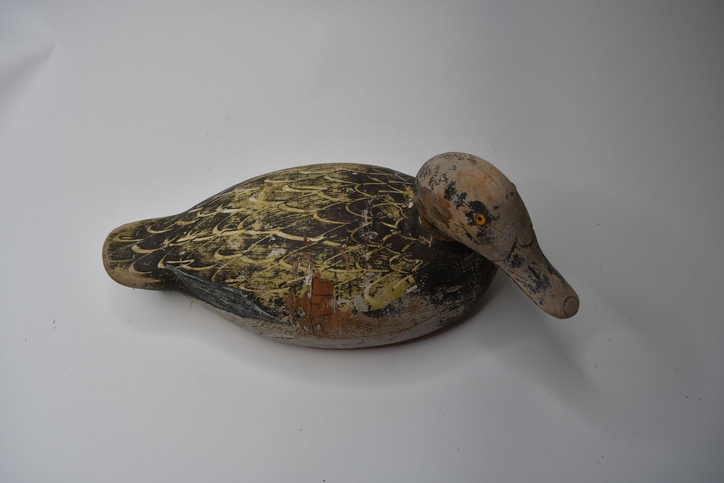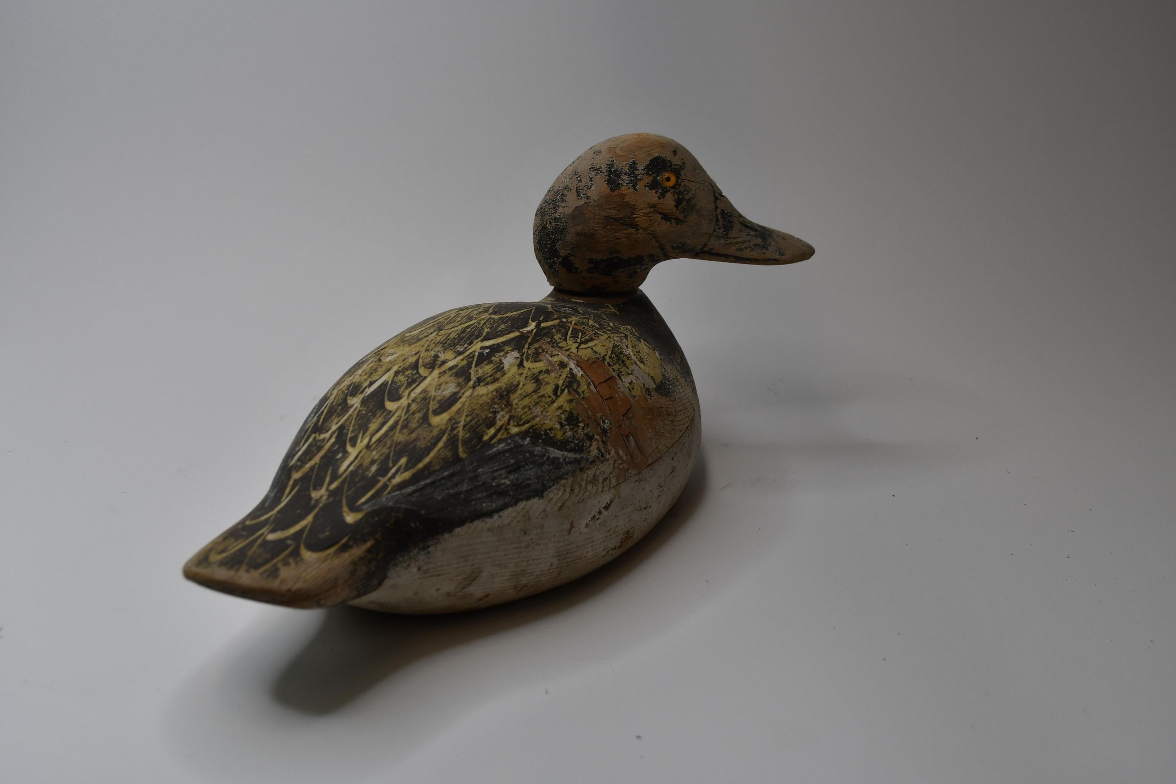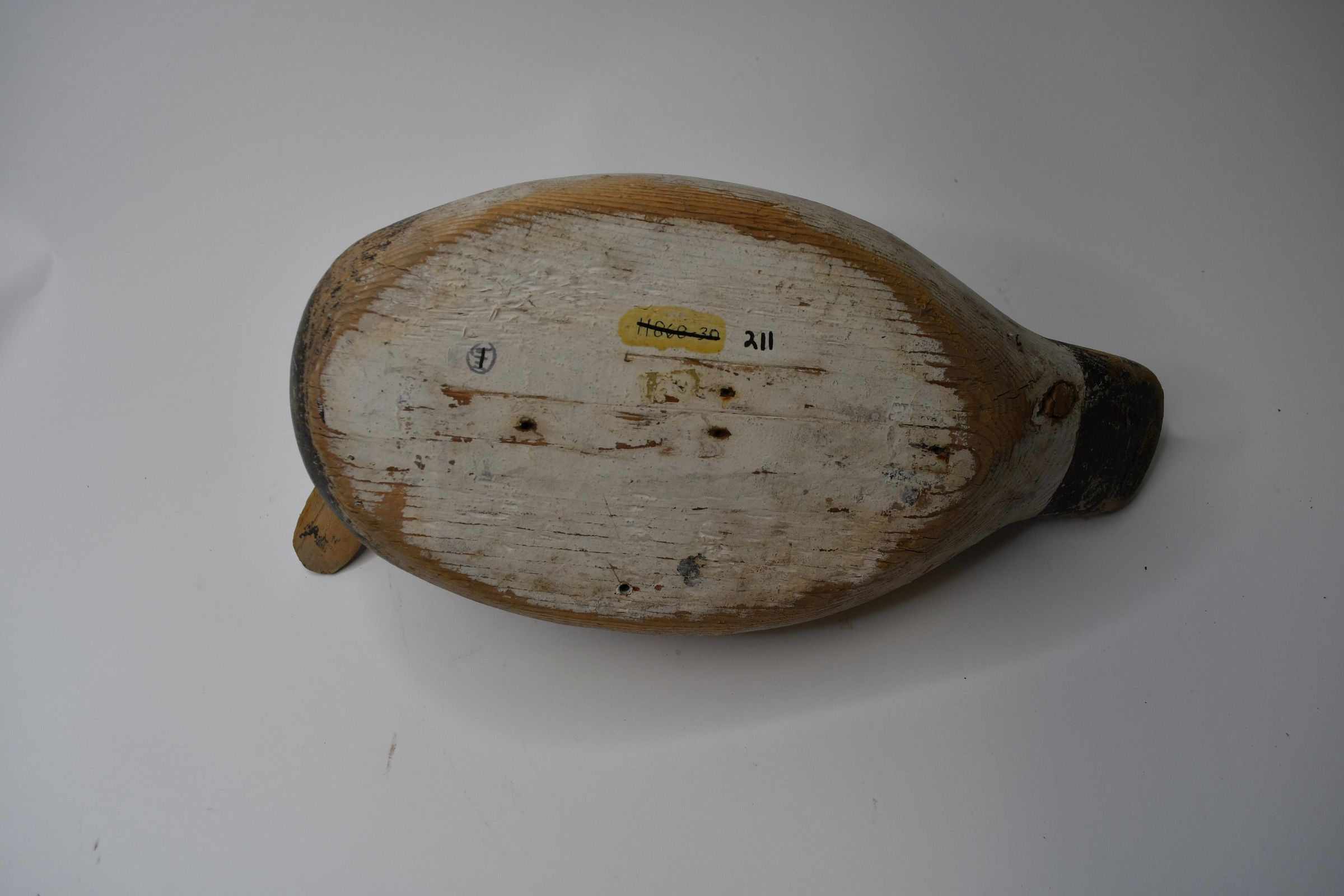 Both Greater and Lesser Scaup share many characteristics such as yellow eyes, bluish bill, and dark head, so it is difficult to assign this decoy to either species. The paint work on this decoy has been retouched. The decoy was manufactured by Wm. E. Pratt, Mfg of Joliet, Illinois. Although they originally produced screw jacks, Pratt began manufacturing decoys in 1920.Location