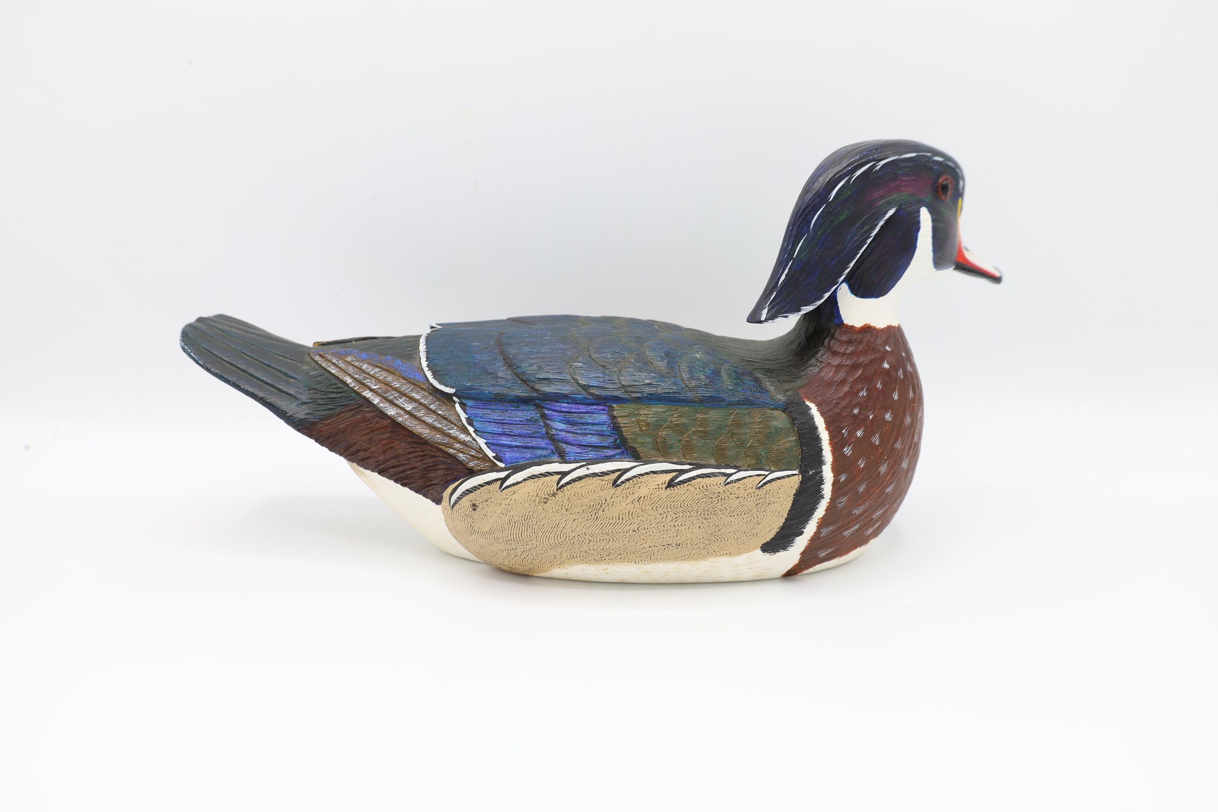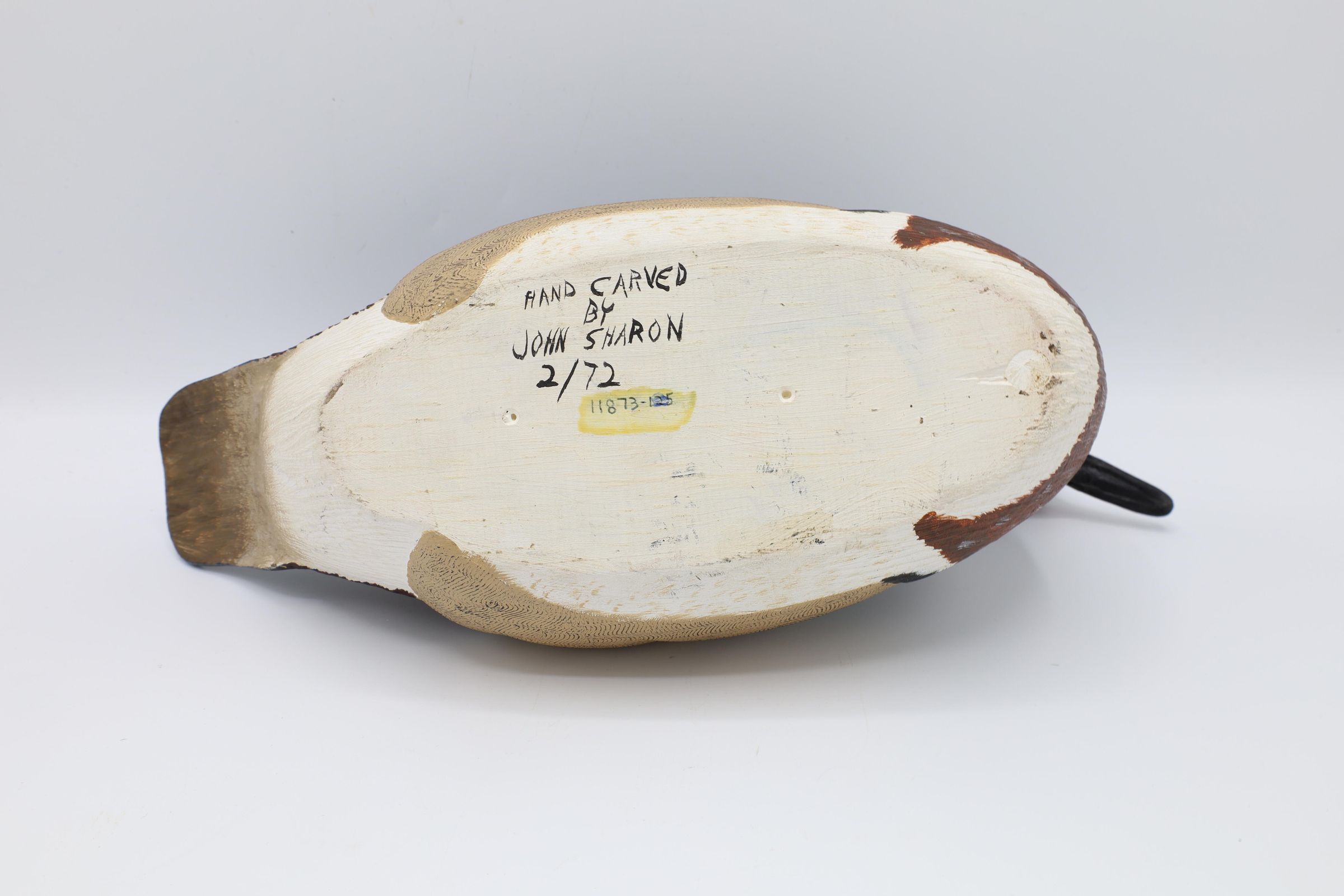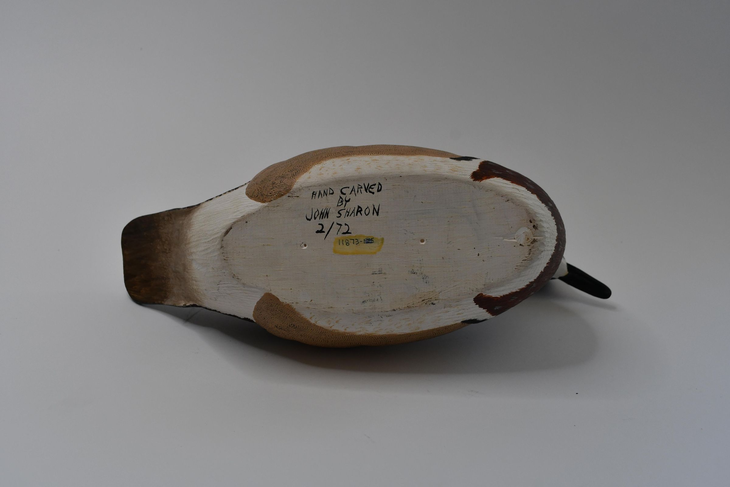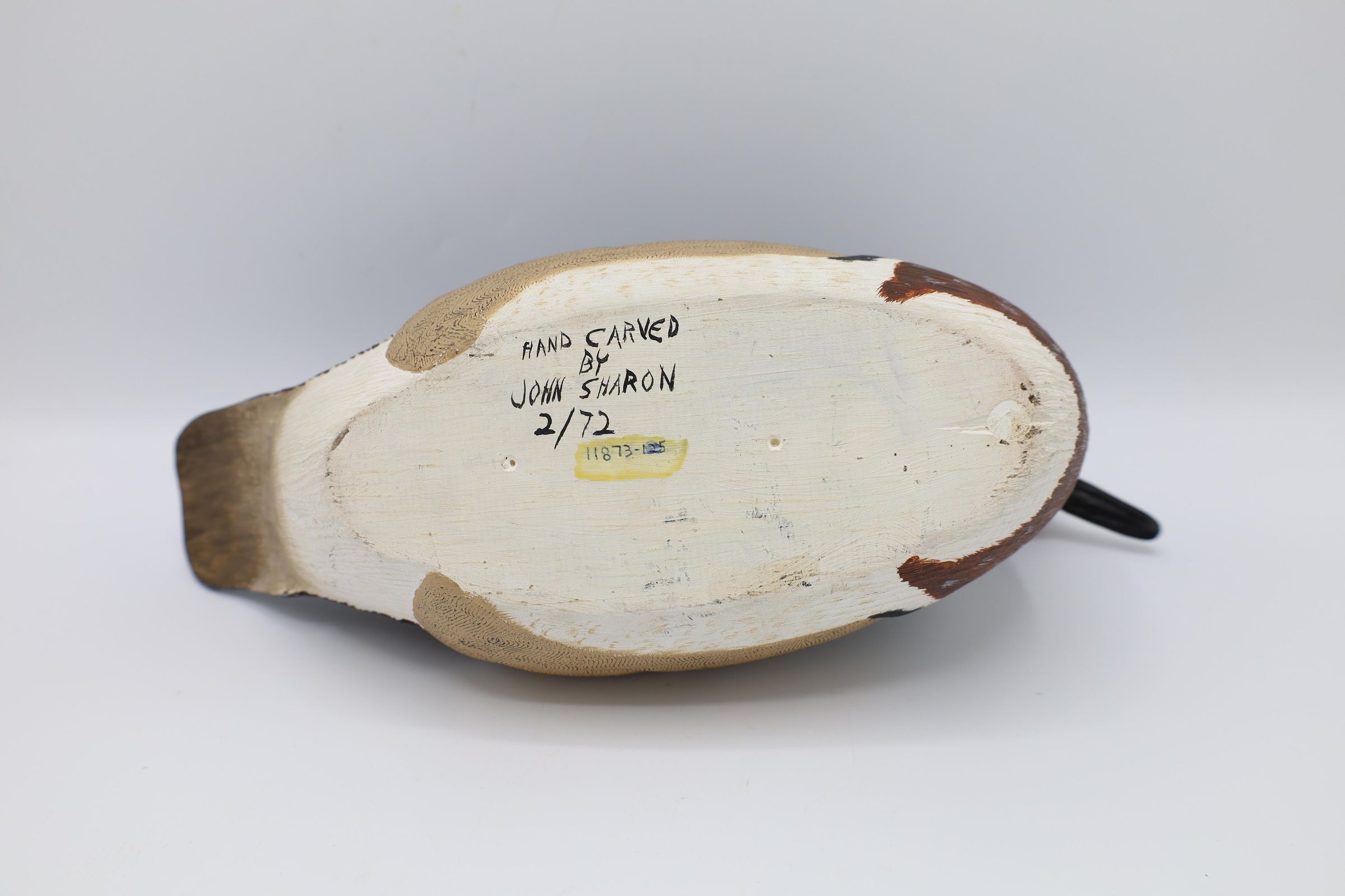 This Wood Duck decoy is an example of John Sharon's later work. Circa 1972, the decoy, carved from pine, shows significant realism and details in the carving and painting.Context